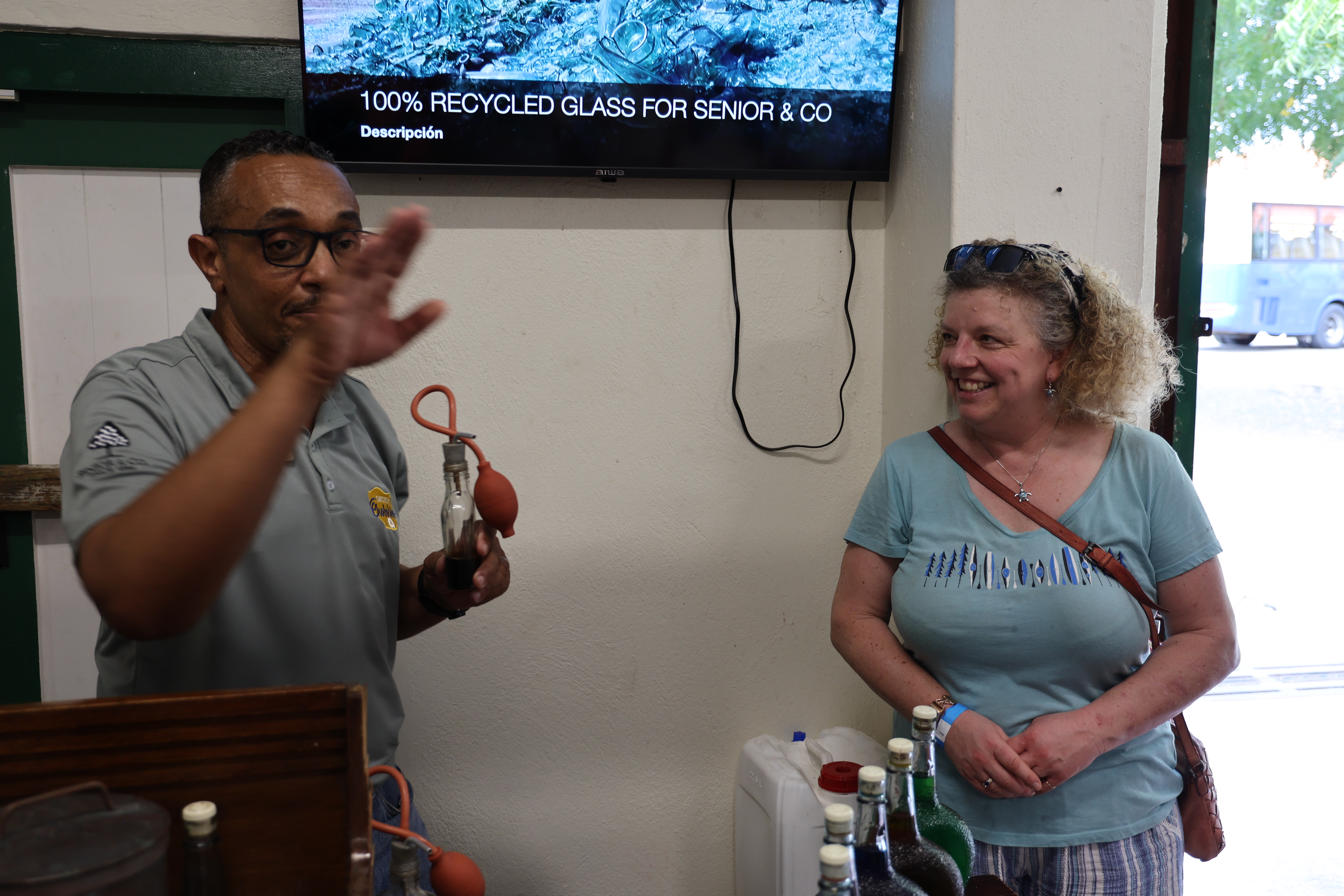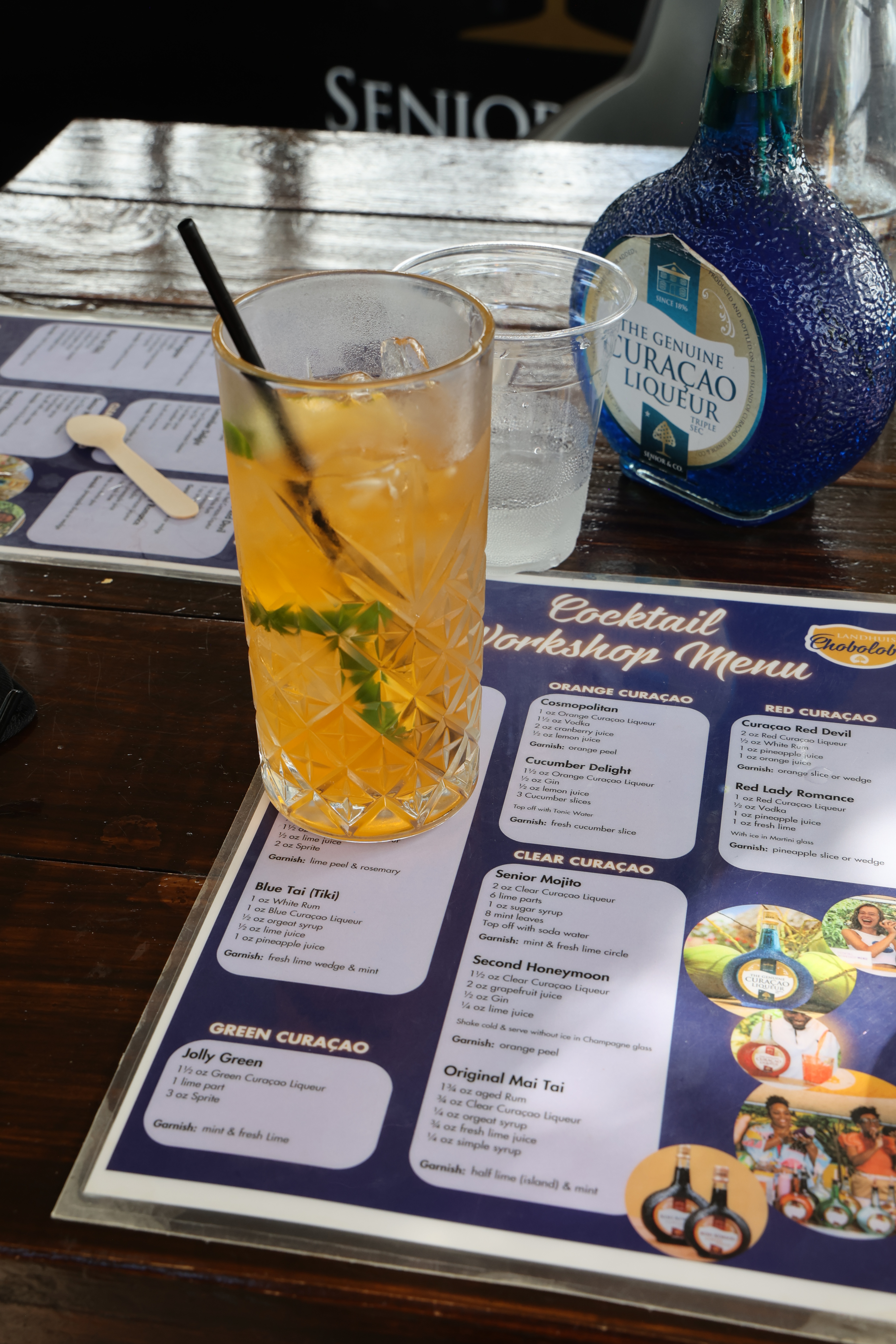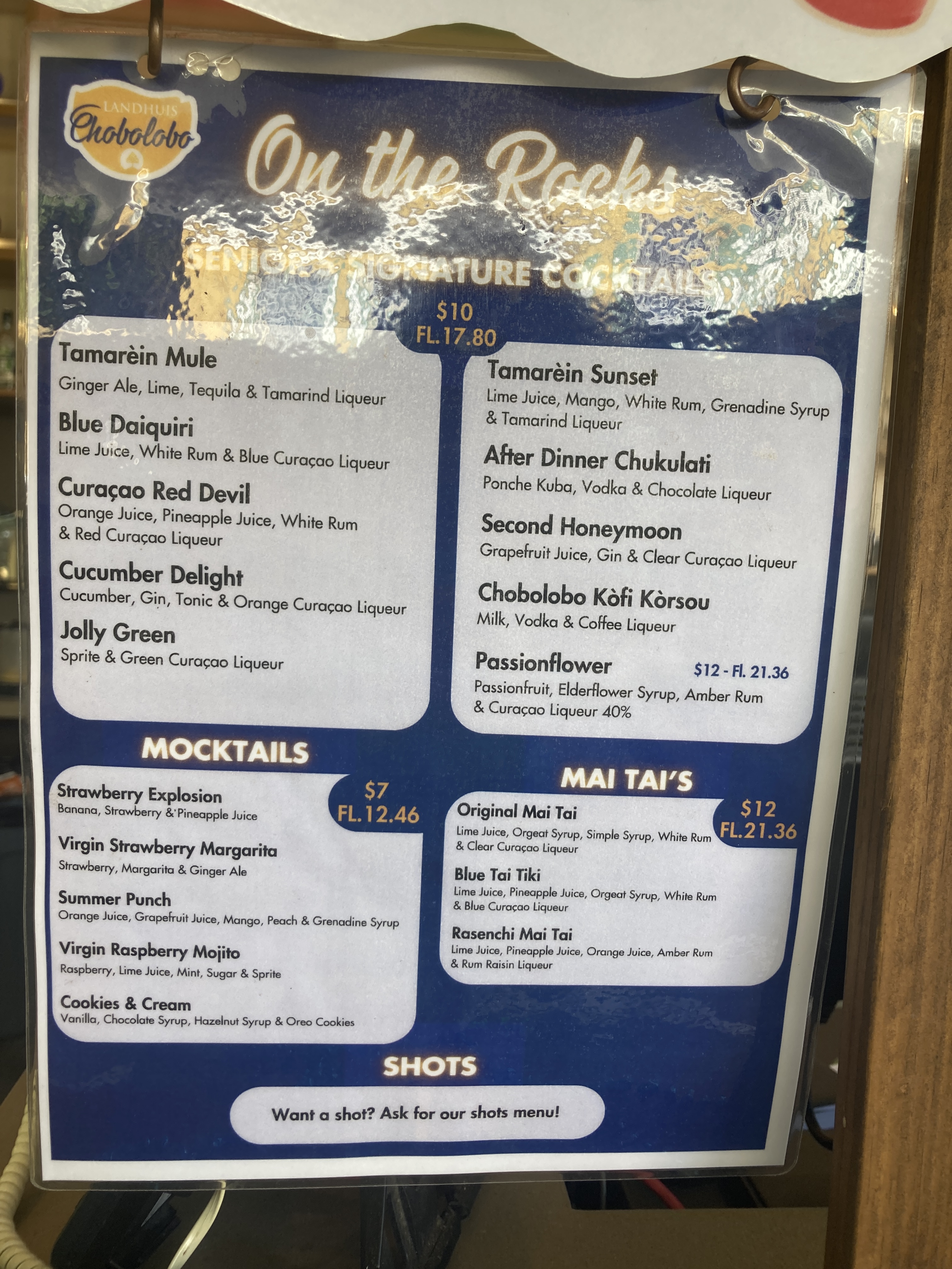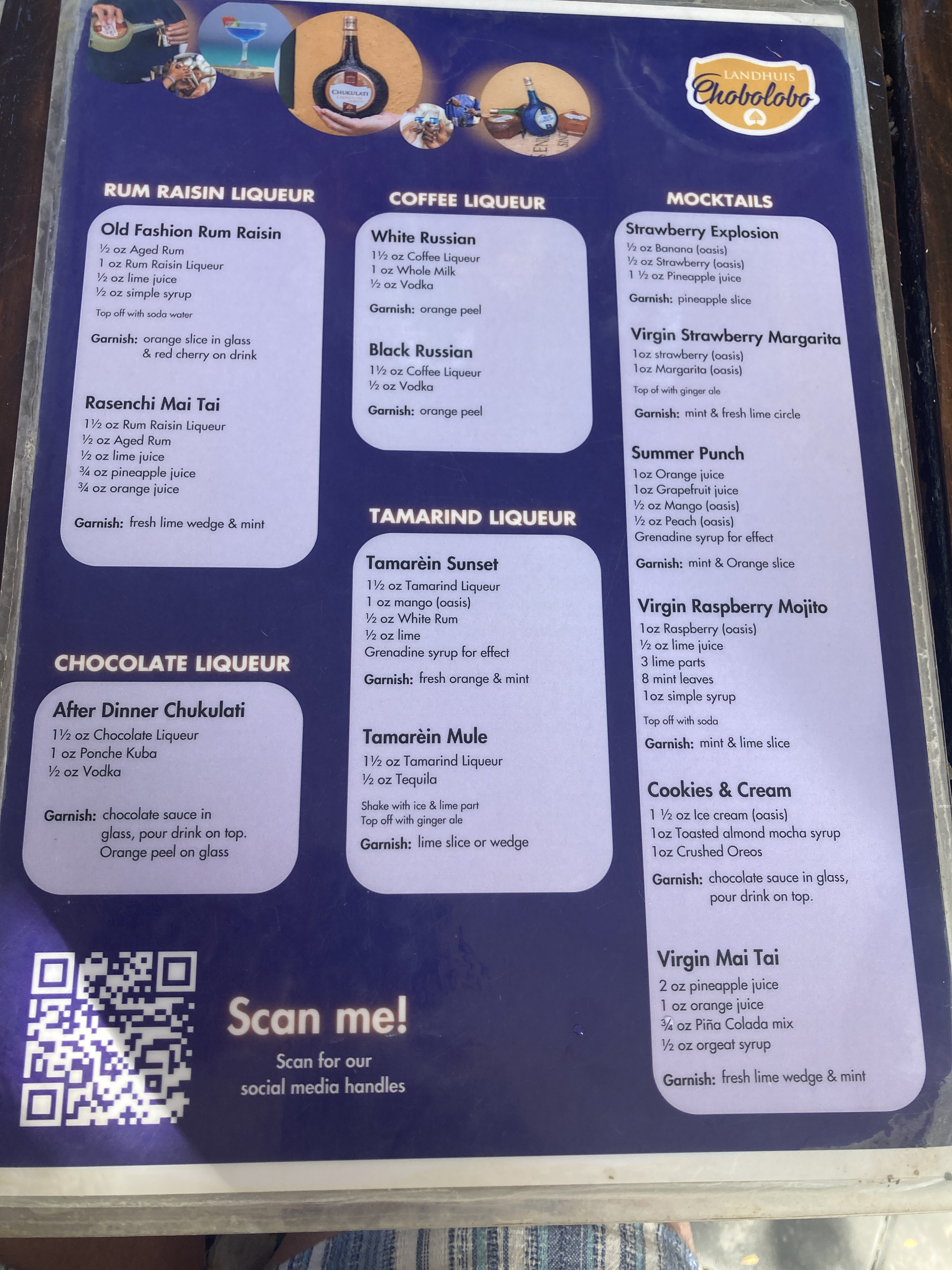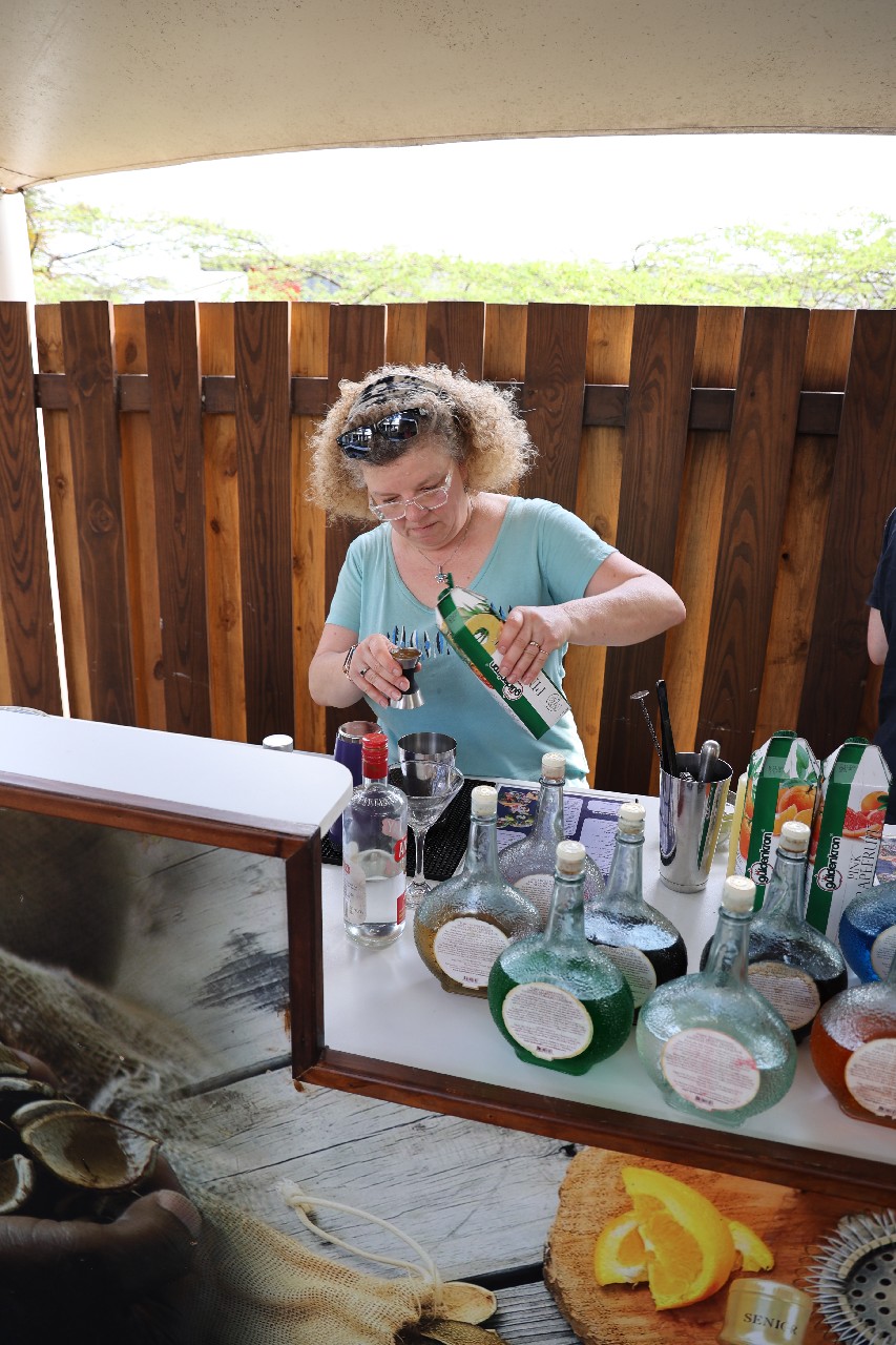 We had a 2 pm reservation at the Chobolobo Distillery, where they make the Blue Curacao liquor. We got there early, checked in, had our courtesy beverage and looked around a bit. Then we had the tour - led by Eli. He was excellent, and explained the whole process and history. The liquor is made from dried Lahara orange peels, and spices from Asia. The bottle itself is manufactured in Spain from recycled glass, made to resemble an orange in both shape and texture. The cork is made in Portugal and the seal is made in the US. The bottle labels are still stuck on by hand. But the liquor is still made in Curacao. The are multiple colors that are the same flavor, but colored differently to make different drinks. There are also additional flavors, including Chocolate, Coffee, Rum-Raisin, and Tamarind. We got to sample them all while we were there. Greta liked the tamarind and the rum-raisin the best and Mike liked the chocolate and coffee flavors. As part of our tour package, we also were presented with many different drink recipes using the Curacao liquors, and then were able to make and drink two. Our tour guide for this part was Imaisha and she was also great. She demonstrated all the tools we may need for making the drinks, how to use a mixing cup, and invited us all up to try out whatever recipes we wanted. Mike made a tamarind mule and a cucumber delight. Greta made the Red Lady Romance and the Tamarind Sunset. It was a LOT of fun! We left with a bottle of the coffee flavor liqour to have in our room.