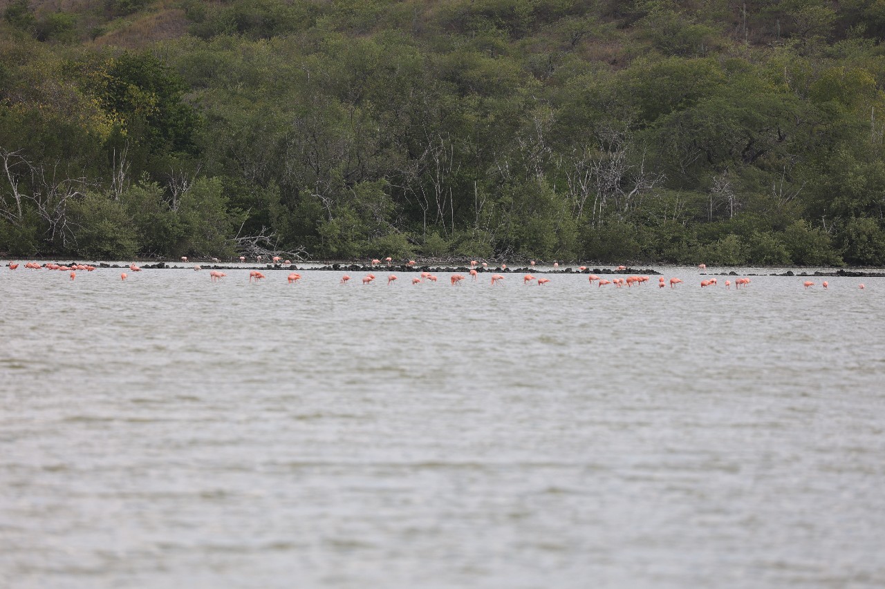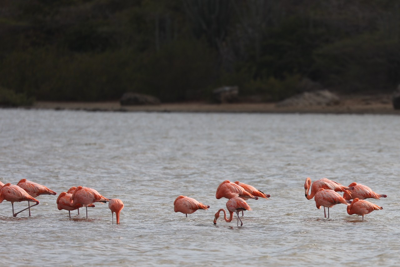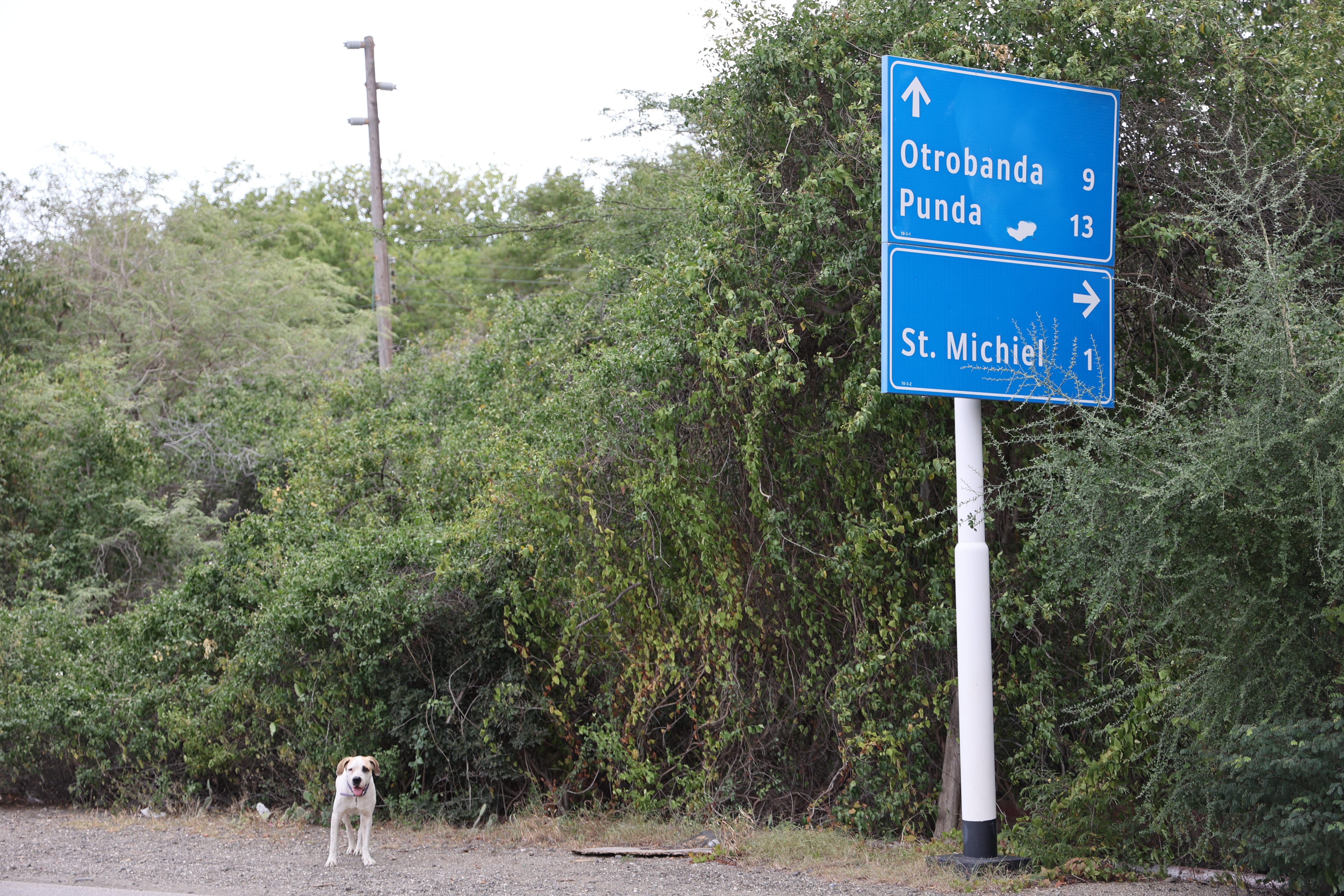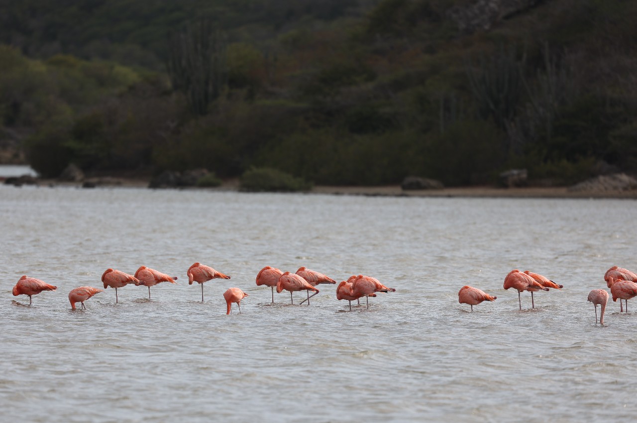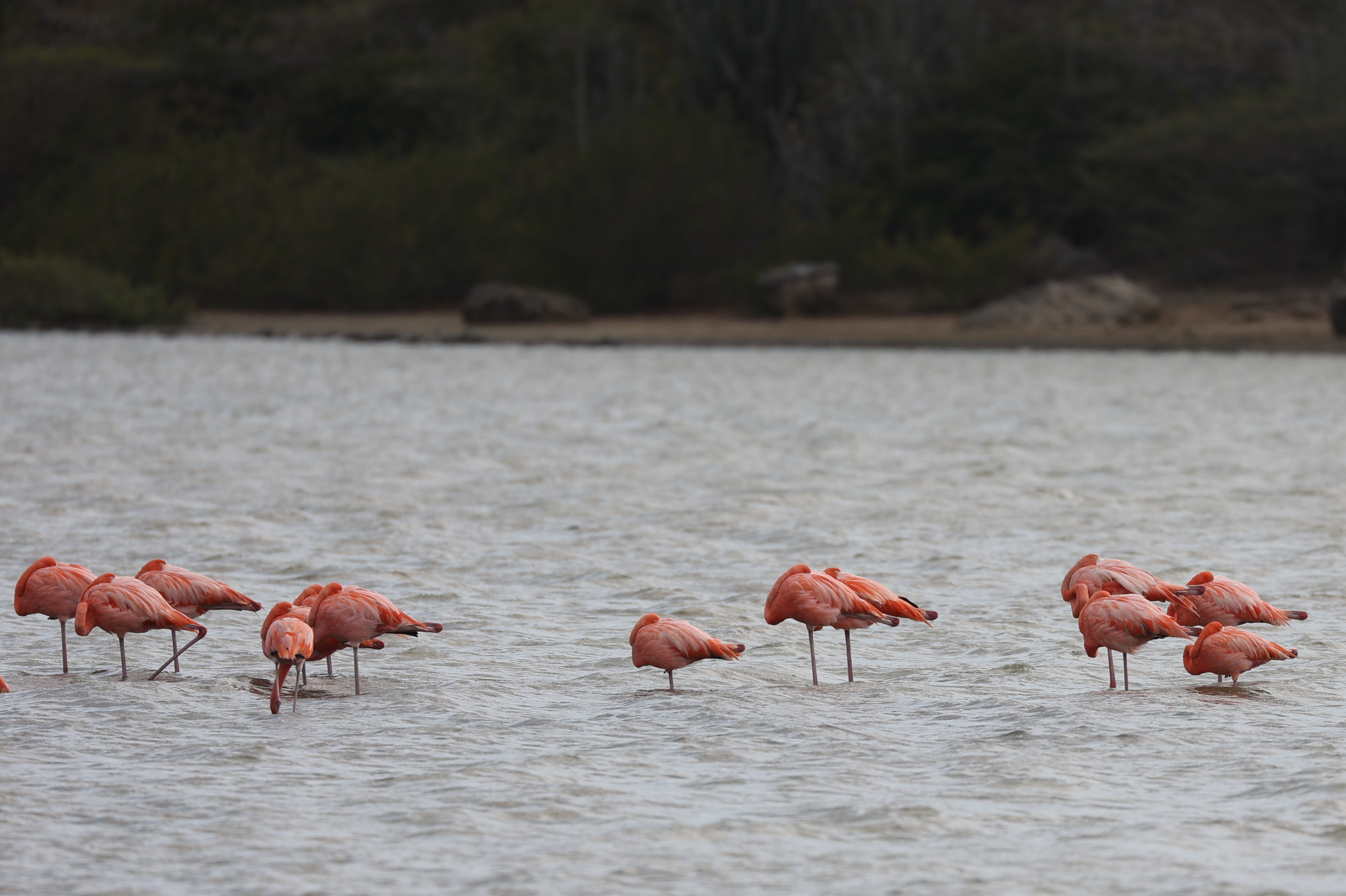 From there, we stopped back at the hotel for a quick moment and then headed back out. We drove up further up the western shoreline, and had to take a picture of the city sign for Sint Michiel - complete with a dog who felt it was an excellent place to wait. We also were able to stop and see a large water inlet where flamingos can be found. And we found them! Most were further off shore, but some were close enough for Mike to get excellent pictures with the zoom lens. We then drove to the shoreline to see the sunset, but that was a couple hours off yet. So we navigated to a place further up the shore (with Google maps that were downloaded offline, we weren't using phone coverage). At one point, we commmented how the road looked brand new or at least newly paved. Then after by-passing the turn off for a gated community, we realized we were driving "off the map". Apparently the road was so new, it was not yet on Google. We turned around and drove toward the gated community - that happened to be where the sea-front restaraunt was located. We had to stop at a guard shack but after explaining we were headed for the restaurant, they waved us through. There was parking and pictures of condos for sale, and houses you could build and buy. They were NOT cheap to say the least! We walked down to the shoreline and looked at the water for a bit. The restaurant there was rather expensive and we weren't quite ready for dinner yet. We walked back up the stairs to Koraal Rooftop Terrace, and had a couple of beers and bitterballen. From there we watched the sunset - perfect.