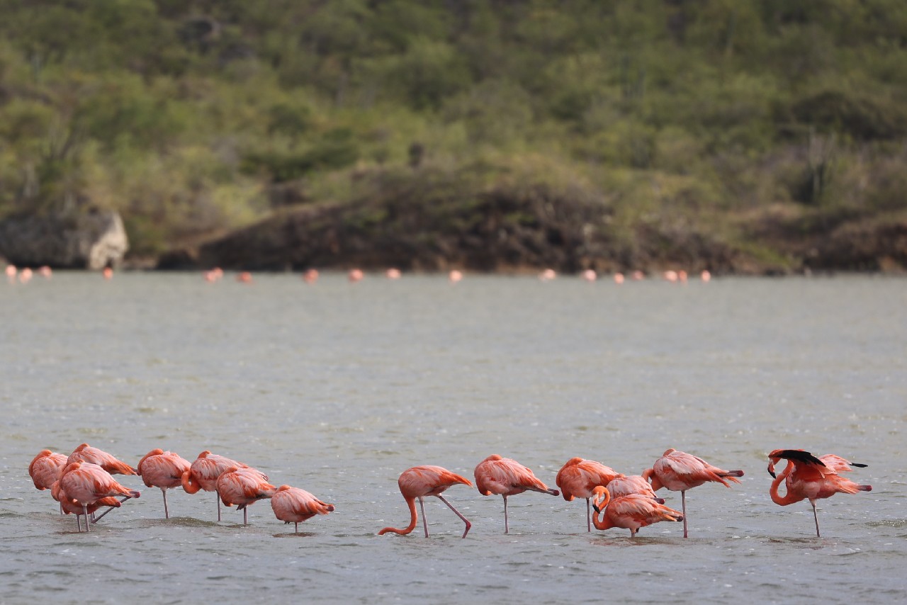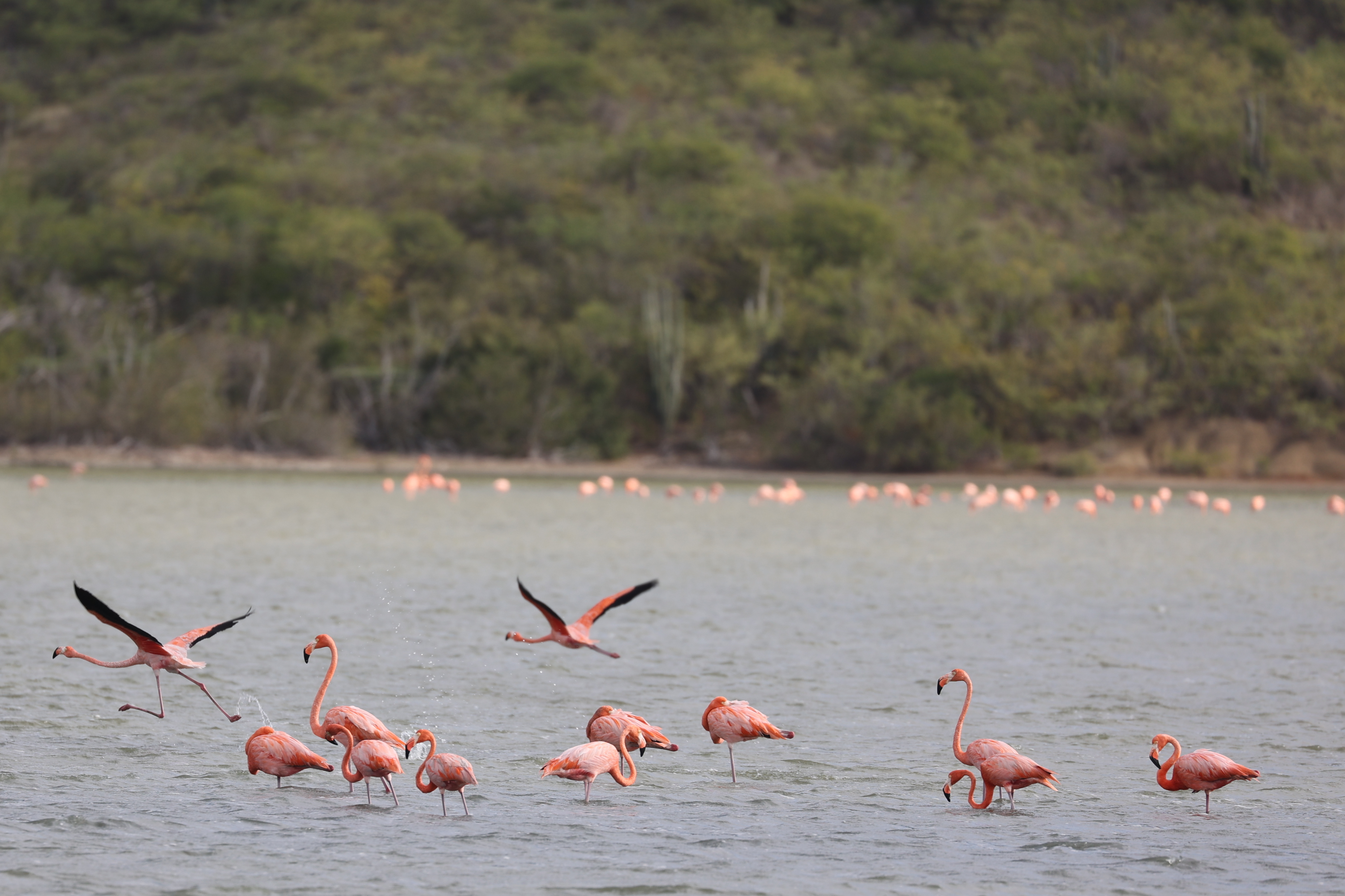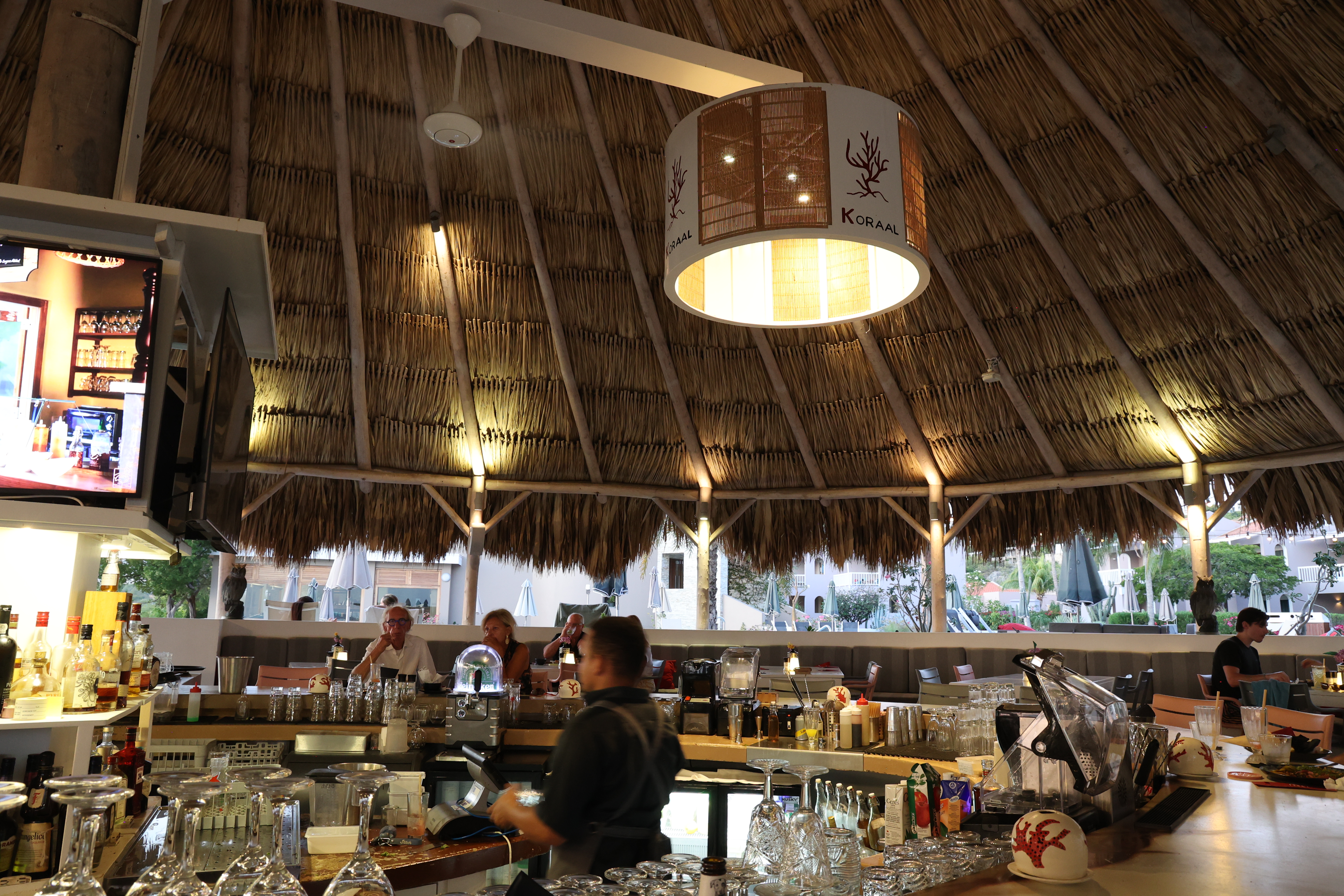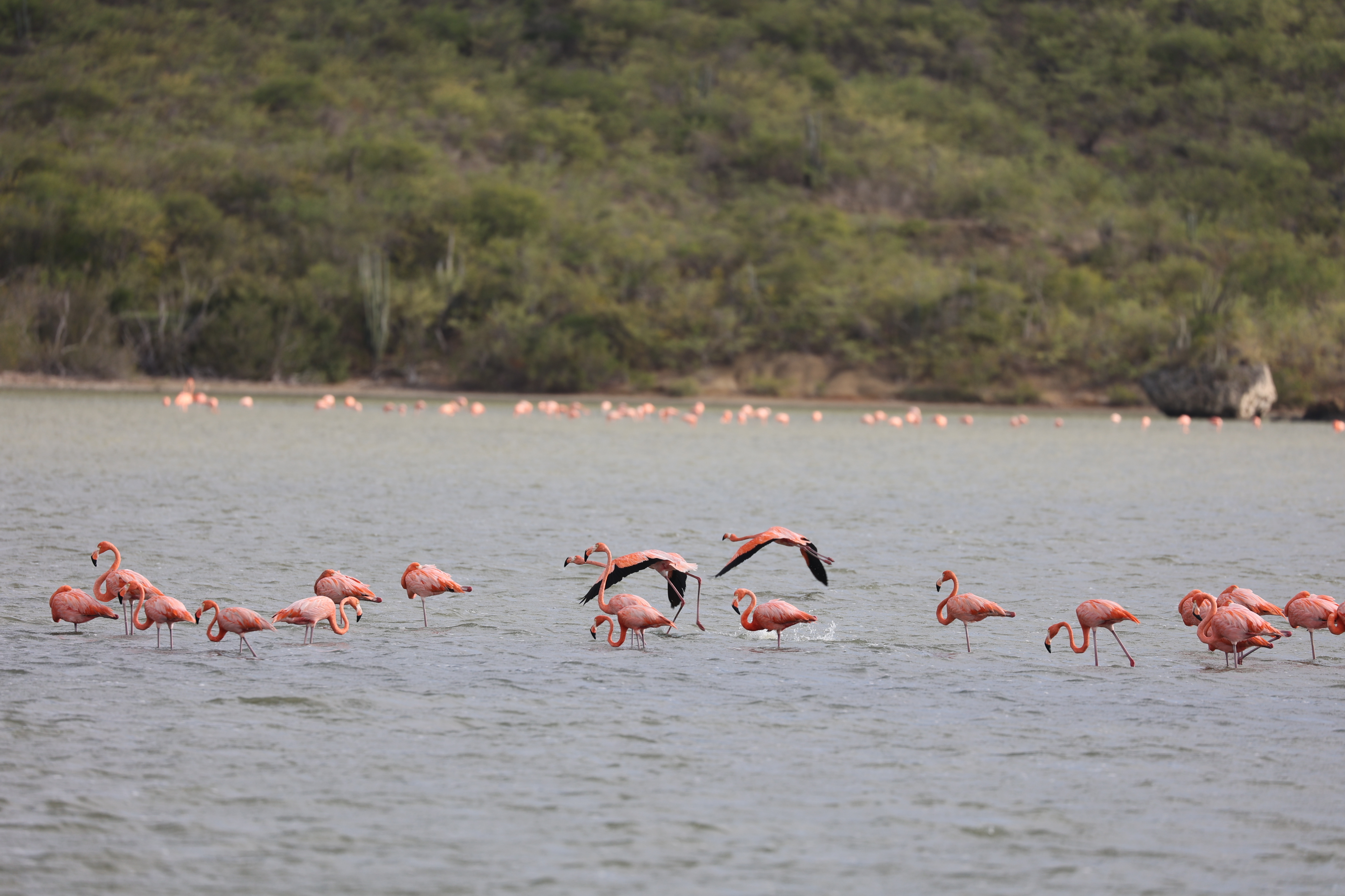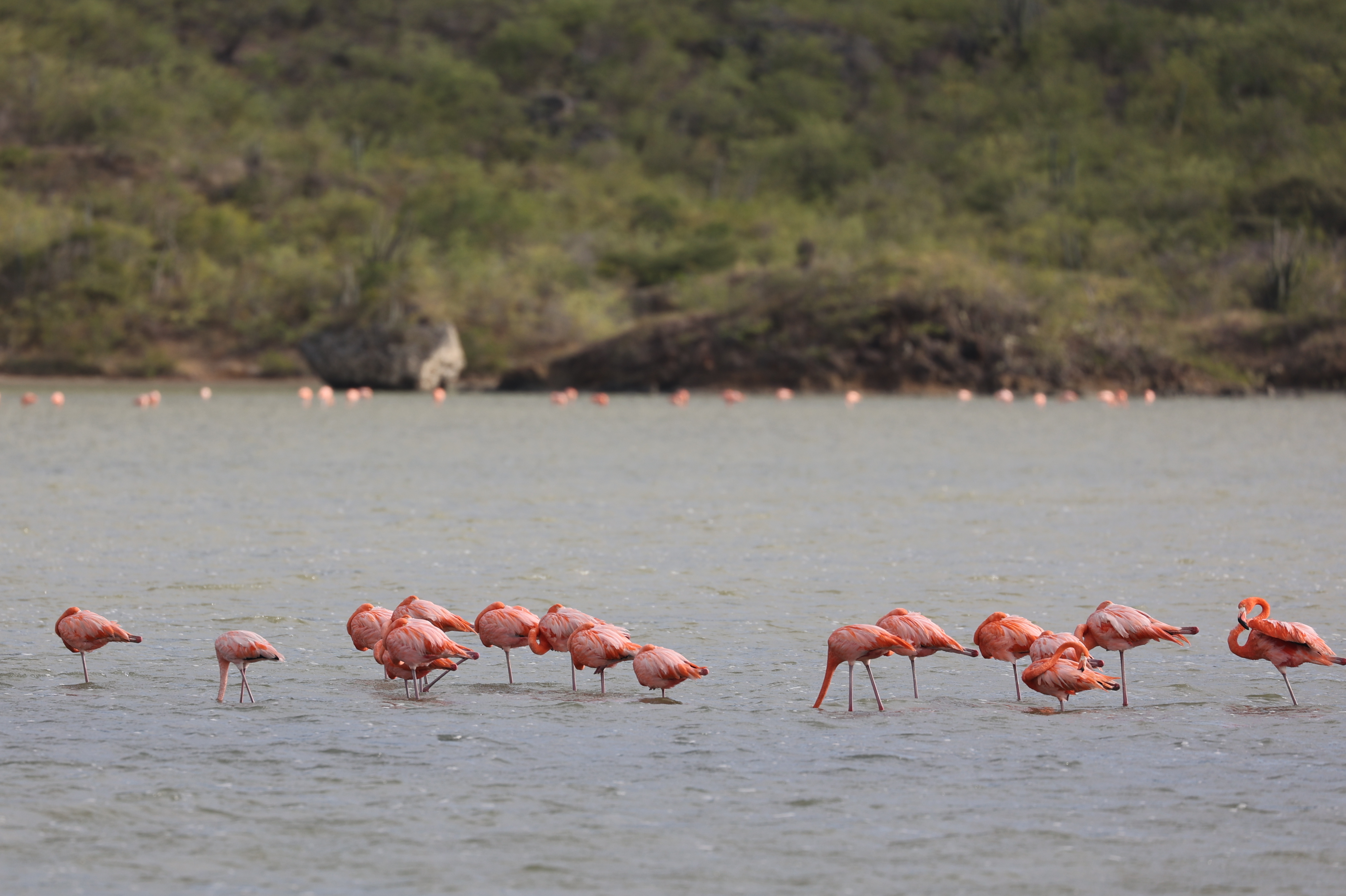 From there, we stopped back at the hotel for a quick moment and then headed back out. We drove up further up the western shoreline, and had to take a picture of the city sign for Sint Michiel - complete with a dog who felt it was an excellent place to wait. We also were able to stop and see a large water inlet where flamingos can be found. And we found them! Most were further off shore, but some were close enough for Mike to get excellent pictures with the zoom lens. We then drove to the shoreline to see the sunset, but that was a couple hours off yet. So we navigated to a place further up the shore (with Google maps that were downloaded offline, we weren't using phone coverage). At one point, we commmented how the road looked brand new or at least newly paved. Then after by-passing the turn off for a gated community, we realized we were driving "off the map". Apparently the road was so new, it was not yet on Google. We turned around and drove toward the gated community - that happened to be where the sea-front restaraunt was located. We had to stop at a guard shack but after explaining we were headed for the restaurant, they waved us through. There was parking and pictures of condos for sale, and houses you could build and buy. They were NOT cheap to say the least! We walked down to the shoreline and looked at the water for a bit. The restaurant there was rather expensive and we weren't quite ready for dinner yet. We walked back up the stairs to Koraal Rooftop Terrace, and had a couple of beers and bitterballen. From there we watched the sunset - perfect.