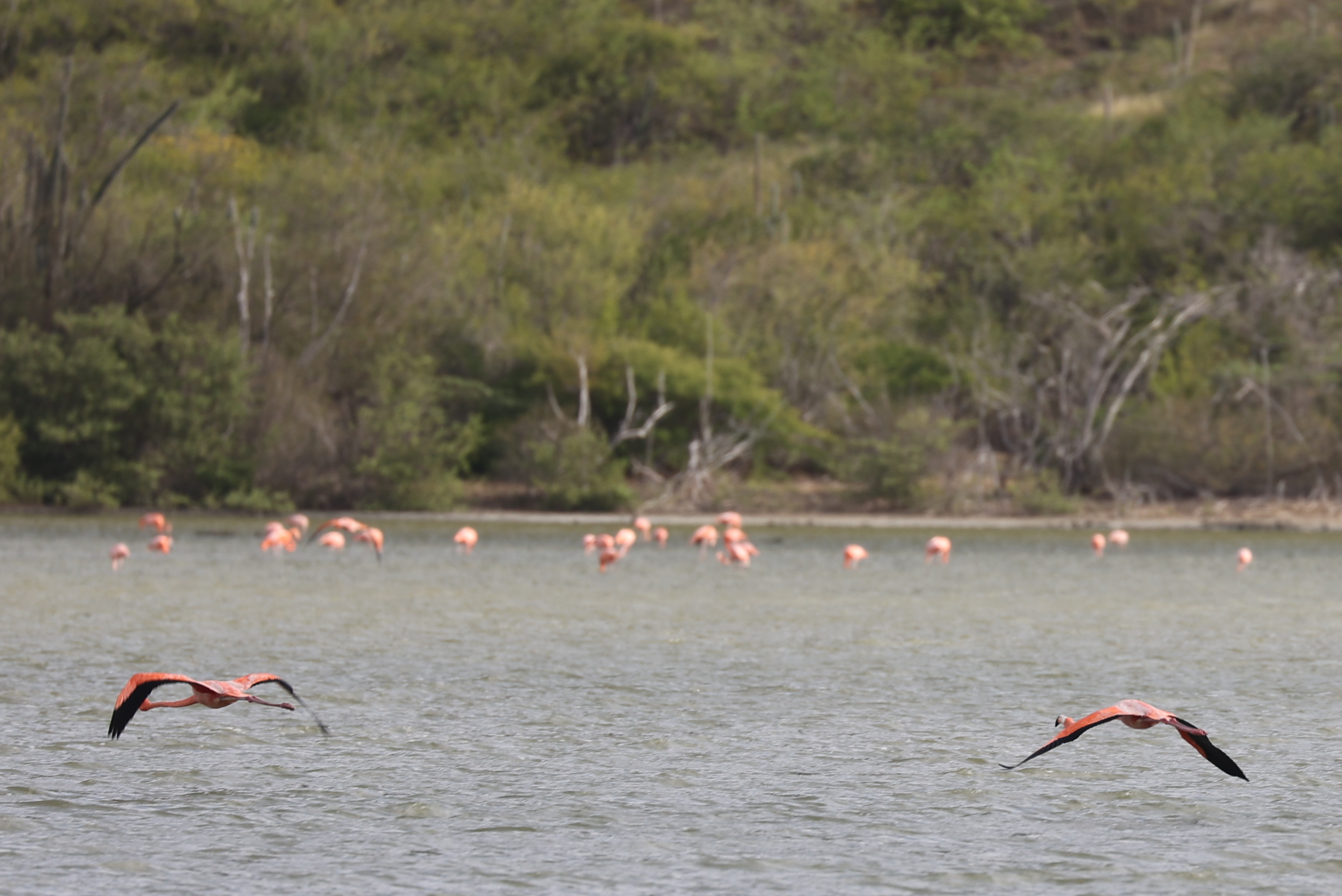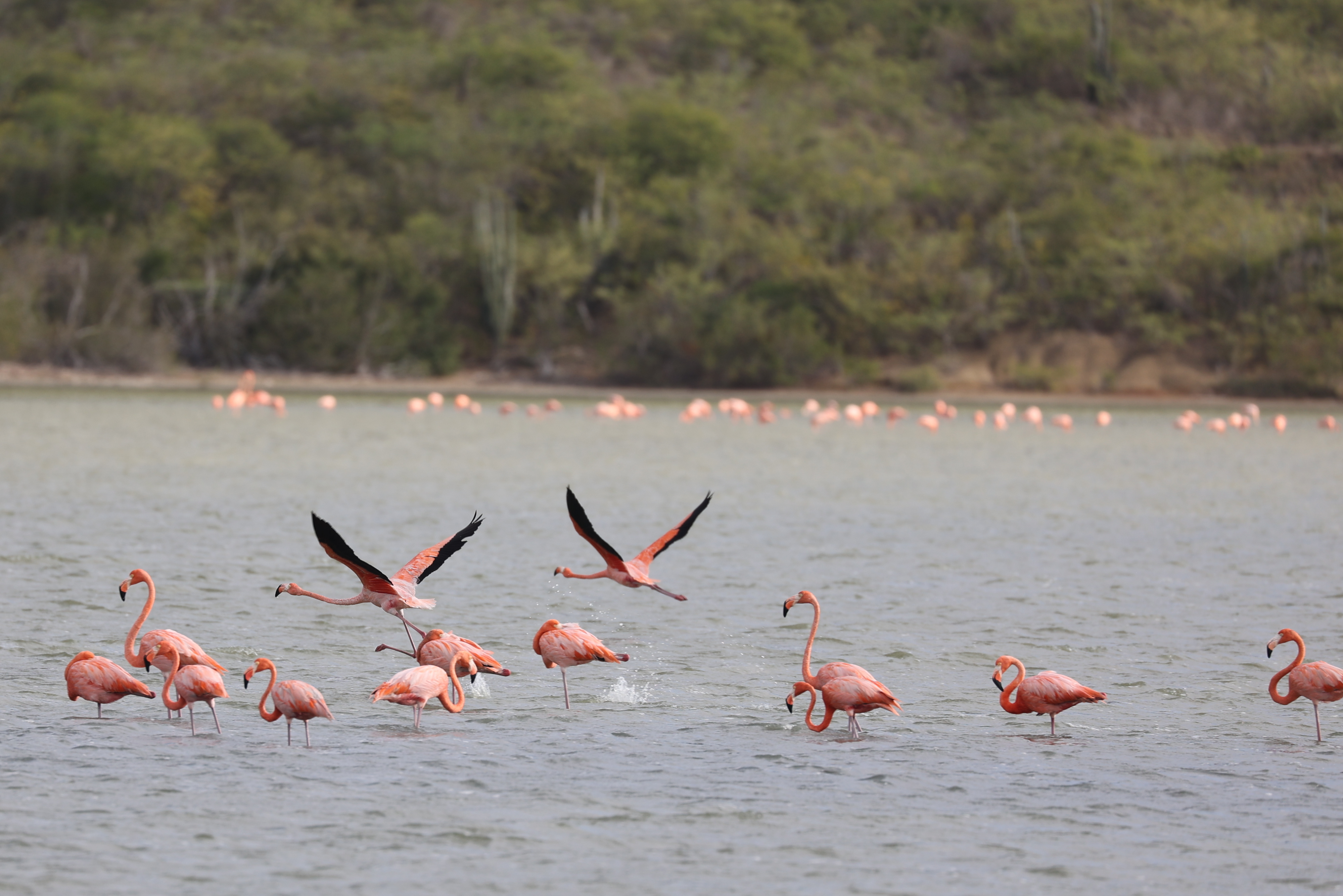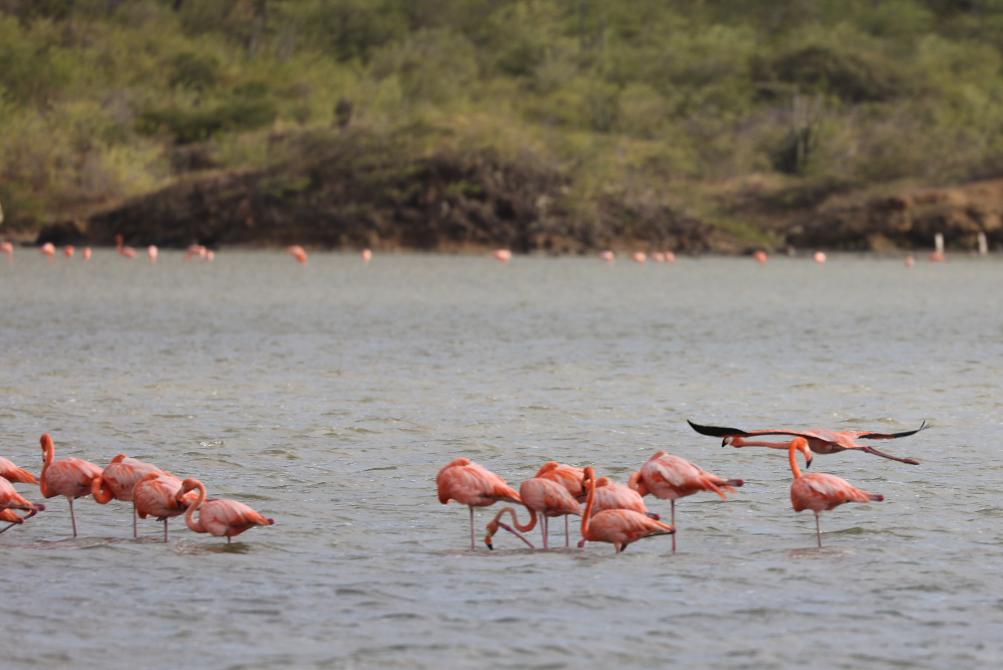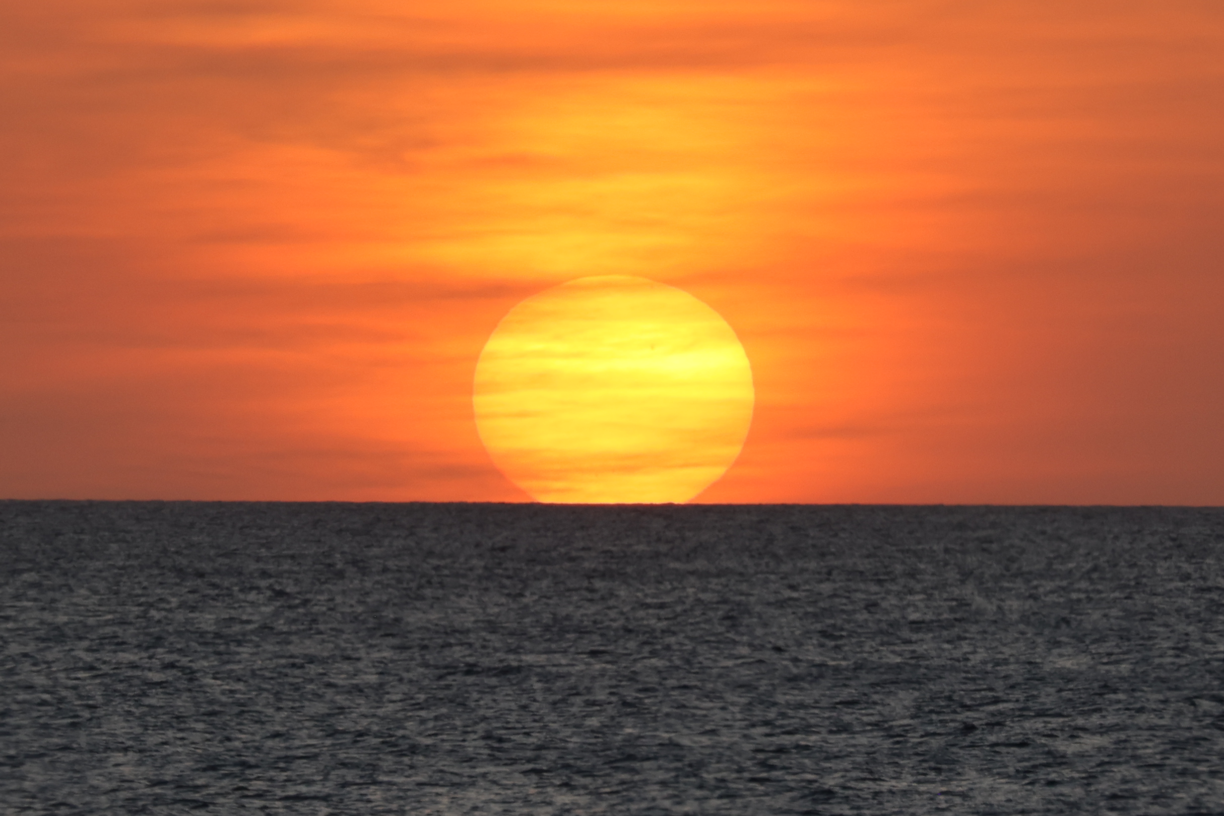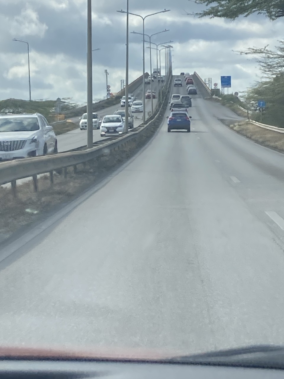 From there, we stopped back at the hotel for a quick moment and then headed back out. We drove up further up the western shoreline, and had to take a picture of the city sign for Sint Michiel - complete with a dog who felt it was an excellent place to wait. We also were able to stop and see a large water inlet where flamingos can be found. And we found them! Most were further off shore, but some were close enough for Mike to get excellent pictures with the zoom lens. We then drove to the shoreline to see the sunset, but that was a couple hours off yet. So we navigated to a place further up the shore (with Google maps that were downloaded offline, we weren't using phone coverage). At one point, we commmented how the road looked brand new or at least newly paved. Then after by-passing the turn off for a gated community, we realized we were driving "off the map". Apparently the road was so new, it was not yet on Google. We turned around and drove toward the gated community - that happened to be where the sea-front restaraunt was located. We had to stop at a guard shack but after explaining we were headed for the restaurant, they waved us through. There was parking and pictures of condos for sale, and houses you could build and buy. They were NOT cheap to say the least! We walked down to the shoreline and looked at the water for a bit. The restaurant there was rather expensive and we weren't quite ready for dinner yet. We walked back up the stairs to Koraal Rooftop Terrace, and had a couple of beers and bitterballen. From there we watched the sunset - perfect.