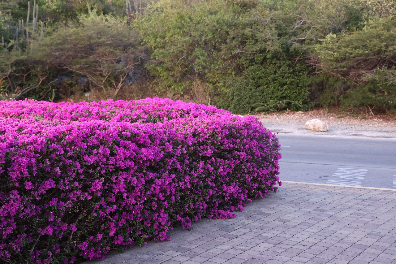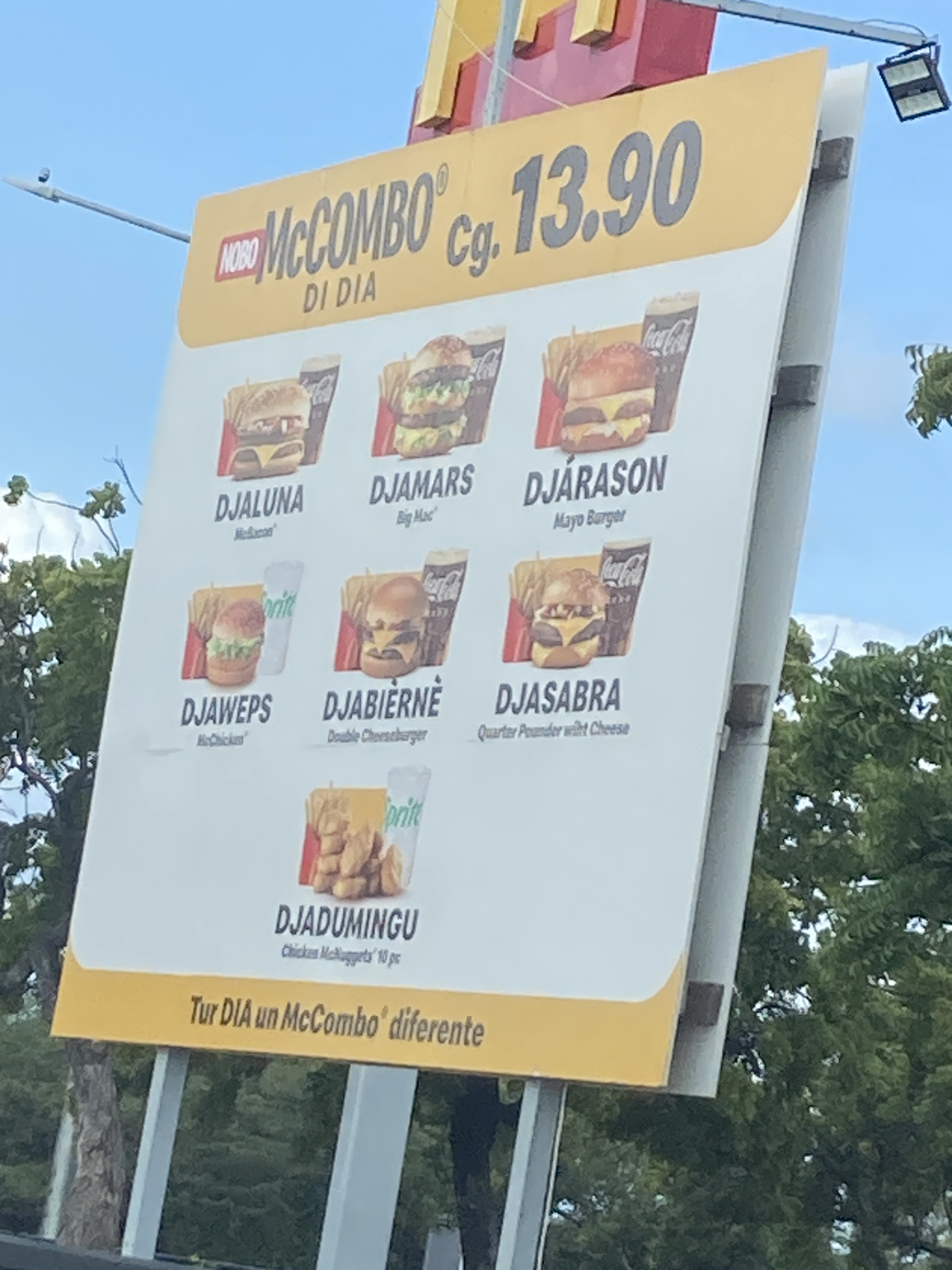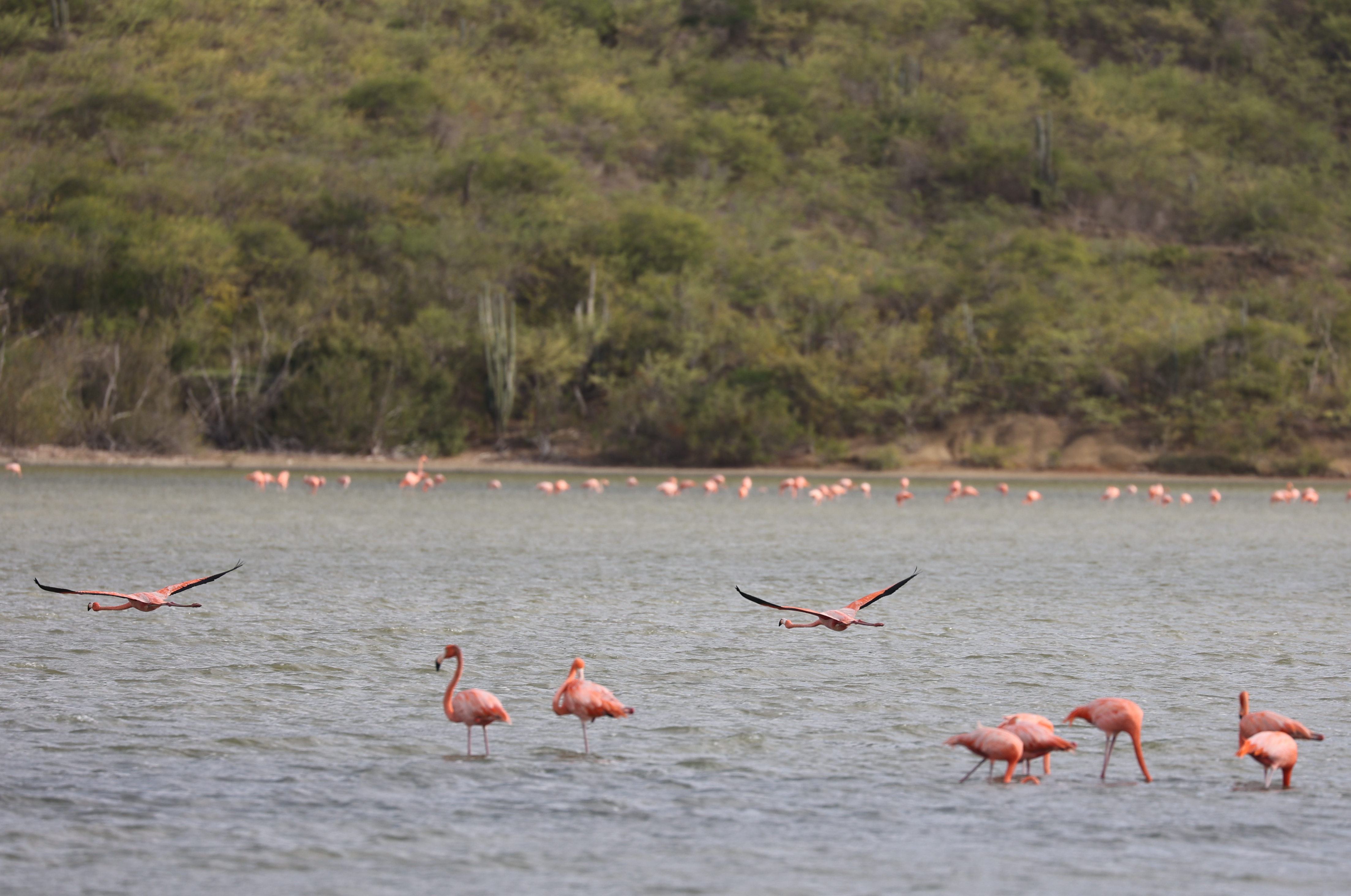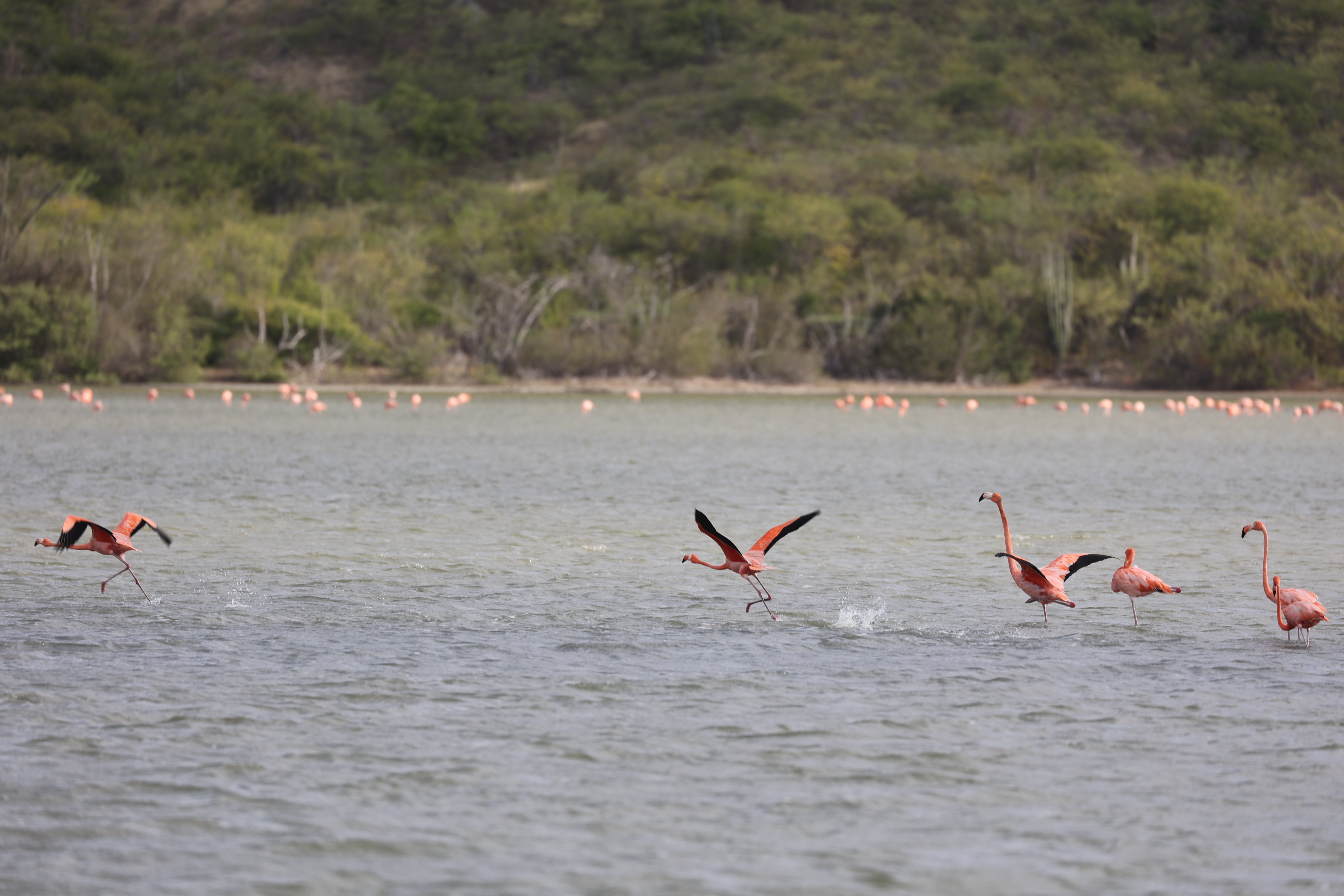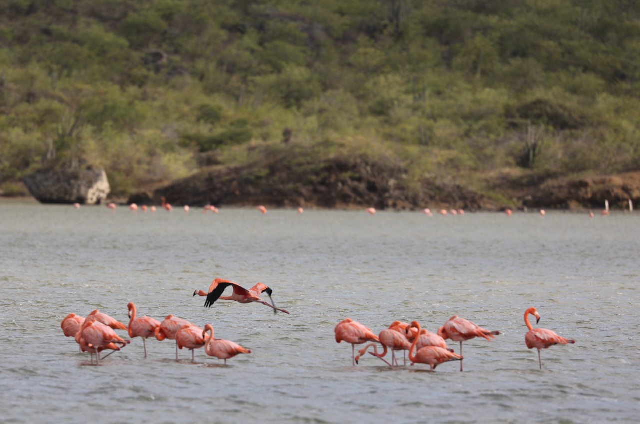 From there, we stopped back at the hotel for a quick moment and then headed back out. We drove up further up the western shoreline, and had to take a picture of the city sign for Sint Michiel - complete with a dog who felt it was an excellent place to wait. We also were able to stop and see a large water inlet where flamingos can be found. And we found them! Most were further off shore, but some were close enough for Mike to get excellent pictures with the zoom lens. We then drove to the shoreline to see the sunset, but that was a couple hours off yet. So we navigated to a place further up the shore (with Google maps that were downloaded offline, we weren't using phone coverage). At one point, we commmented how the road looked brand new or at least newly paved. Then after by-passing the turn off for a gated community, we realized we were driving "off the map". Apparently the road was so new, it was not yet on Google. We turned around and drove toward the gated community - that happened to be where the sea-front restaraunt was located. We had to stop at a guard shack but after explaining we were headed for the restaurant, they waved us through. There was parking and pictures of condos for sale, and houses you could build and buy. They were NOT cheap to say the least! We walked down to the shoreline and looked at the water for a bit. The restaurant there was rather expensive and we weren't quite ready for dinner yet. We walked back up the stairs to Koraal Rooftop Terrace, and had a couple of beers and bitterballen. From there we watched the sunset - perfect.