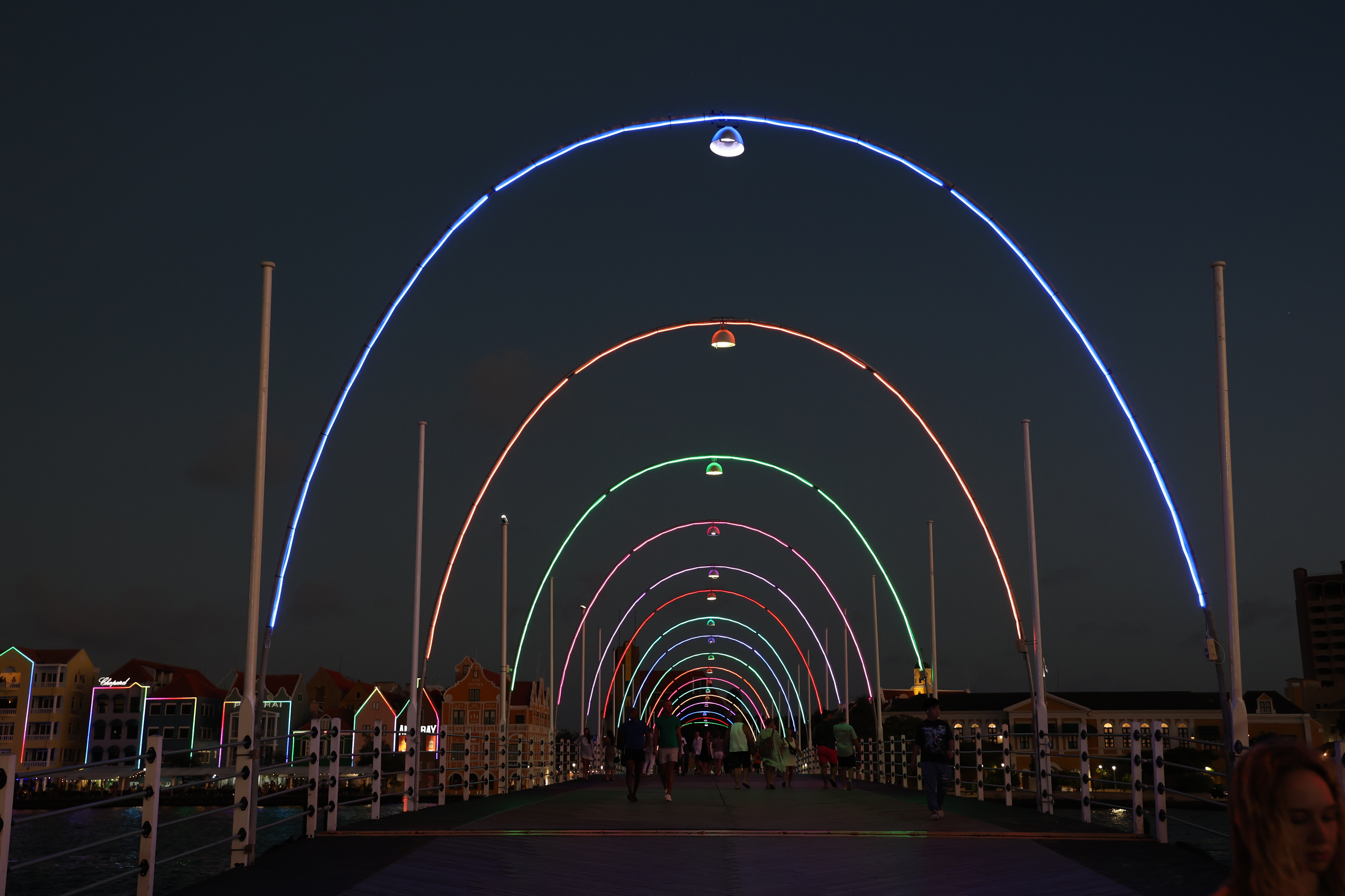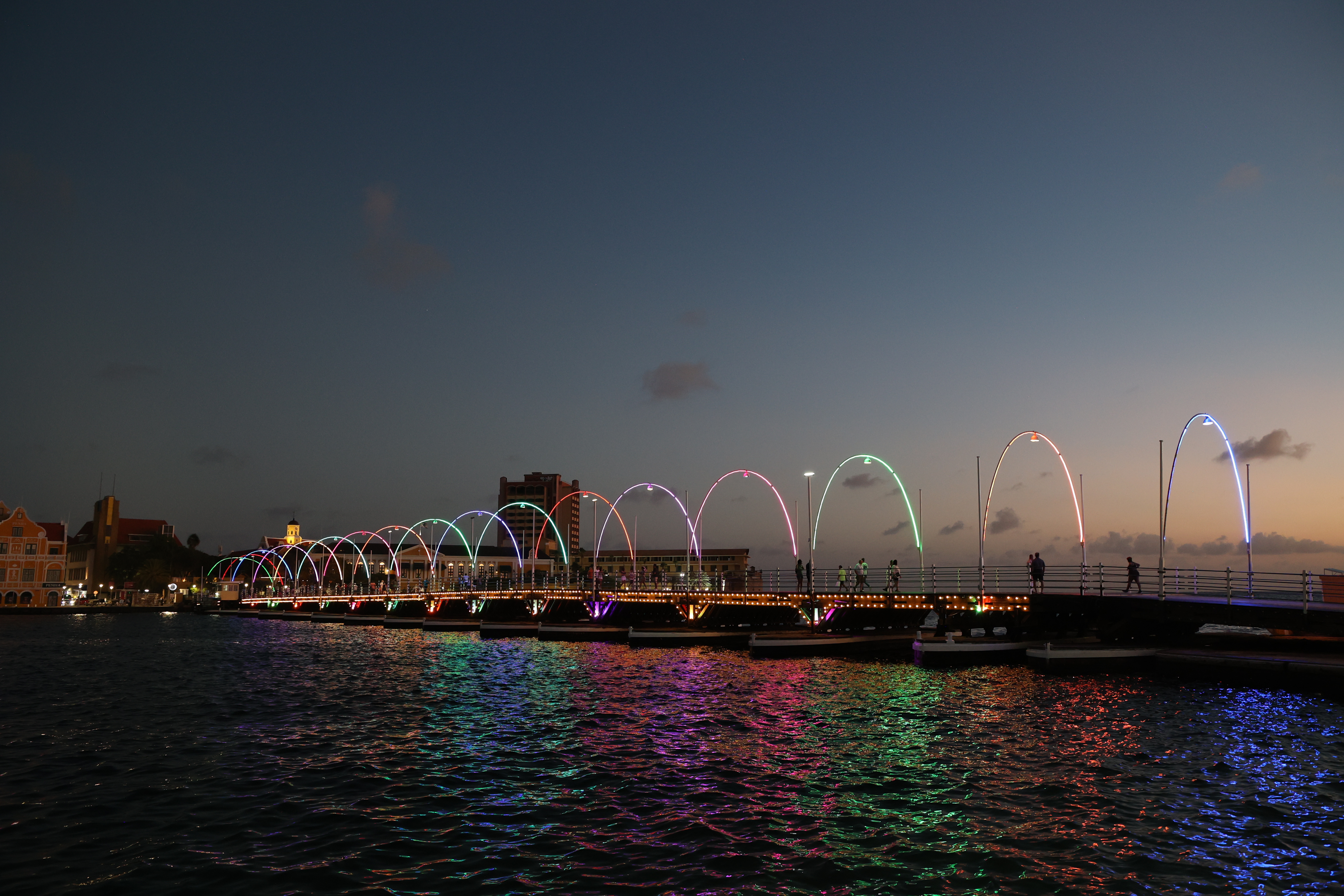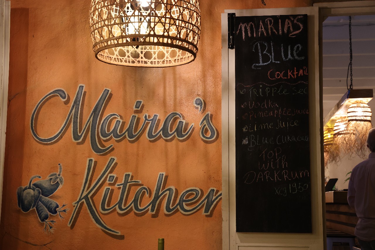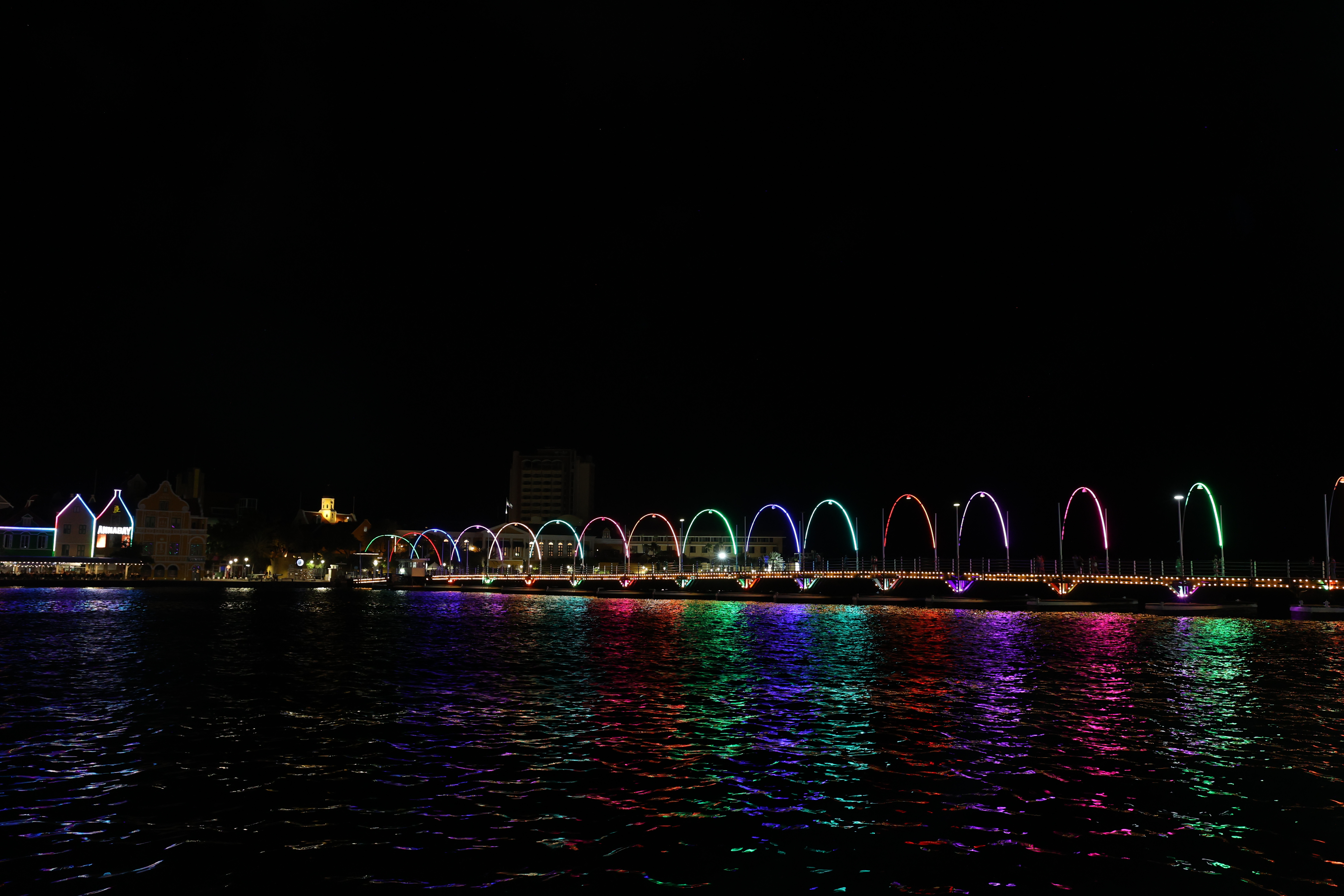 We walked down to the Queen Emma Bridge and Mike got some more pictures. We walked along the waterway until we started up a hill and found what we figured out later was the old cruise ship terminal. The new one is right outside of our hotel. From there, we got to Maira's Kitchen a bit early, but they were still able to seat us outside in a covered patio. Mike ordered the goat stoba, which is a native Curacao dish. It's a bit like stew, and was accompanied by some pickled veggies, rice, and a salsa-like sambal; it was excellent. Greta ordered the Red Snapper filet that came with veggies and fries; not as good as Mike's but still excellent. After that we walked down to our hotel, watched a little bit of the Olympics and called it a night.