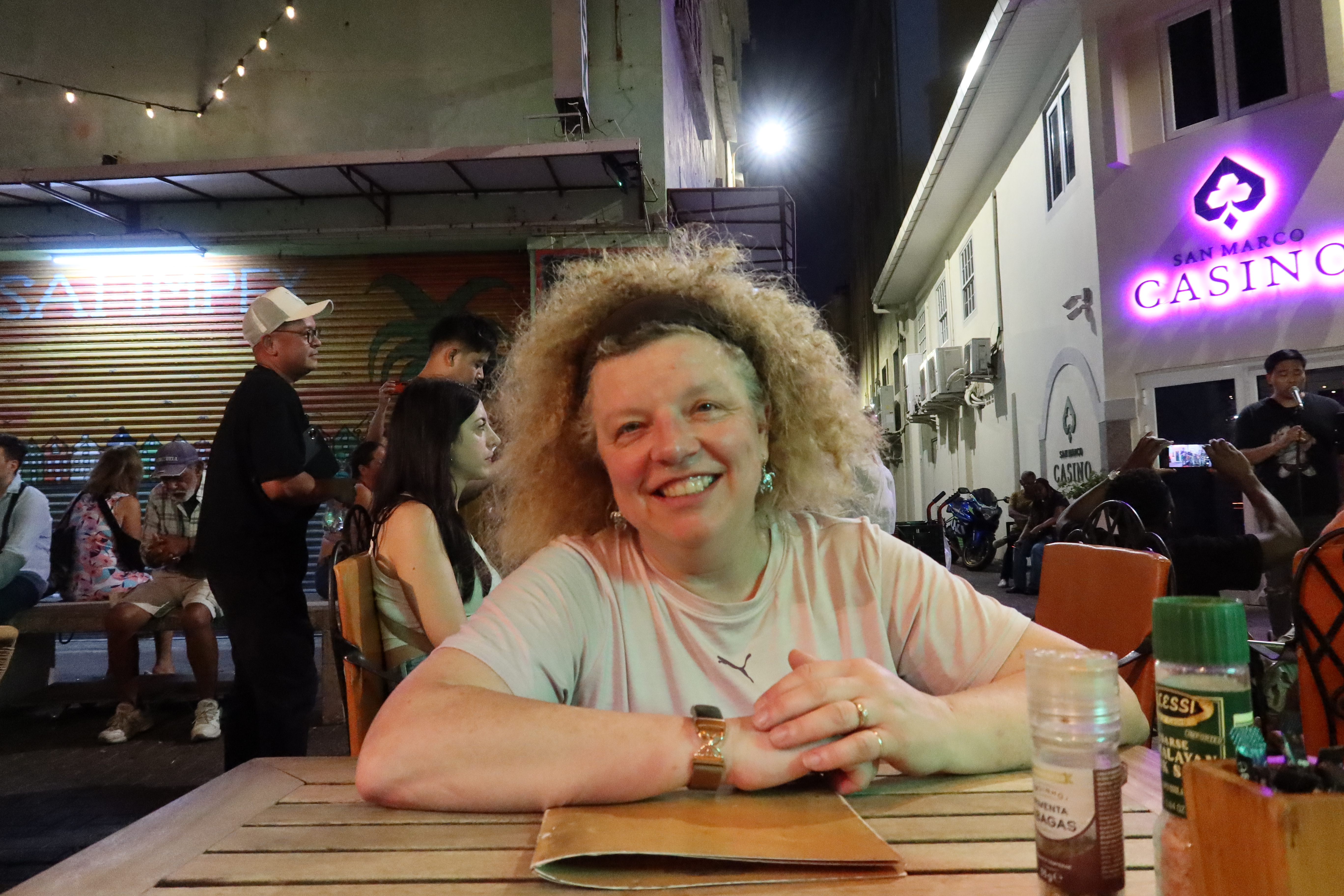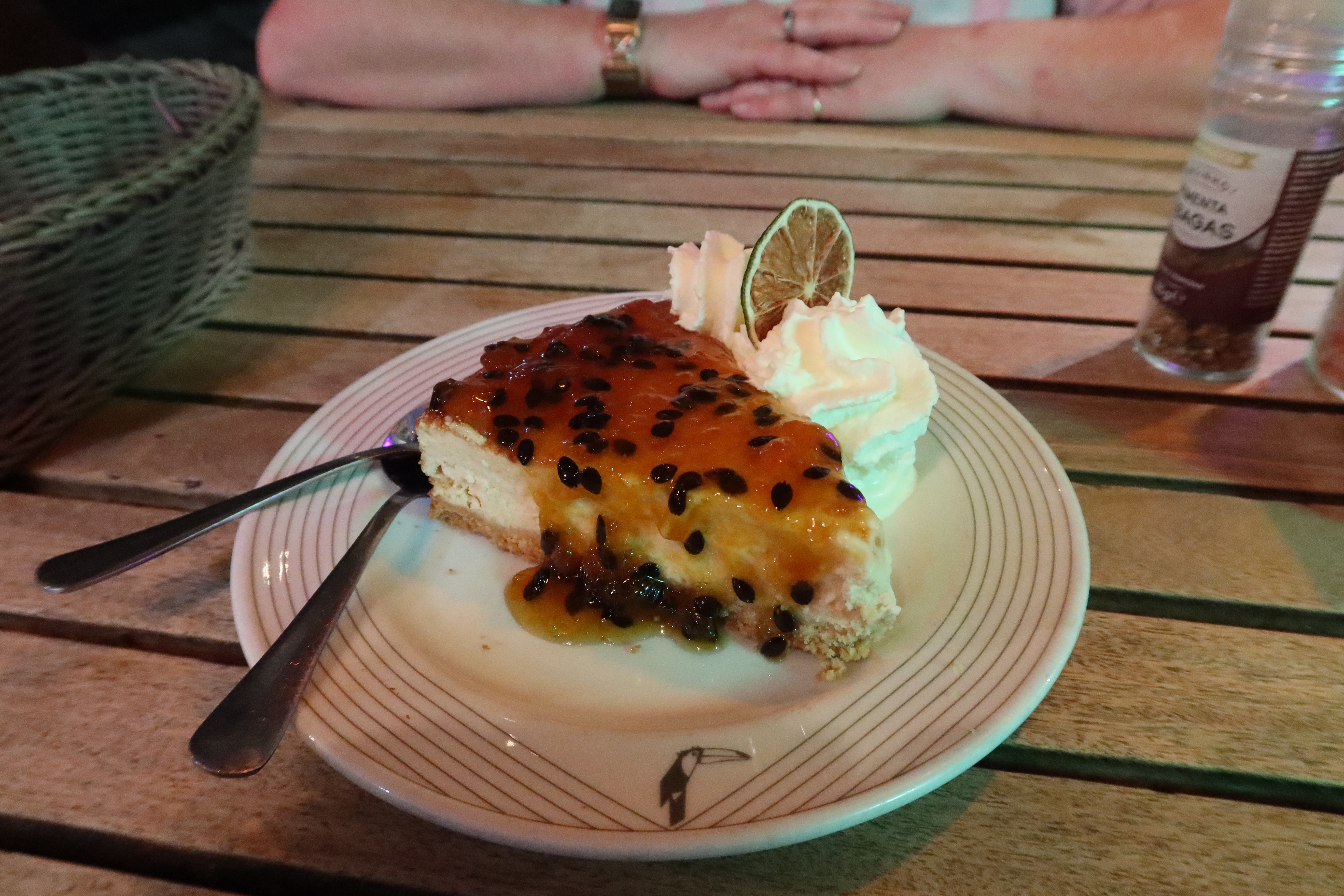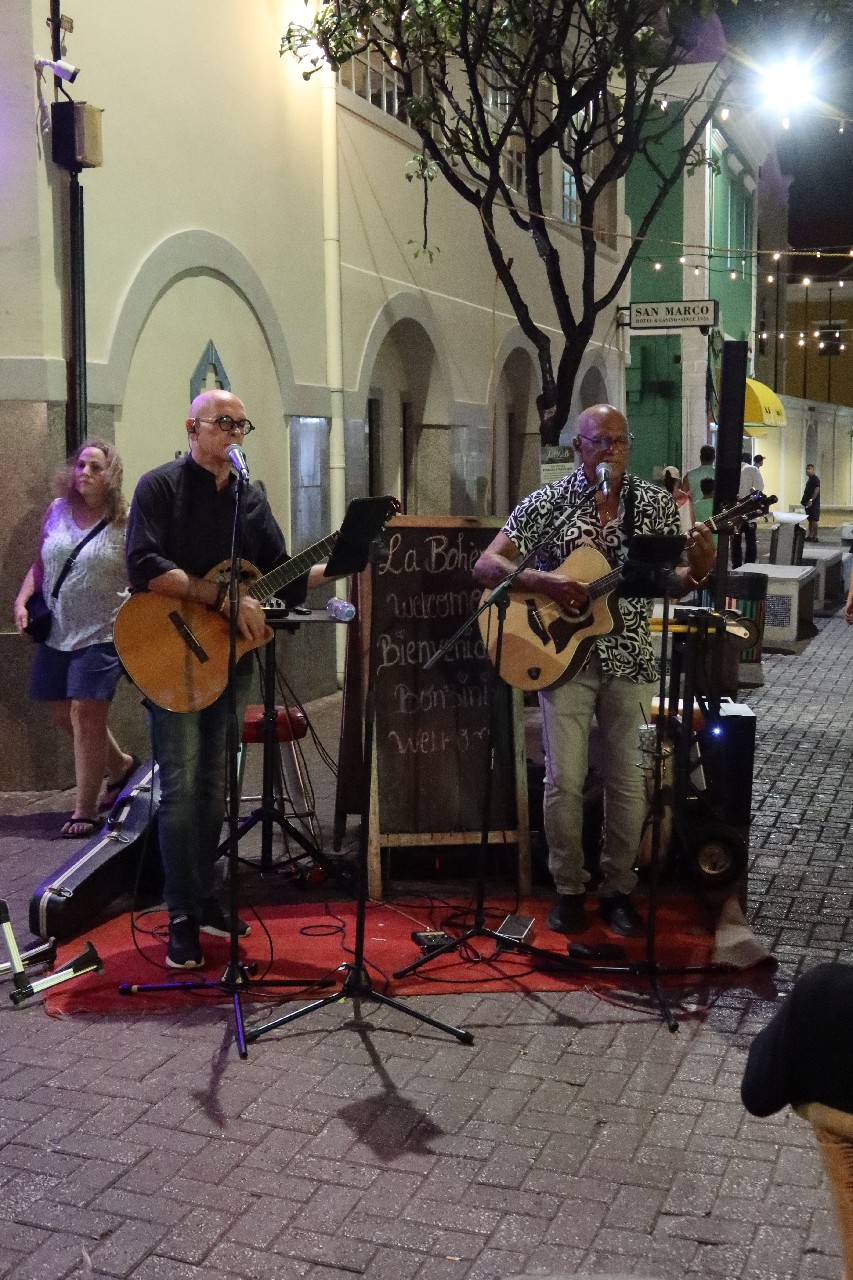 From there we walked back over the bridge to Punda, walked a bit and then got to the restaurant at 7 pm. We noticed it was very busy and thought to ask if we could be seated early. There was only one open table, and as we got close, could see it was reserved for us, so we had no problem with arriving early. There were two older men singing and playing guitar. At one point, a younger guy got up and sang "Imagine" while all his buddies recorded him and applauded. In the meantime, we'd ordered a drink, a Mango Mohito for Mike and Mr. Passion for Greta, and dinner. Greta ordered the beef stew/stoba - local cuisine and Mike ordered Tequila shrimp. Unfortunately, they were out of the stew so she opted for Ceviche instead. Our food was good but the music and atmosphere were divine. We shared a piece of cheese cake with some sort of exotic fruity topping and it was wonderful. We also had another drink, a Mr. Passion and Blue Margarita. In the meantime, the earlier young guy got up and sang "Yesterday" and then two other guys asked to perform. One took the guitar of one of the regular performers and the other took out a tenor sax, and they performed a song with one of the original guitar players. The guy singing/playing guitar was REALLY good! Overall, it was a perfectly relaxing evening. From there we walked back to the hotel to watch a bit of Olympics before going to sleep before our last full day on the island.