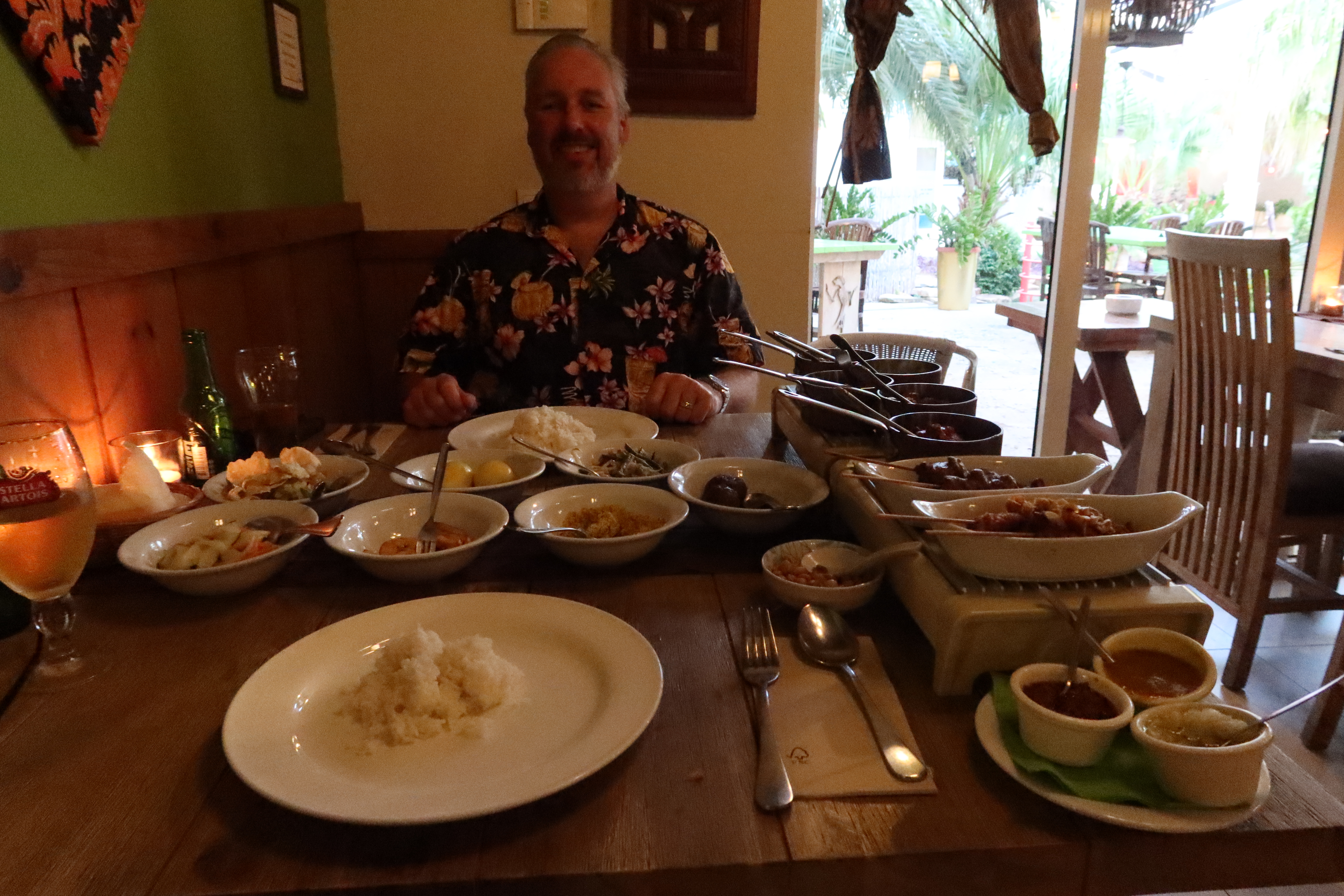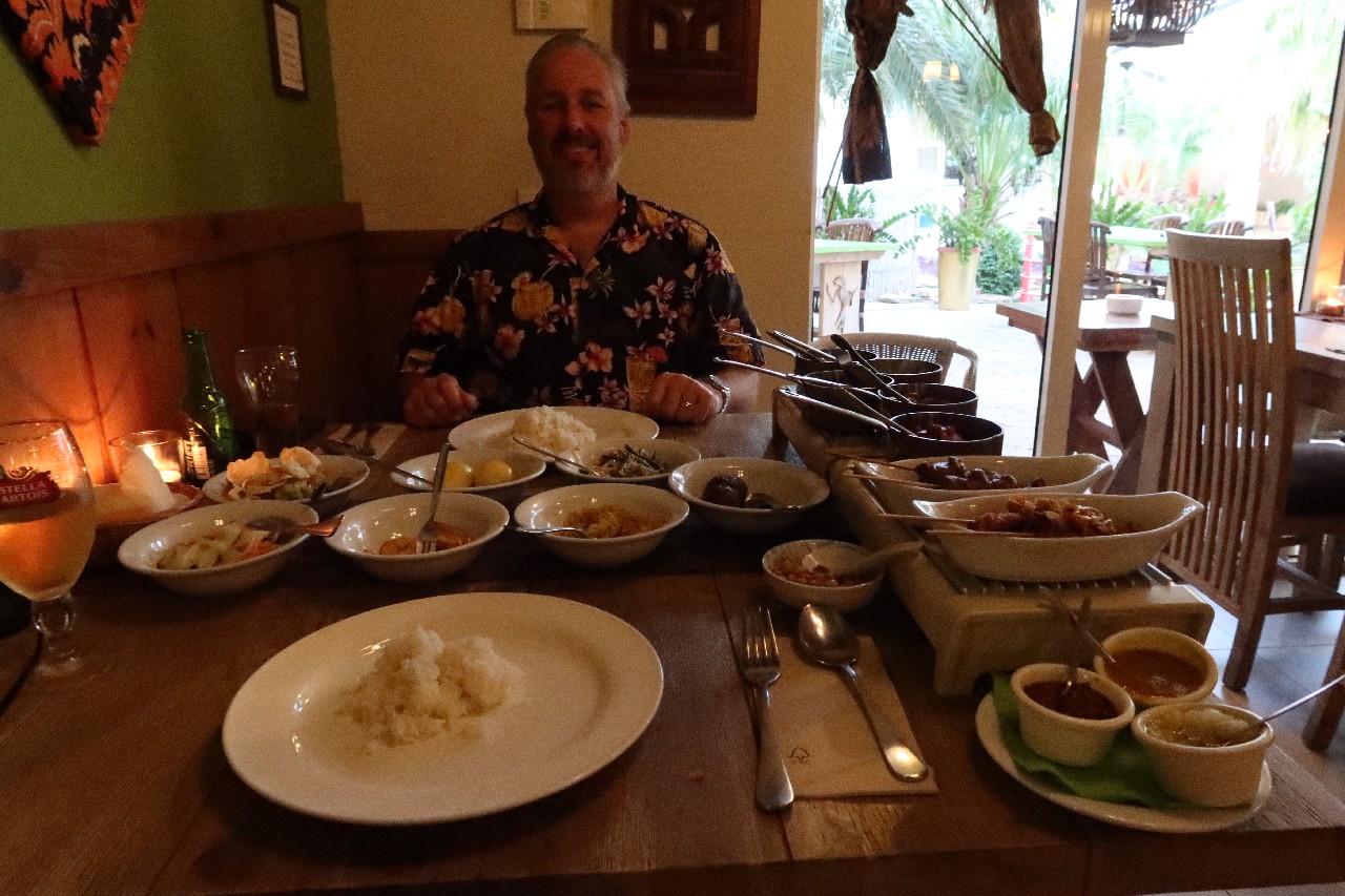 Then the rijsttafel came & it was amazing. There actually is a menu you could order specific dishes off of or just order rijsttafel for the number of people in your party. This translates to "rice table" and you basically are presented with your very own buffet. Many dishes were served all at once, some of them on heated tables. There was just so much to eat - it was incredible! The server served rice on each of our plates from a basket, and then we dug in. Two different skewers of meats. A couple of chicken dishes, a beef dish and a pork dish. Plus Gado Gado, sajur (vegetables) and more. There was a dried coconut and a dish of peanuts to sprinkle on top of your food. There were also three sauces: sambal, peanut sauce and a mango sauce. We couldn't finish it all but we tried our best. It was an amazing meal all around. With 4 beers, the entire meal came to $75 USD, which is incredible. The only disappointment was we had the waitress take a picture of us with all our food, but she must have not hit the right button on the camera; when we got back to the hotel, we realized the picture was not there. But all in all, that was the perfect way to spend for our last evening in Curacao.