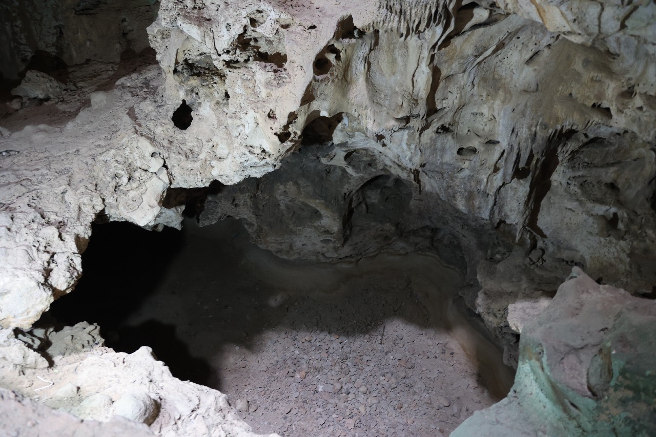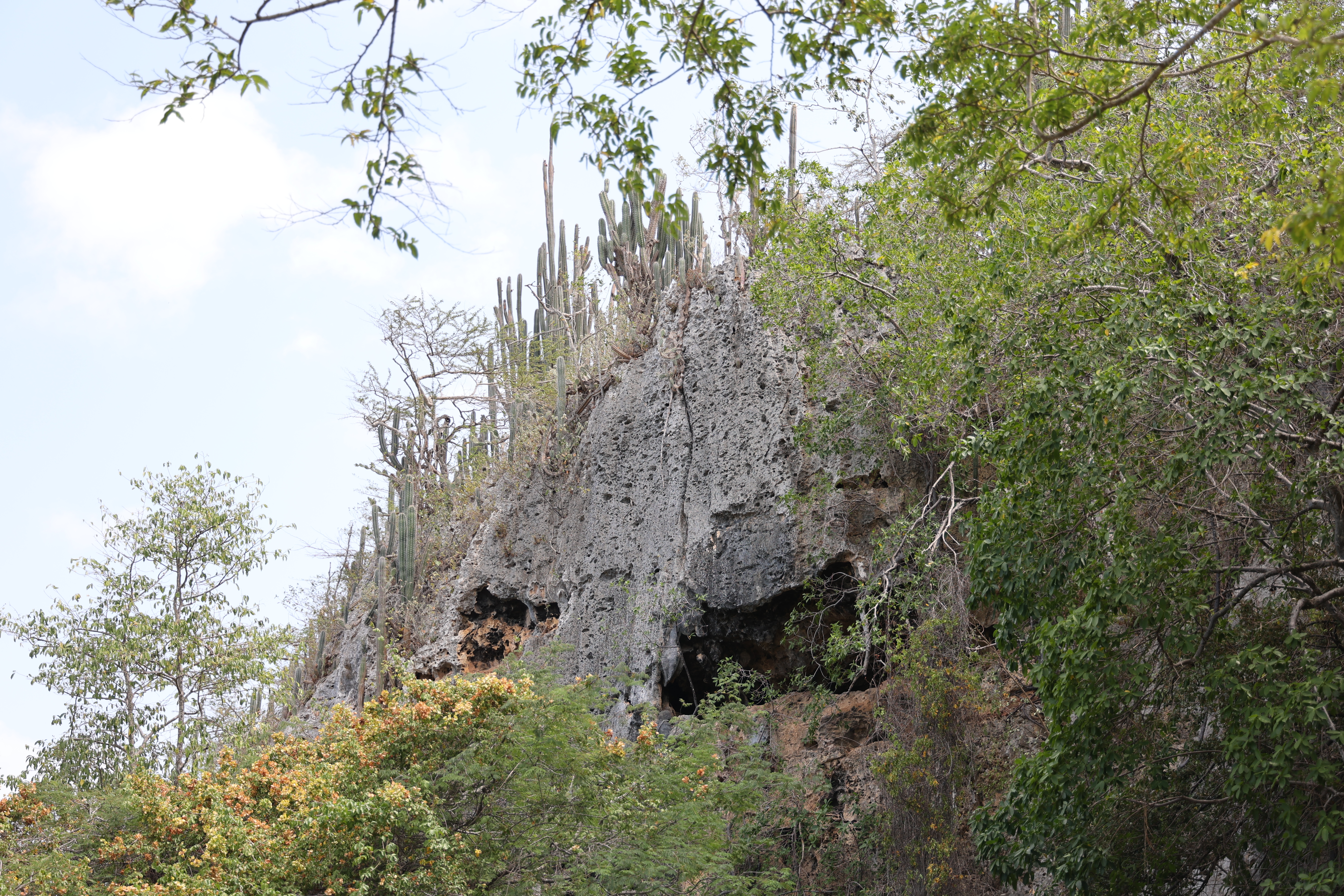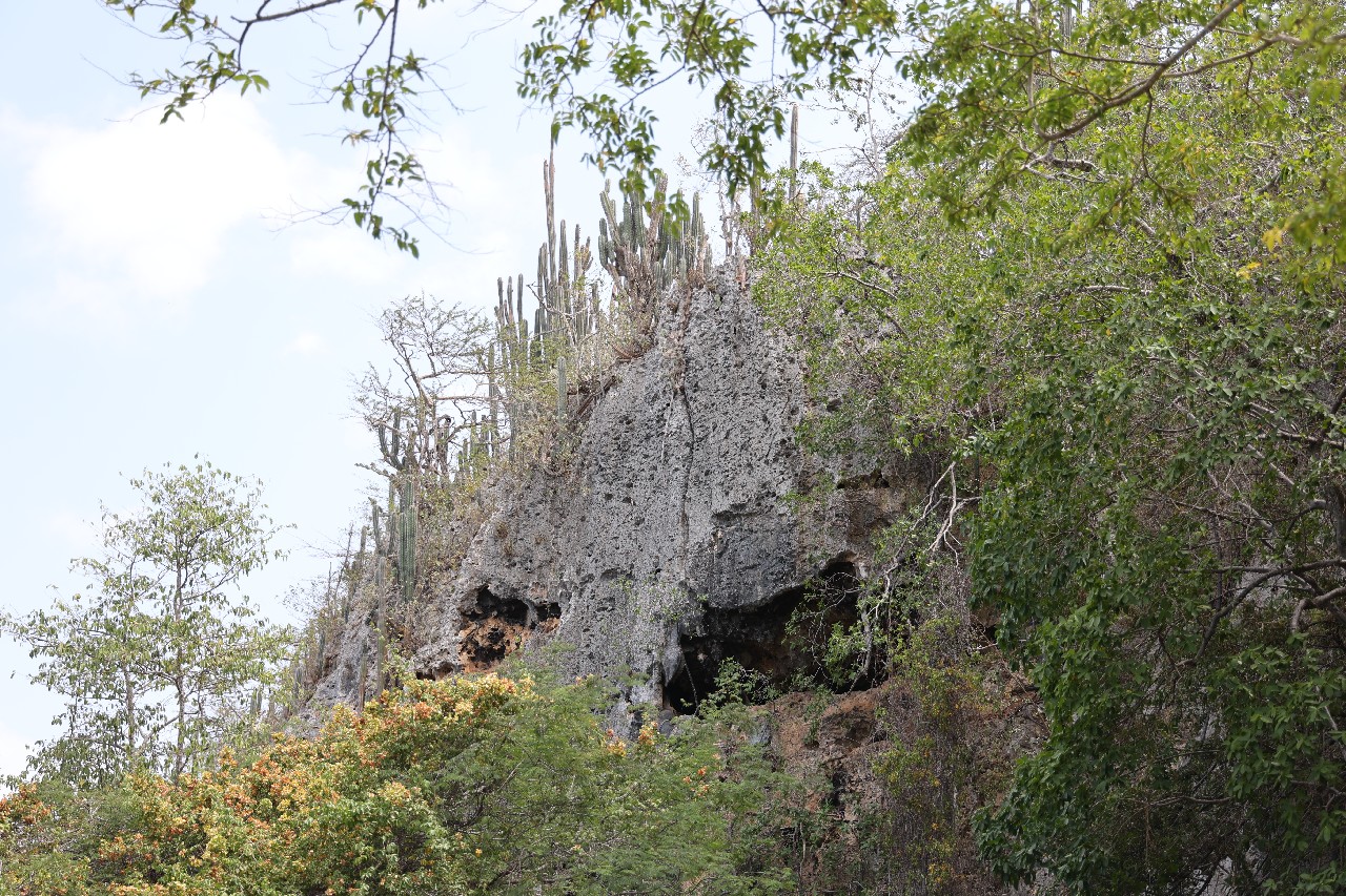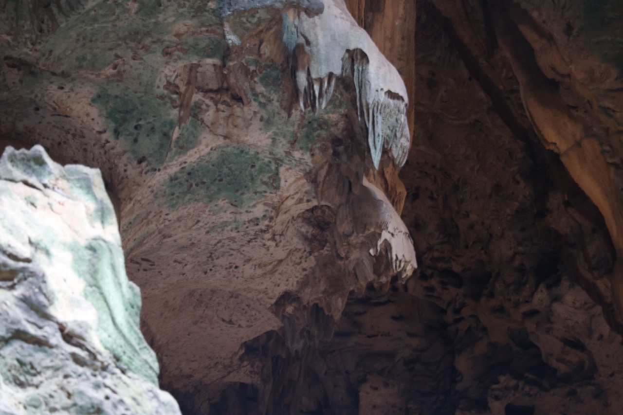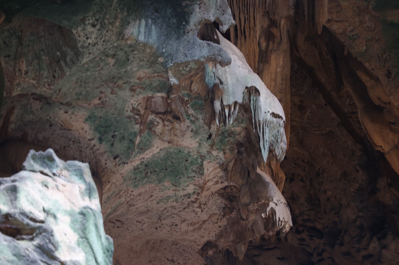 We bought tickets for the next tour and were fortunate that it was starting in 10 minutes. Right in front of the bathrooms we FINALLY got to see a big iguana. We've been surprised we haven't seen more of them, but this guy was beautiful. The tour started and we went up a number of steps to get in. Because it's all above ground, it's not as cool as underground caves we've toured before, and they had fans running throughout the tour to help with the ventilation. The cave itself is actually several miles long but the public tour is of course just a small part of that. Right after entering, we saw a colony of bats hanging from the ceiling, and sometimes we'd see one flit past. We walked through various "rooms" within the cave, including the "fantasy room" were the guide pointed out various rock formations that could be imagined to be something else, including a witch, a donkey and the Virgin Mary. It was very interesting and a very different view of the island than what we'd seen so far. Also including in the ticket price was a self-guided "Indian Walk". It was a nature trail with numbered markers next to various plants and rock formations, and you could download a guide that explain each item. After we got back to the car, we drove across the road, and were able to watch some planes taxiing after landing and took some pictures there as well.