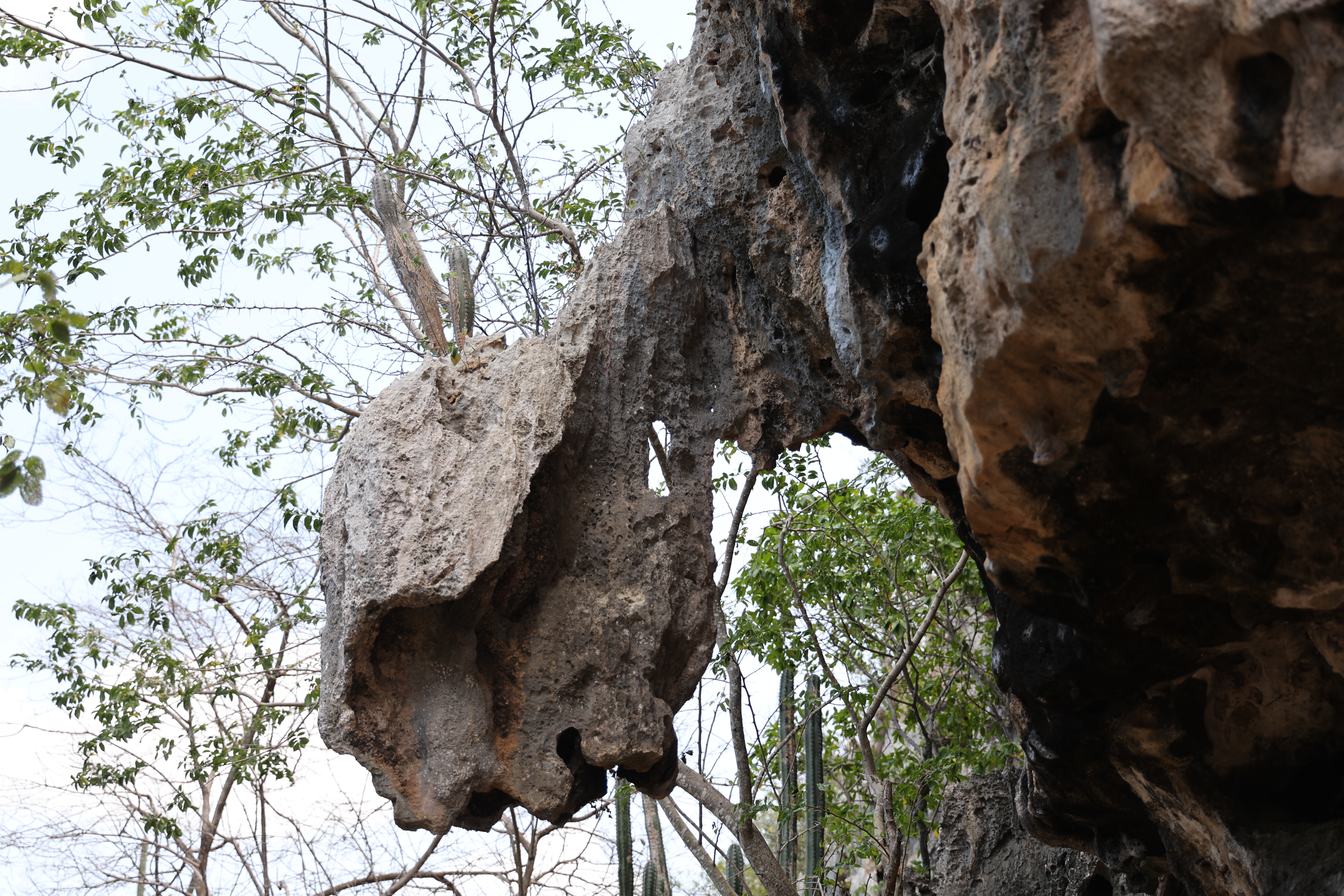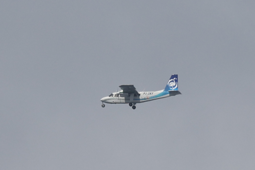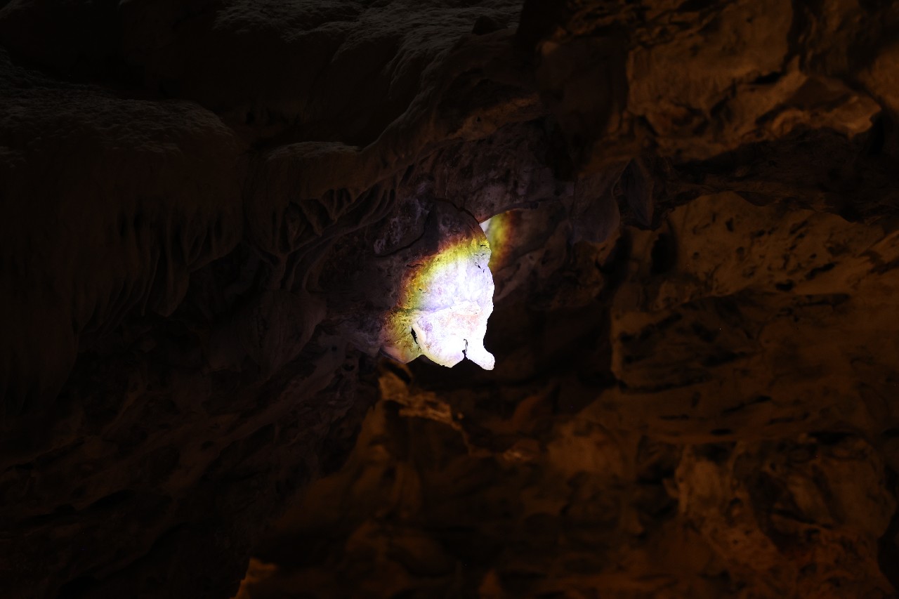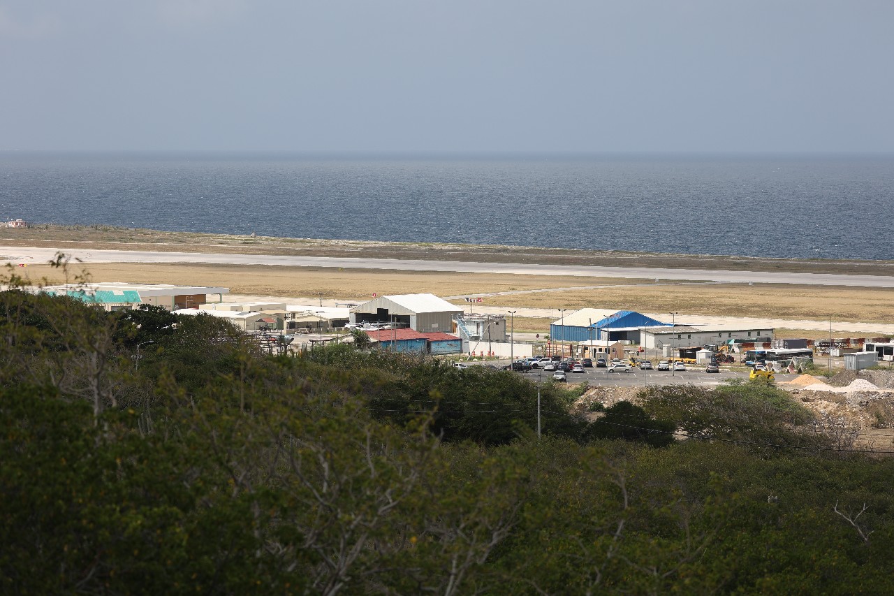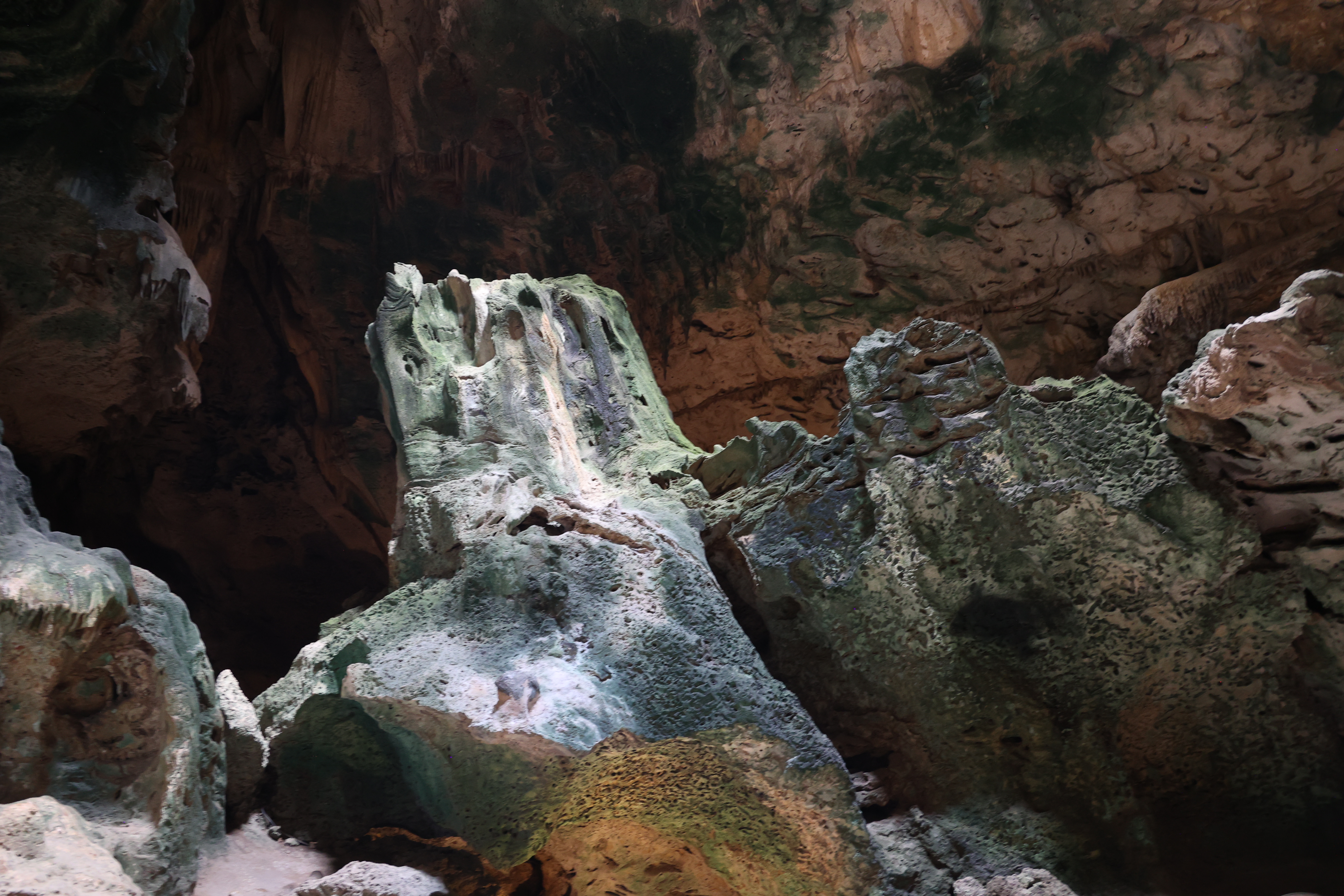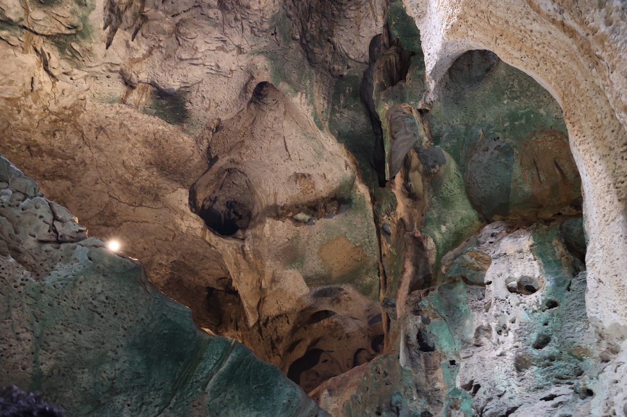 We bought tickets for the next tour and were fortunate that it was starting in 10 minutes. Right in front of the bathrooms we FINALLY got to see a big iguana. We've been surprised we haven't seen more of them, but this guy was beautiful. The tour started and we went up a number of steps to get in. Because it's all above ground, it's not as cool as underground caves we've toured before, and they had fans running throughout the tour to help with the ventilation. The cave itself is actually several miles long but the public tour is of course just a small part of that. Right after entering, we saw a colony of bats hanging from the ceiling, and sometimes we'd see one flit past. We walked through various "rooms" within the cave, including the "fantasy room" were the guide pointed out various rock formations that could be imagined to be something else, including a witch, a donkey and the Virgin Mary. It was very interesting and a very different view of the island than what we'd seen so far. Also including in the ticket price was a self-guided "Indian Walk". It was a nature trail with numbered markers next to various plants and rock formations, and you could download a guide that explain each item. After we got back to the car, we drove across the road, and were able to watch some planes taxiing after landing and took some pictures there as well.