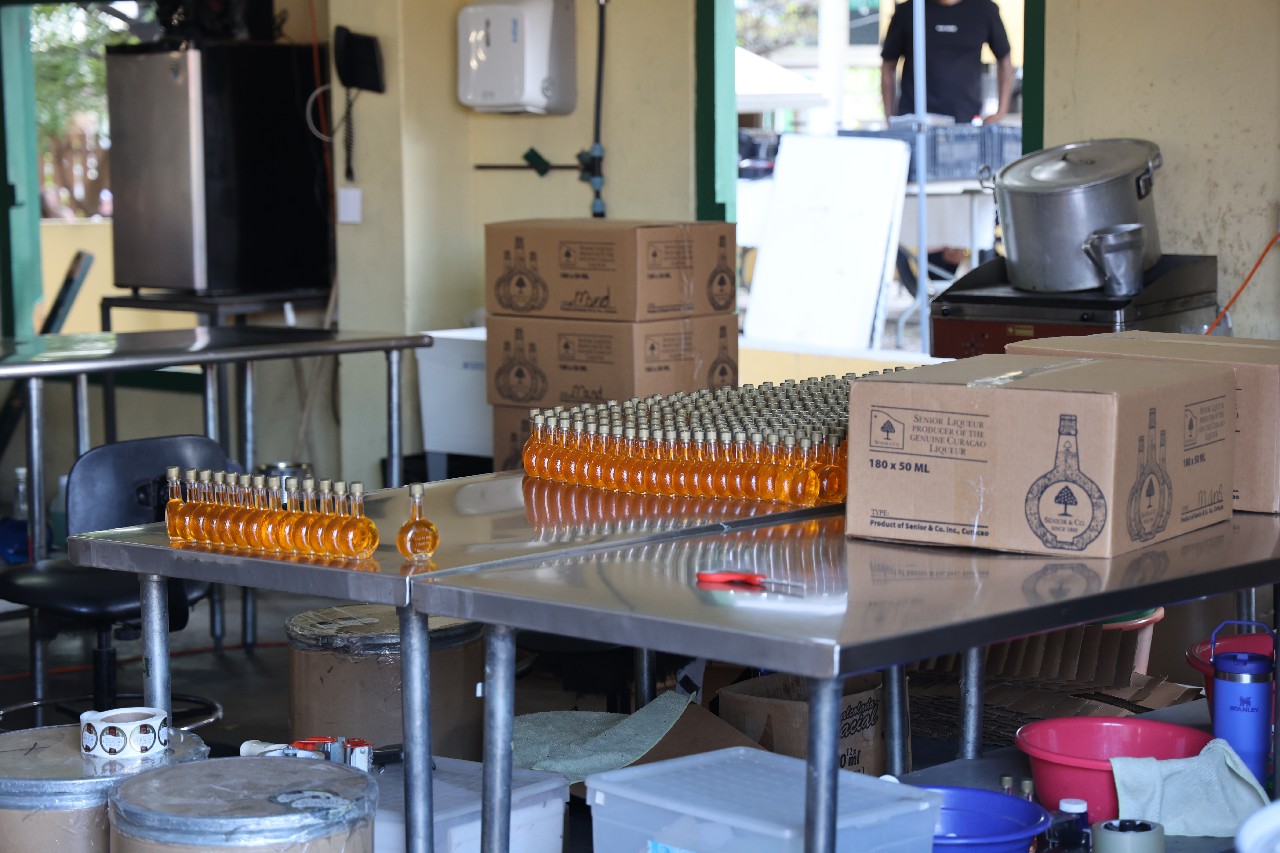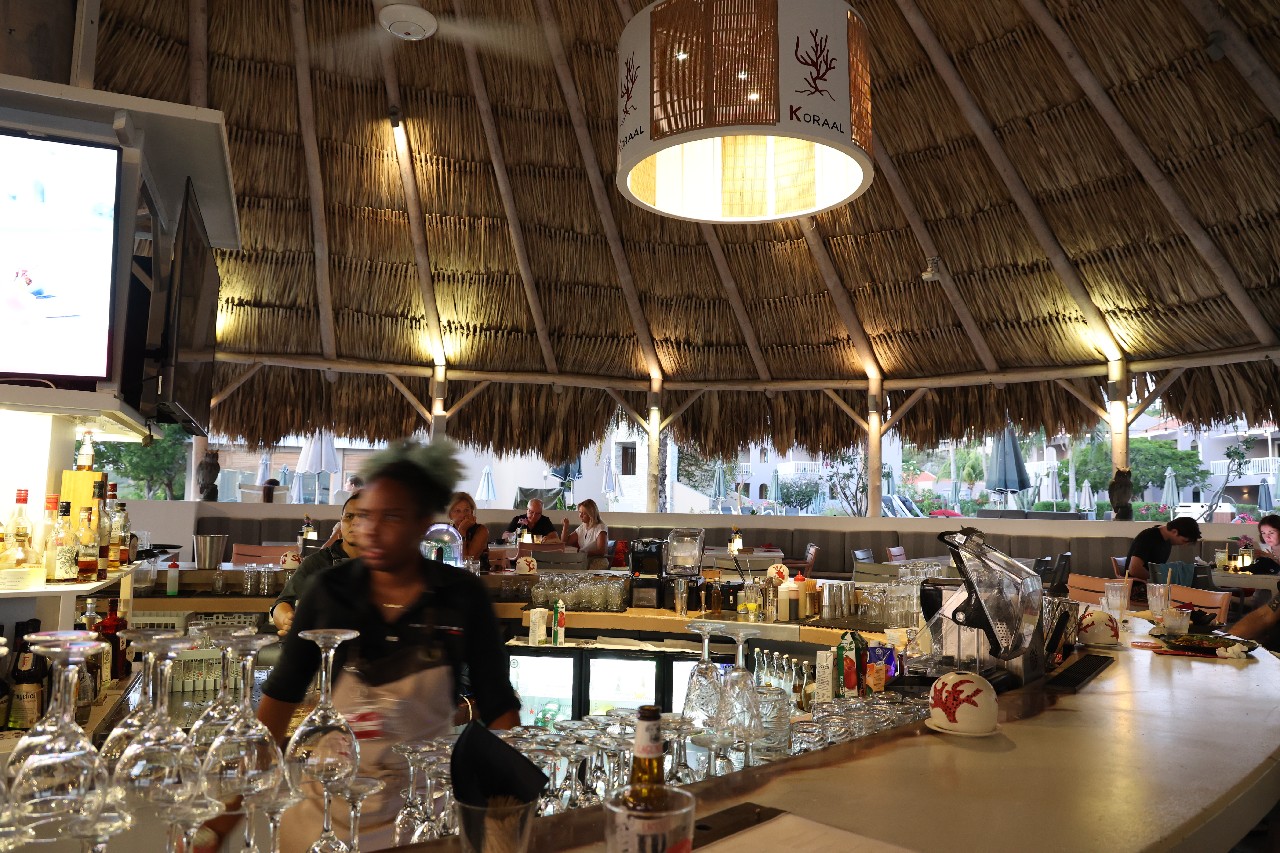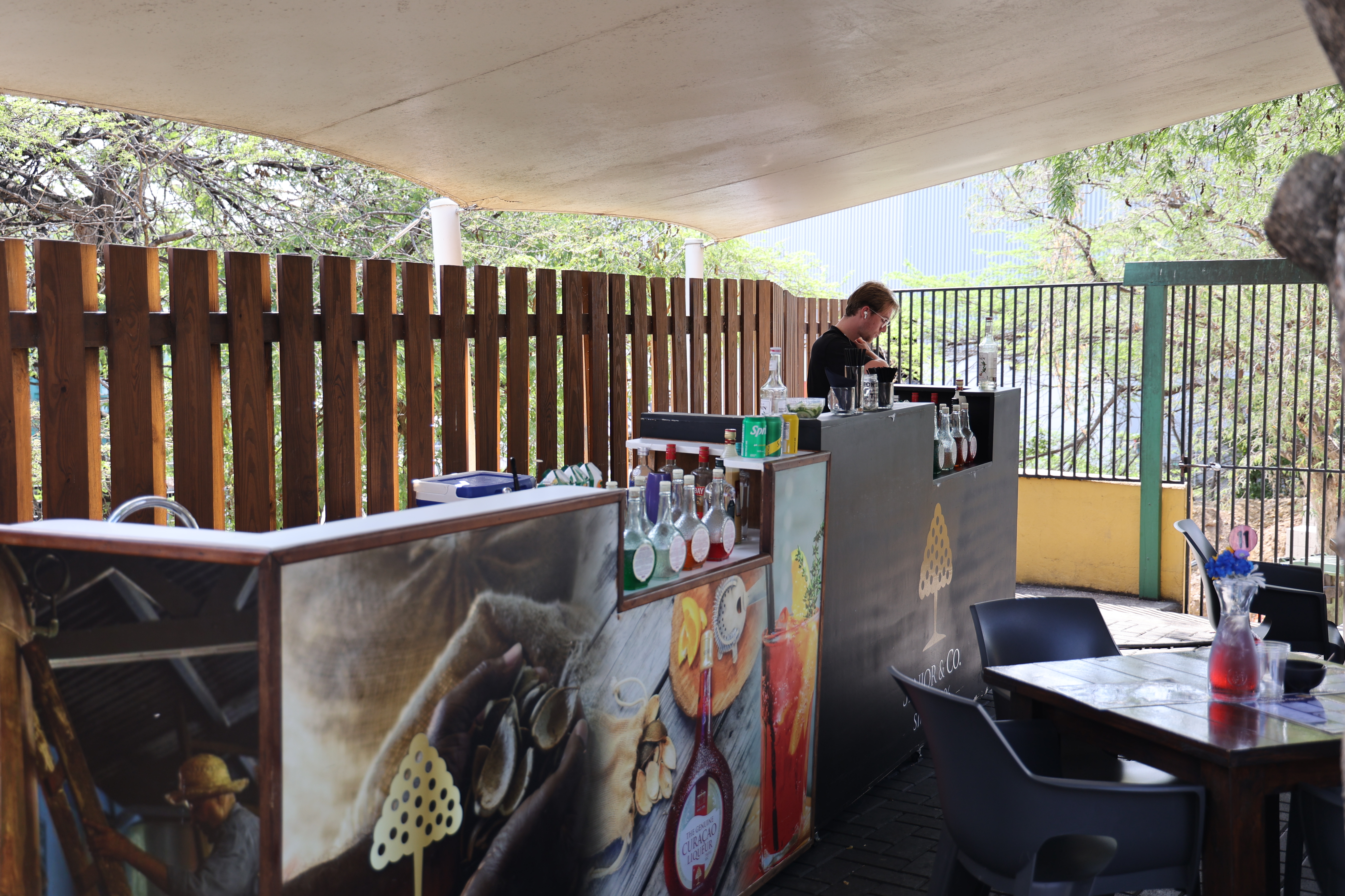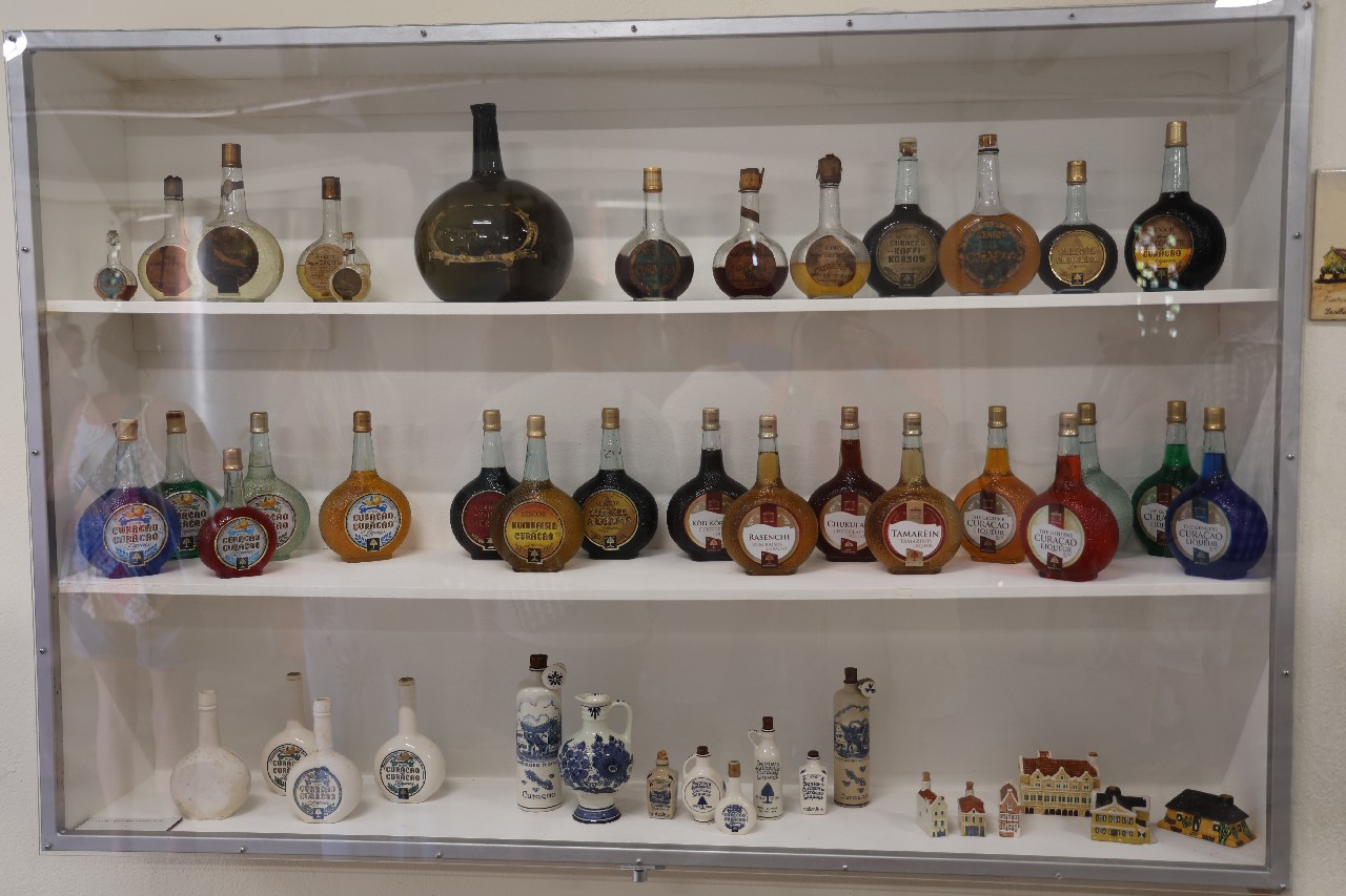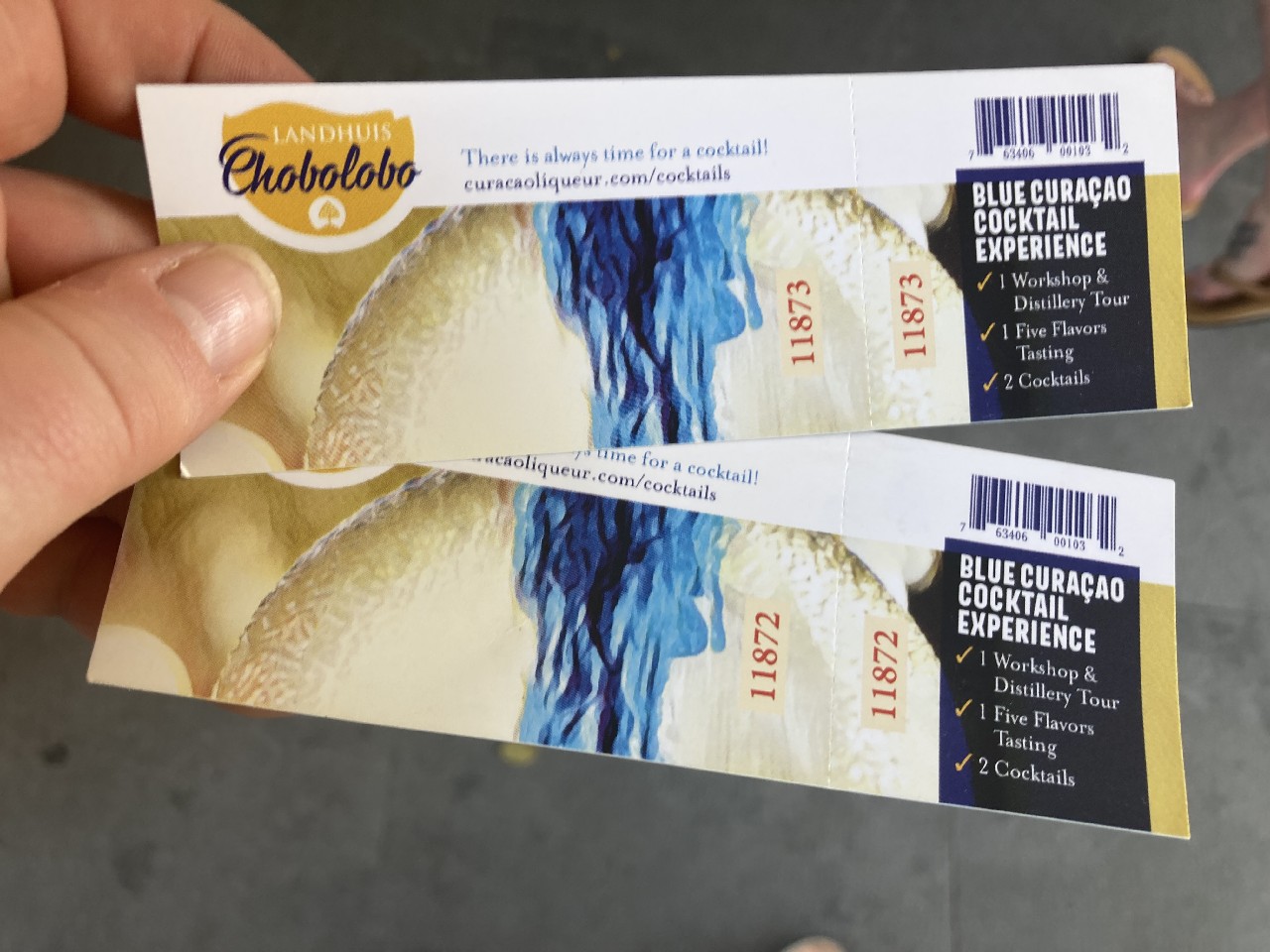 We had a 2 pm reservation at the Chobolobo Distillery, where they make the Blue Curacao liquor. We got there early, checked in, had our courtesy beverage and looked around a bit. Then we had the tour - led by Eli. He was excellent, and explained the whole process and history. The liquor is made from dried Lahara orange peels, and spices from Asia. The bottle itself is manufactured in Spain from recycled glass, made to resemble an orange in both shape and texture. The cork is made in Portugal and the seal is made in the US. The bottle labels are still stuck on by hand. But the liquor is still made in Curacao. The are multiple colors that are the same flavor, but colored differently to make different drinks. There are also additional flavors, including Chocolate, Coffee, Rum-Raisin, and Tamarind. We got to sample them all while we were there. Greta liked the tamarind and the rum-raisin the best and Mike liked the chocolate and coffee flavors. As part of our tour package, we also were presented with many different drink recipes using the Curacao liquors, and then were able to make and drink two. Our tour guide for this part was Imaisha and she was also great. She demonstrated all the tools we may need for making the drinks, how to use a mixing cup, and invited us all up to try out whatever recipes we wanted. Mike made a tamarind mule and a cucumber delight. Greta made the Red Lady Romance and the Tamarind Sunset. It was a LOT of fun! We left with a bottle of the coffee flavor liqour to have in our room.
