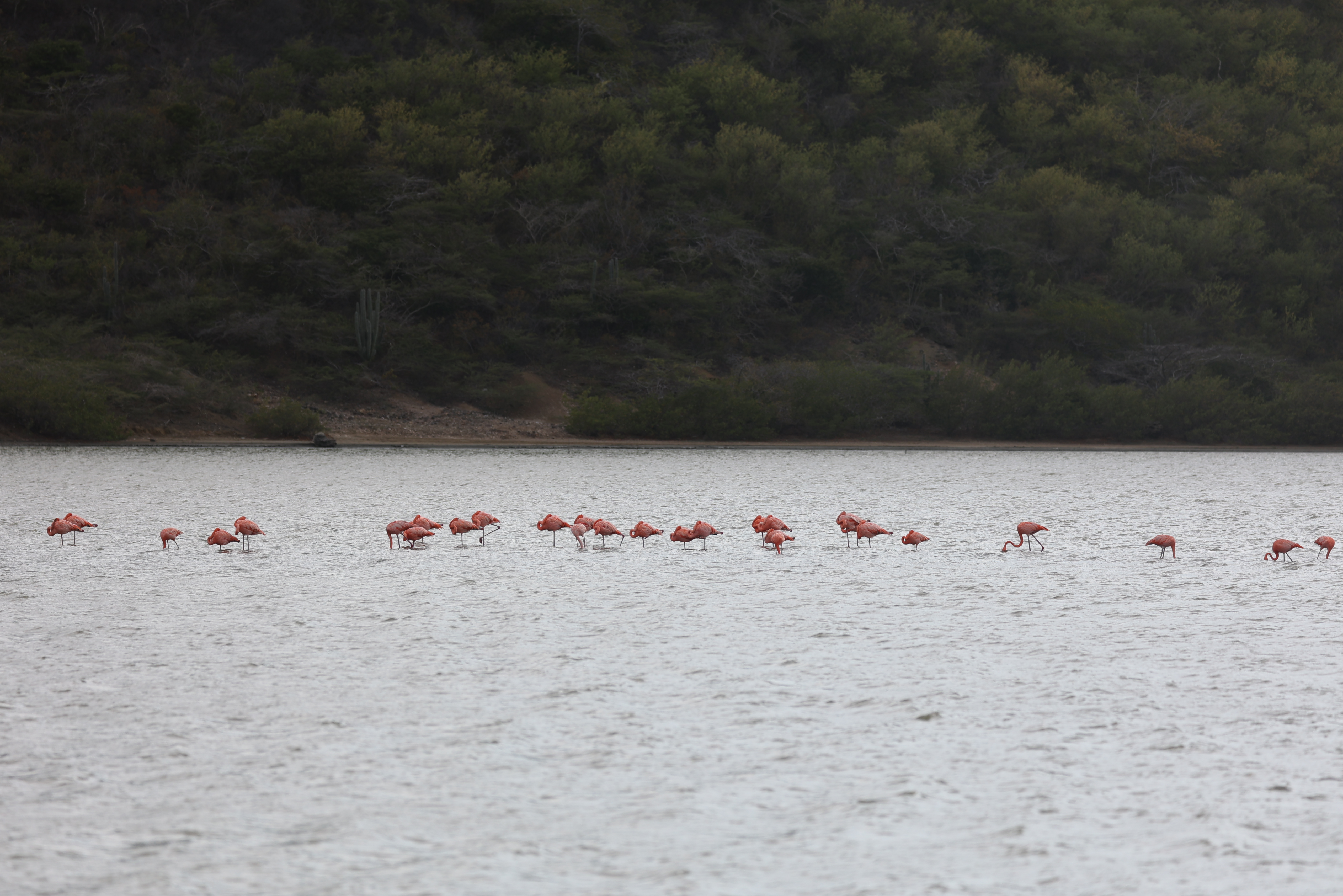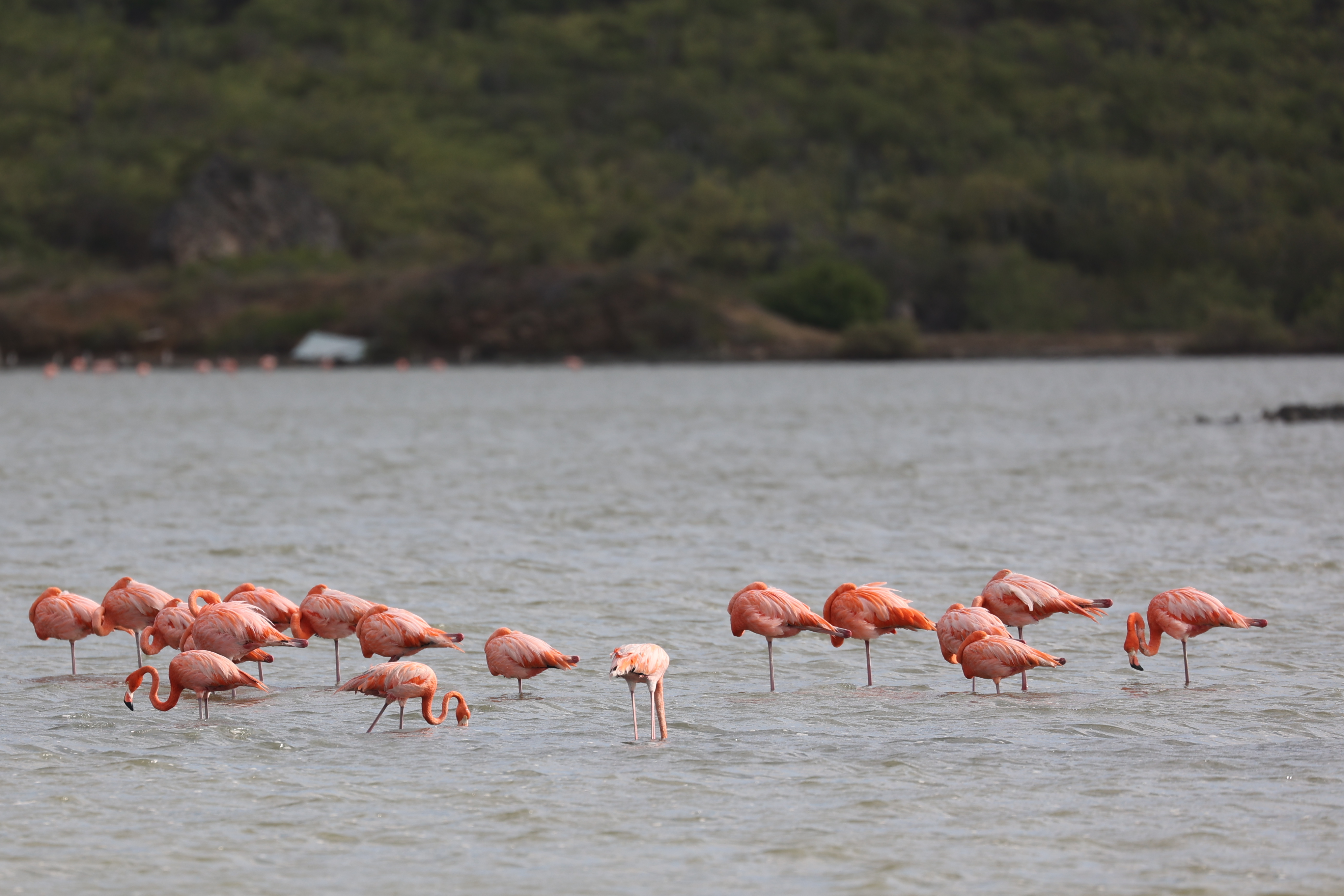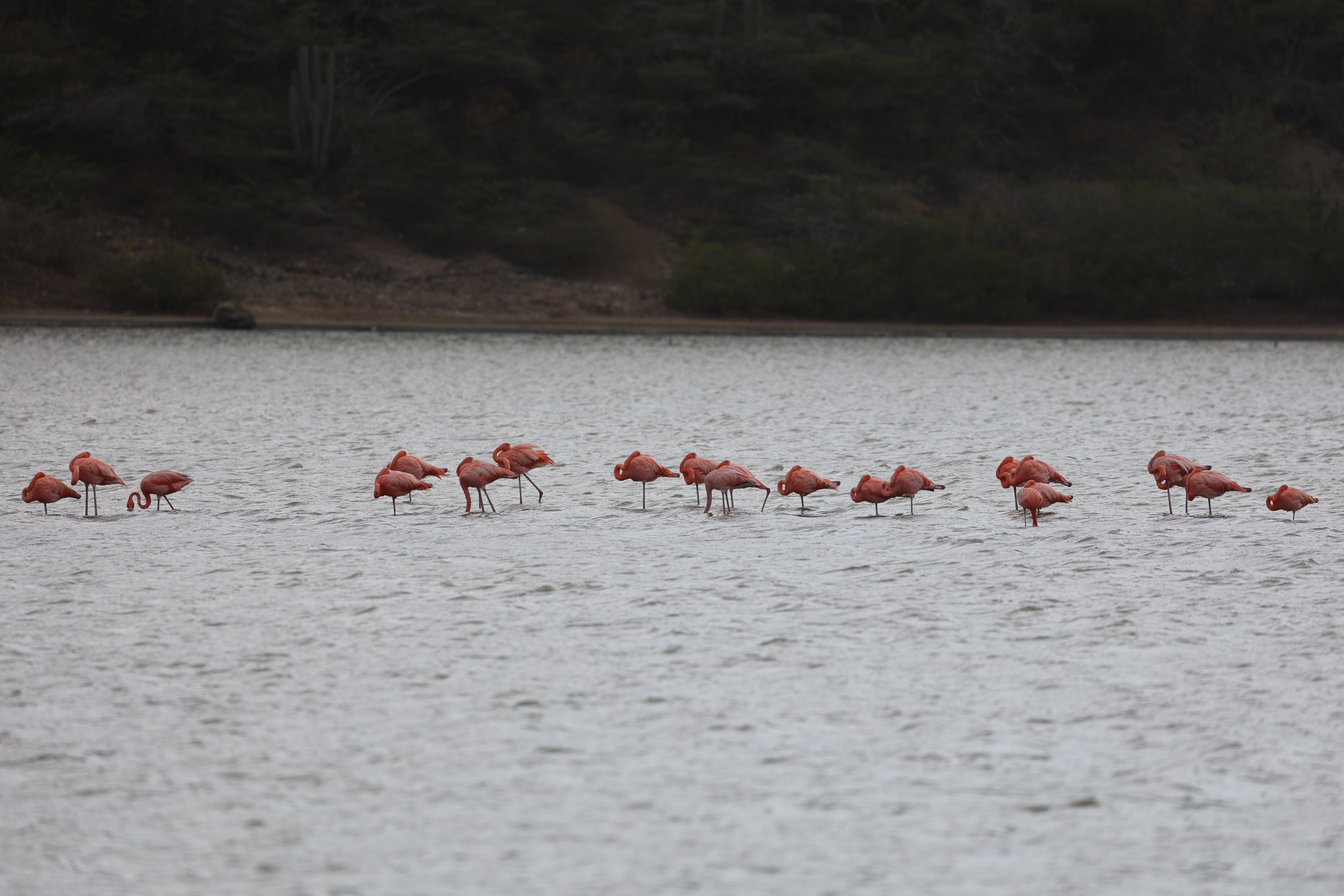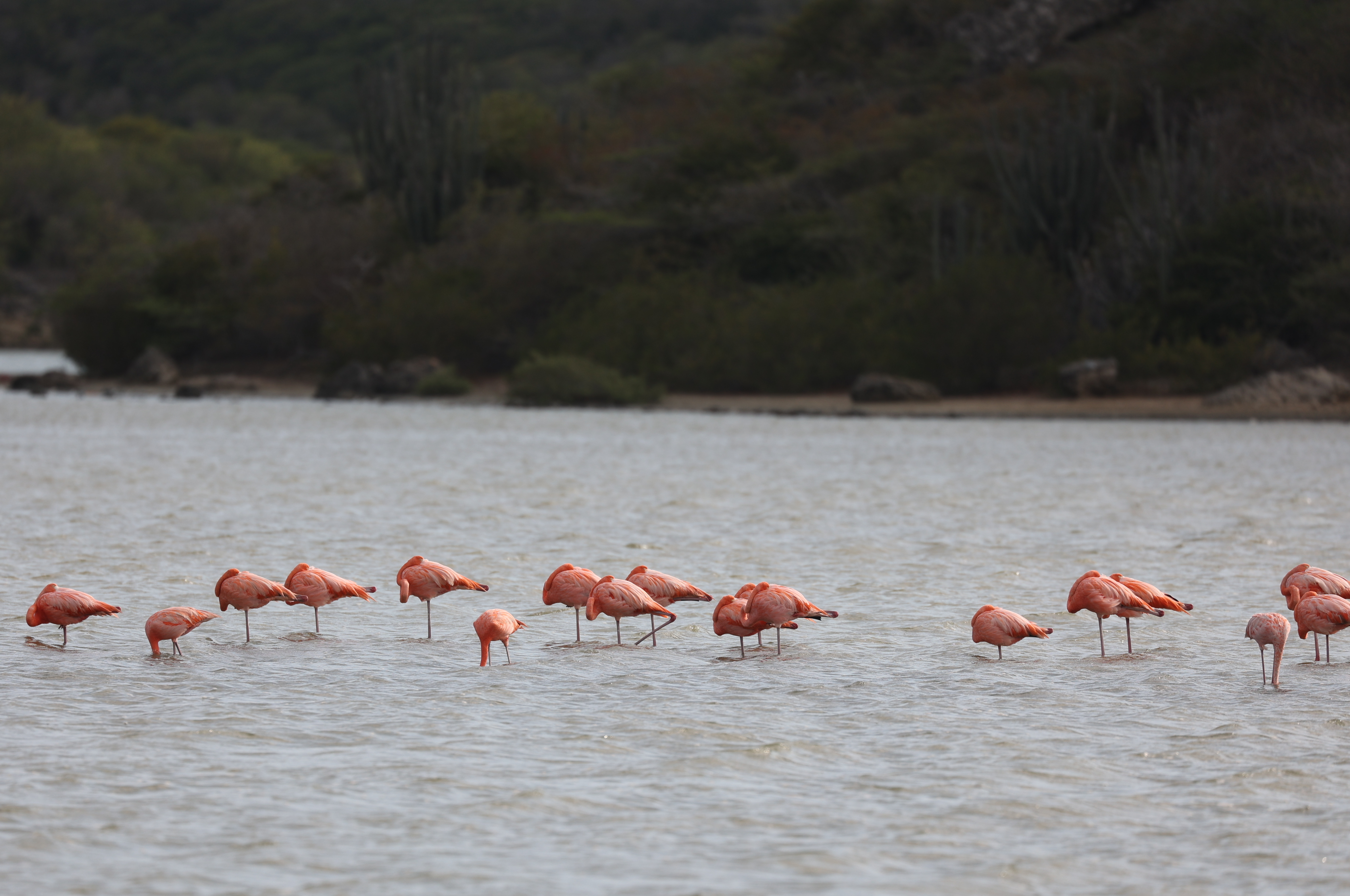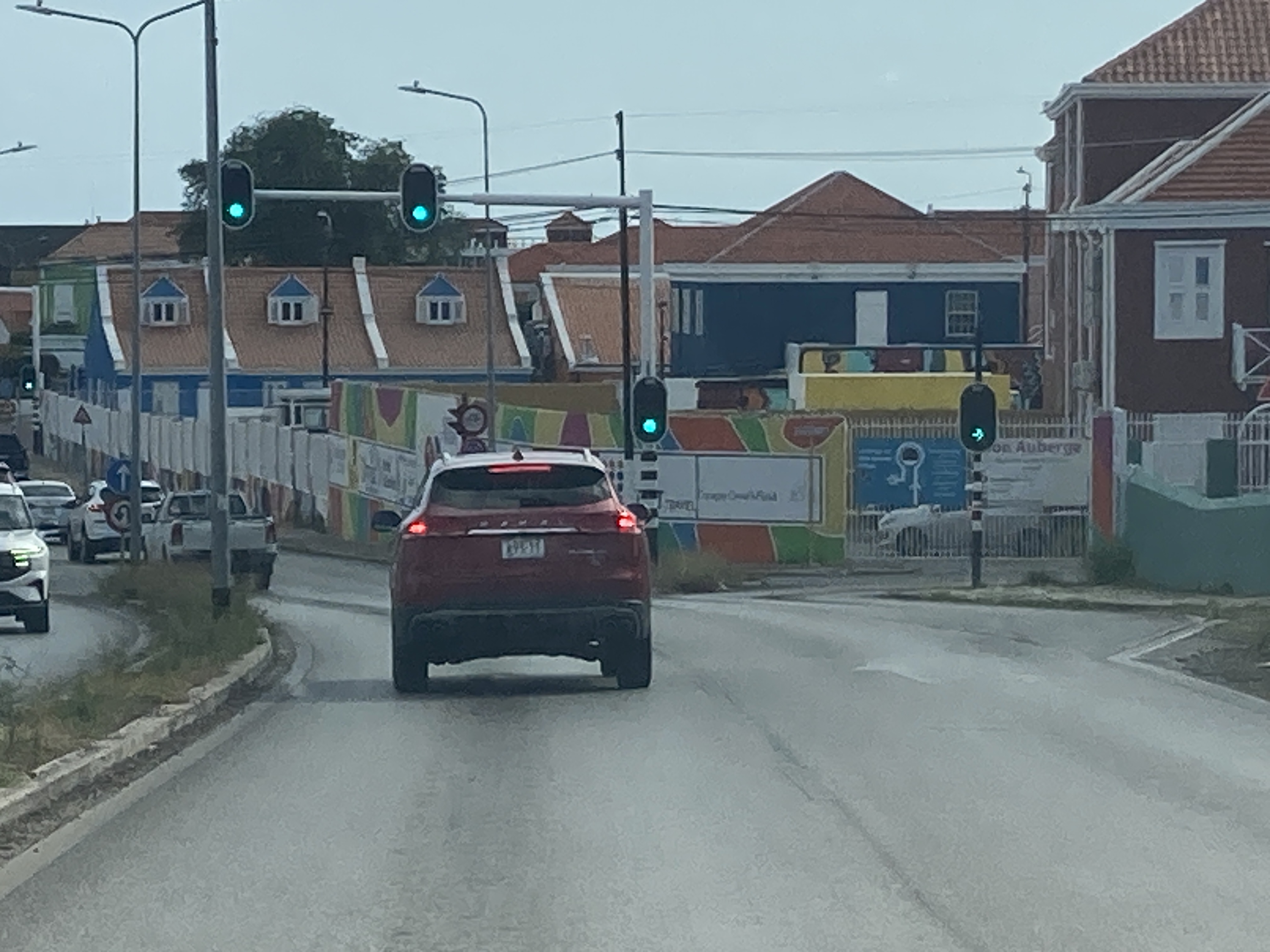From there, we stopped back at the hotel for a quick moment and then headed back out. We drove up further up the western shoreline, and had to take a picture of the city sign for Sint Michiel - complete with a dog who felt it was an excellent place to wait. We also were able to stop and see a large water inlet where flamingos can be found. And we found them! Most were further off shore, but some were close enough for Mike to get excellent pictures with the zoom lens. We then drove to the shoreline to see the sunset, but that was a couple hours off yet. So we navigated to a place further up the shore (with Google maps that were downloaded offline, we weren't using phone coverage). At one point, we commmented how the road looked brand new or at least newly paved. Then after by-passing the turn off for a gated community, we realized we were driving "off the map". Apparently the road was so new, it was not yet on Google. We turned around and drove toward the gated community - that happened to be where the sea-front restaraunt was located. We had to stop at a guard shack but after explaining we were headed for the restaurant, they waved us through. There was parking and pictures of condos for sale, and houses you could build and buy. They were NOT cheap to say the least! We walked down to the shoreline and looked at the water for a bit. The restaurant there was rather expensive and we weren't quite ready for dinner yet. We walked back up the stairs to Koraal Rooftop Terrace, and had a couple of beers and bitterballen. From there we watched the sunset - perfect.