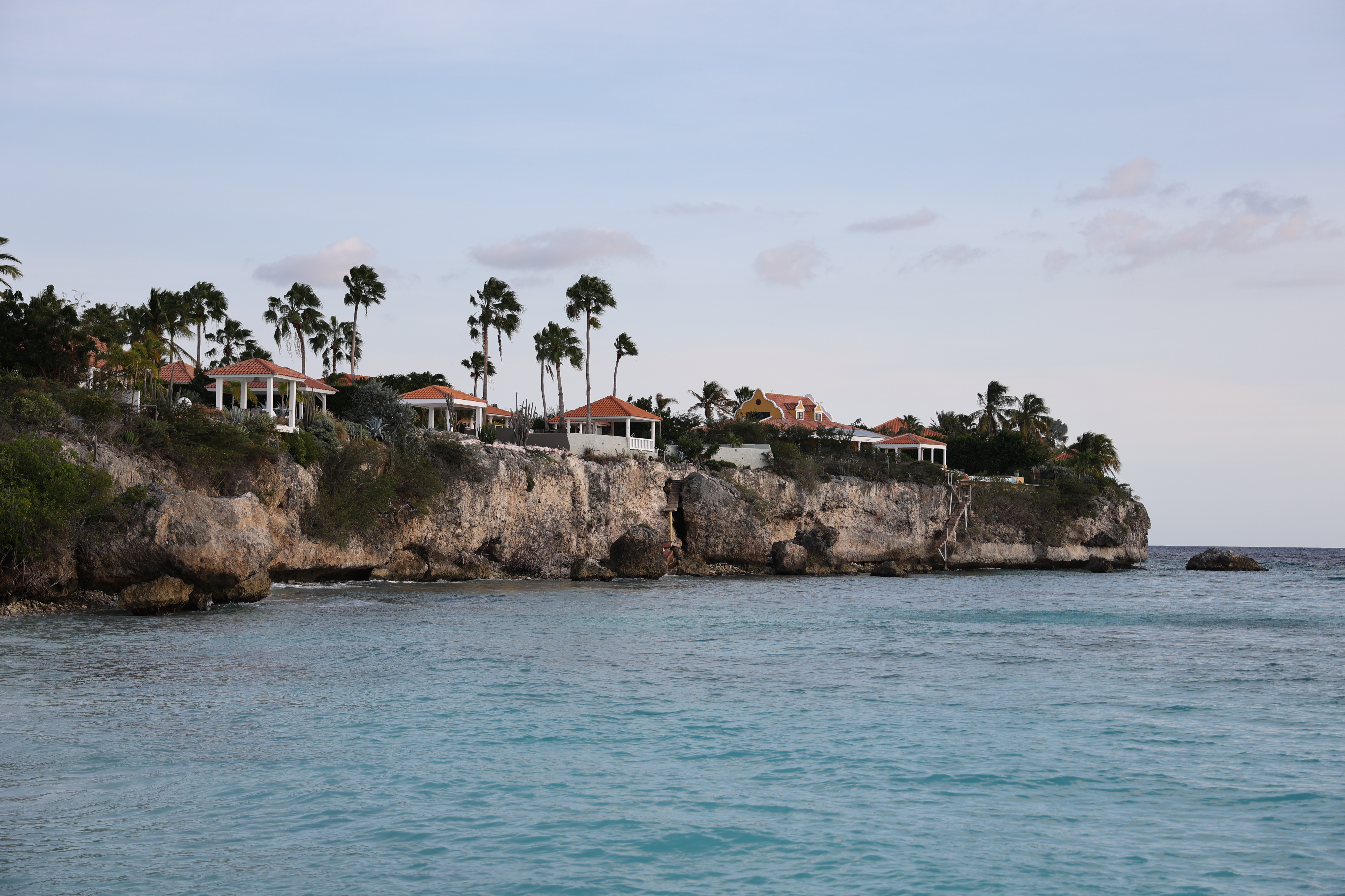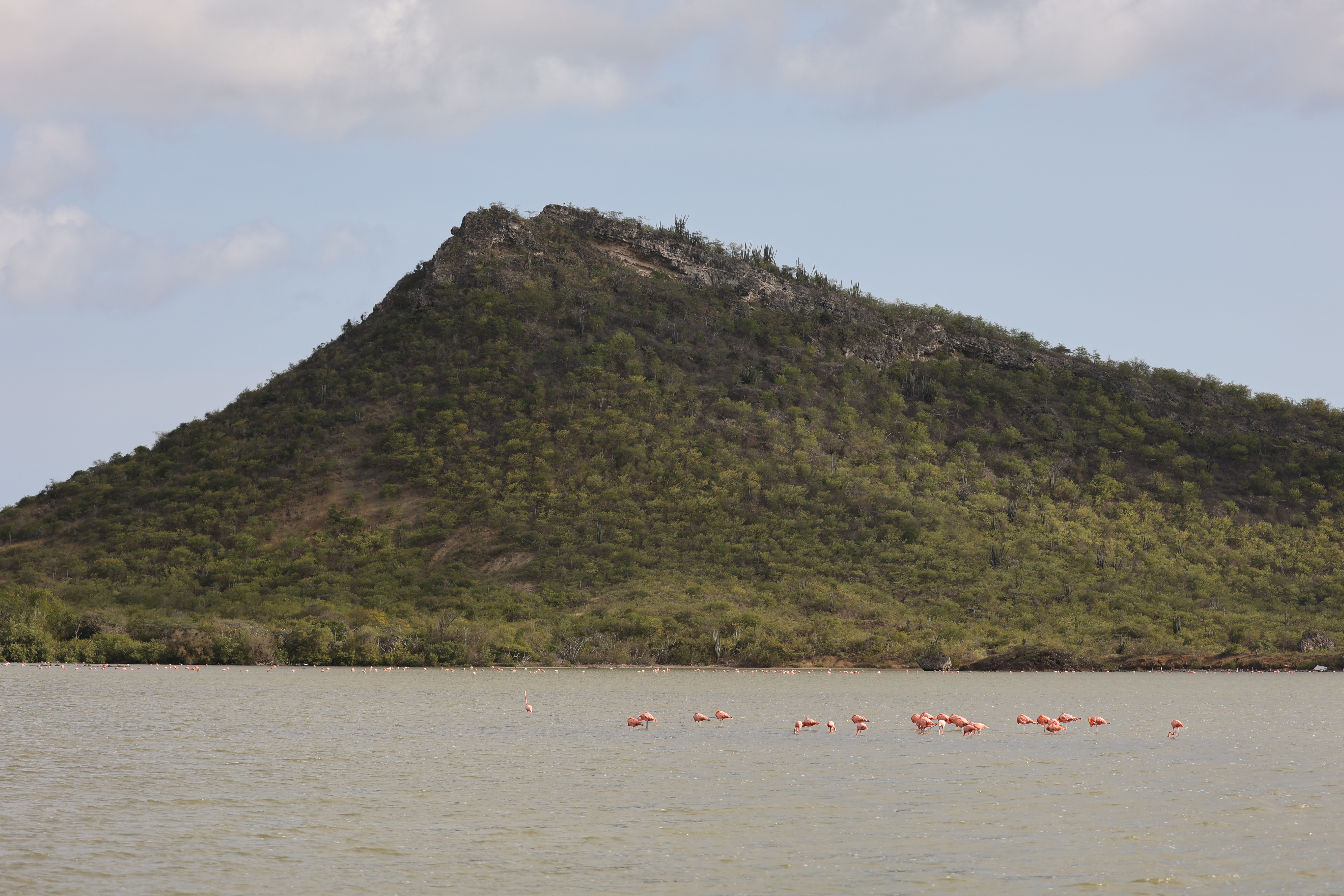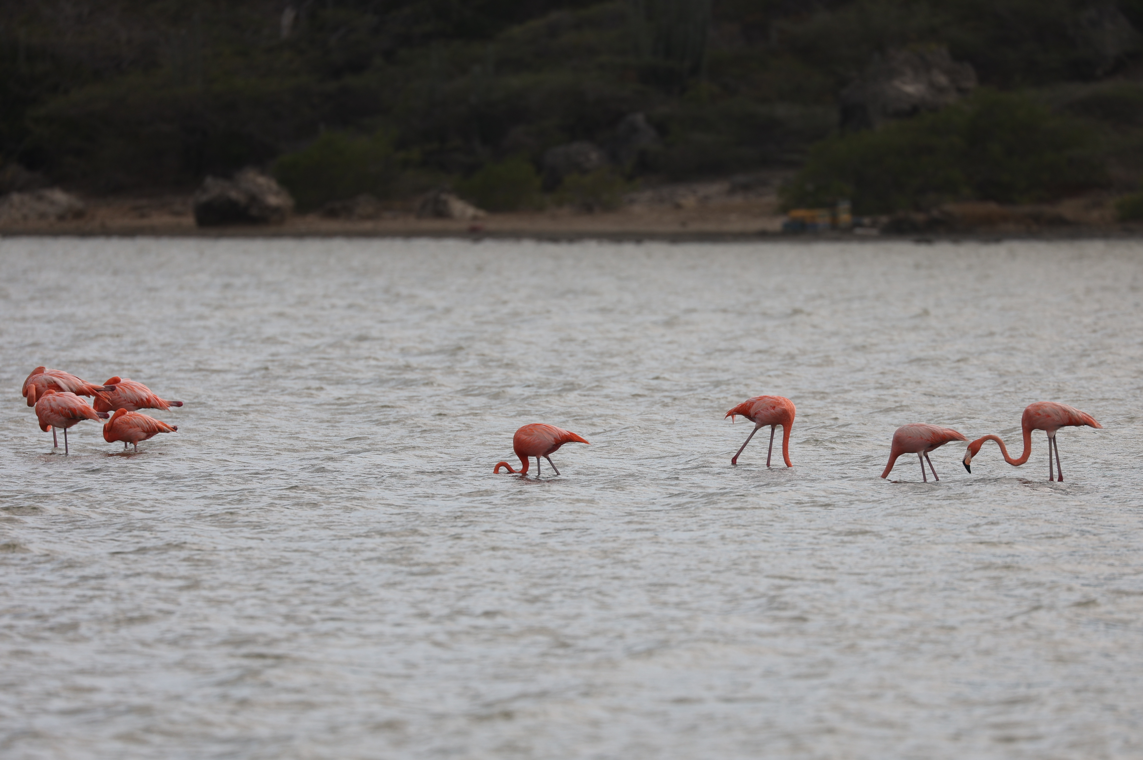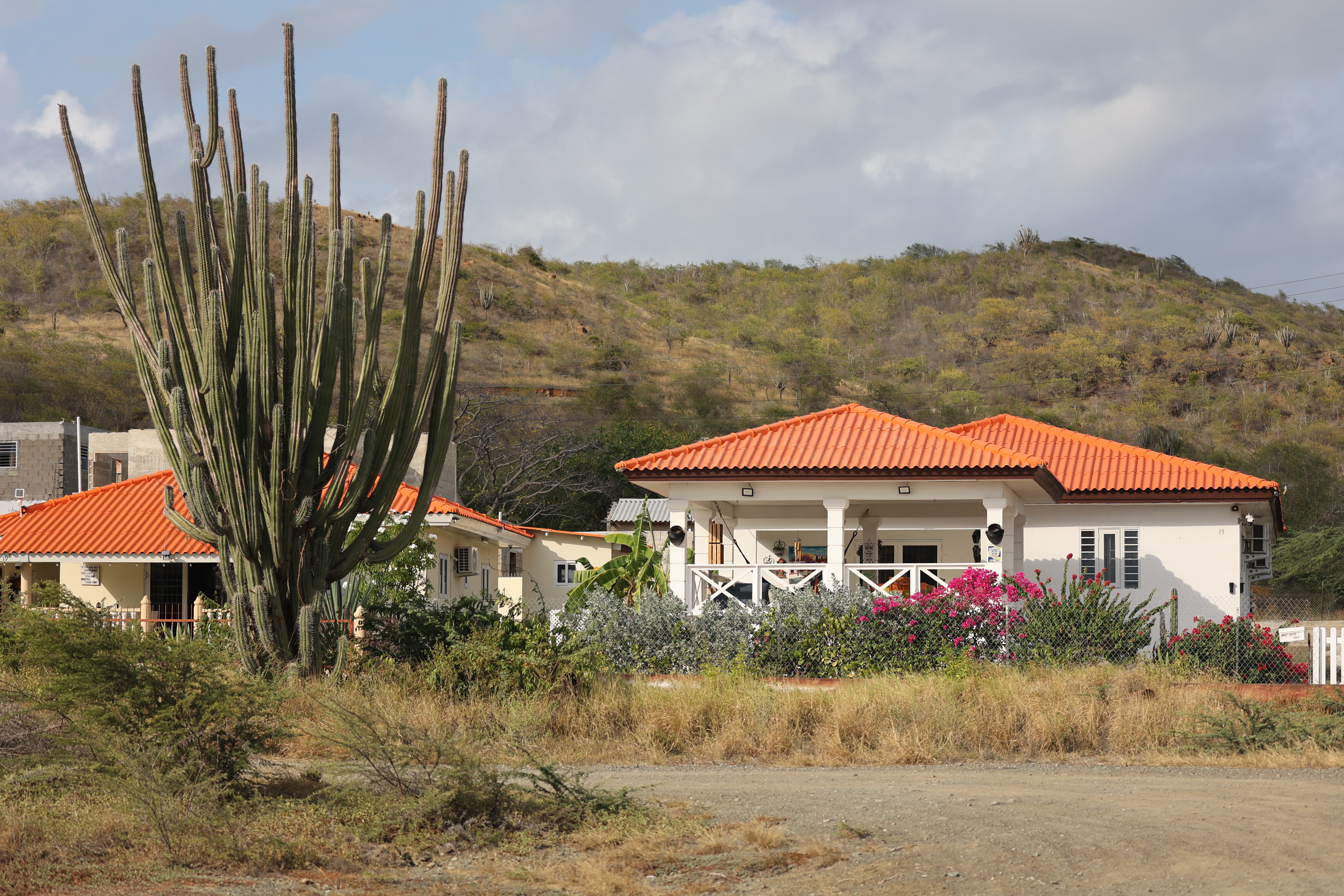 From there, we stopped back at the hotel for a quick moment and then headed back out. We drove up further up the western shoreline, and had to take a picture of the city sign for Sint Michiel - complete with a dog who felt it was an excellent place to wait. We also were able to stop and see a large water inlet where flamingos can be found. And we found them! Most were further off shore, but some were close enough for Mike to get excellent pictures with the zoom lens. We then drove to the shoreline to see the sunset, but that was a couple hours off yet. So we navigated to a place further up the shore (with Google maps that were downloaded offline, we weren't using phone coverage). At one point, we commmented how the road looked brand new or at least newly paved. Then after by-passing the turn off for a gated community, we realized we were driving "off the map". Apparently the road was so new, it was not yet on Google. We turned around and drove toward the gated community - that happened to be where the sea-front restaraunt was located. We had to stop at a guard shack but after explaining we were headed for the restaurant, they waved us through. There was parking and pictures of condos for sale, and houses you could build and buy. They were NOT cheap to say the least! We walked down to the shoreline and looked at the water for a bit. The restaurant there was rather expensive and we weren't quite ready for dinner yet. We walked back up the stairs to Koraal Rooftop Terrace, and had a couple of beers and bitterballen. From there we watched the sunset - perfect.