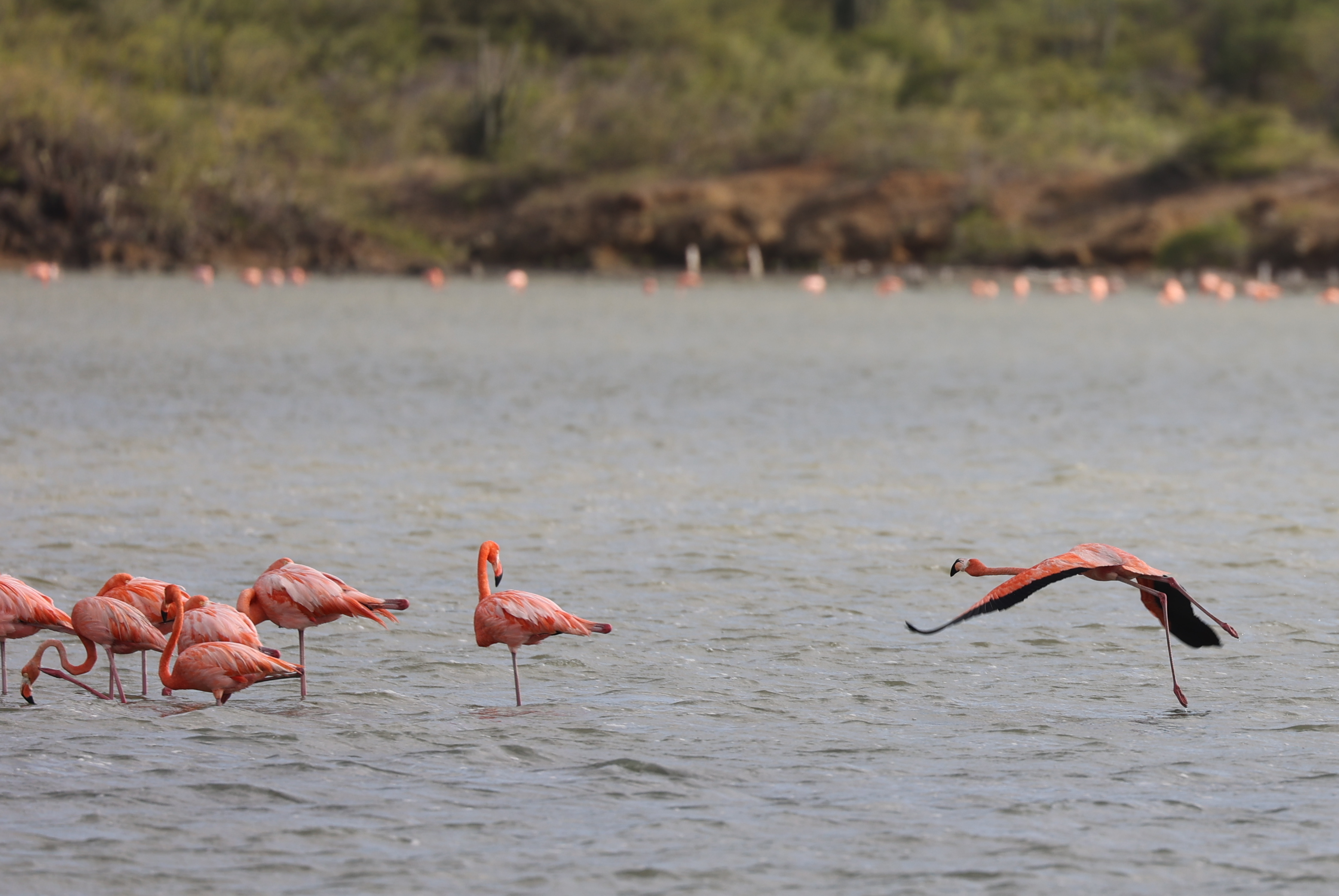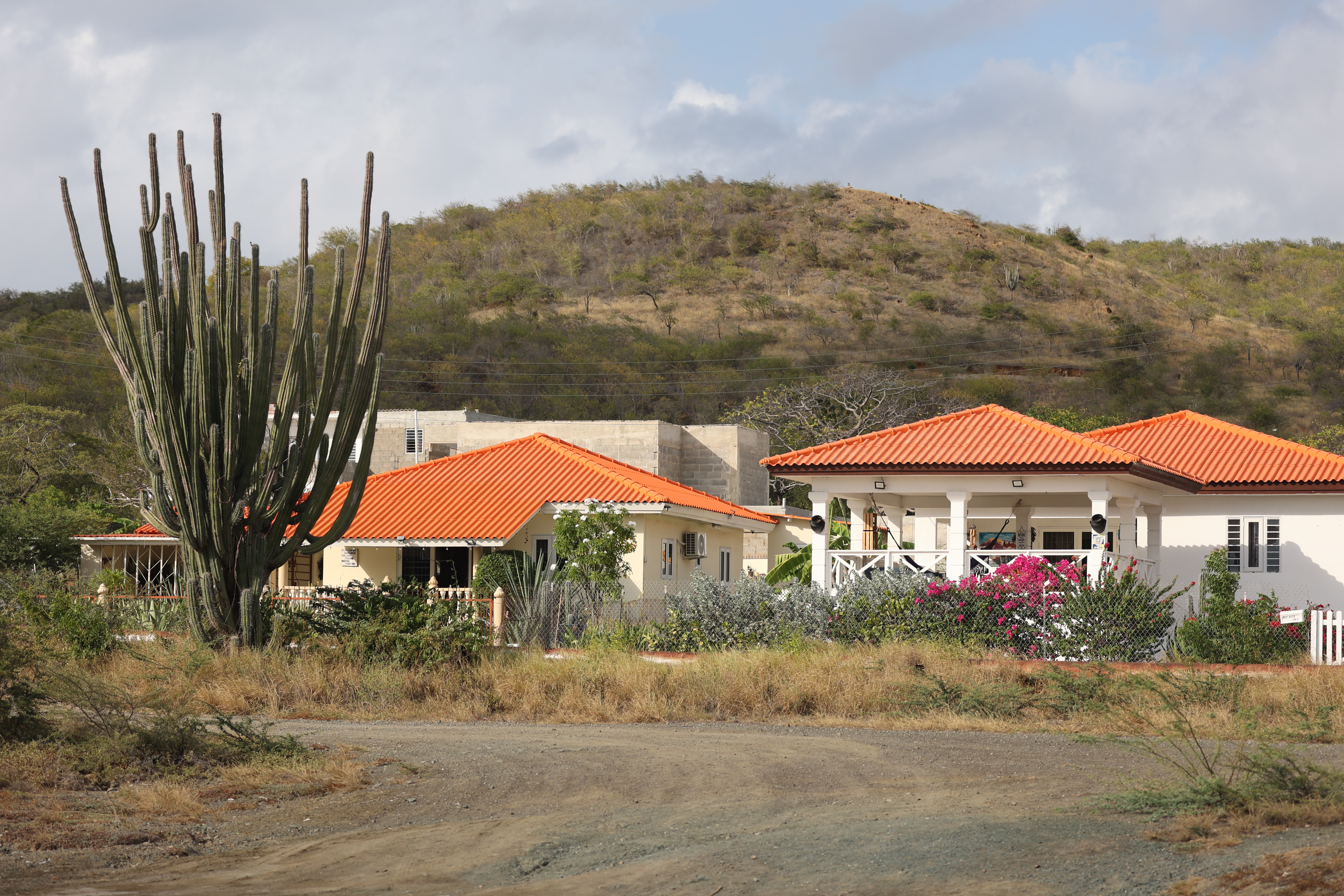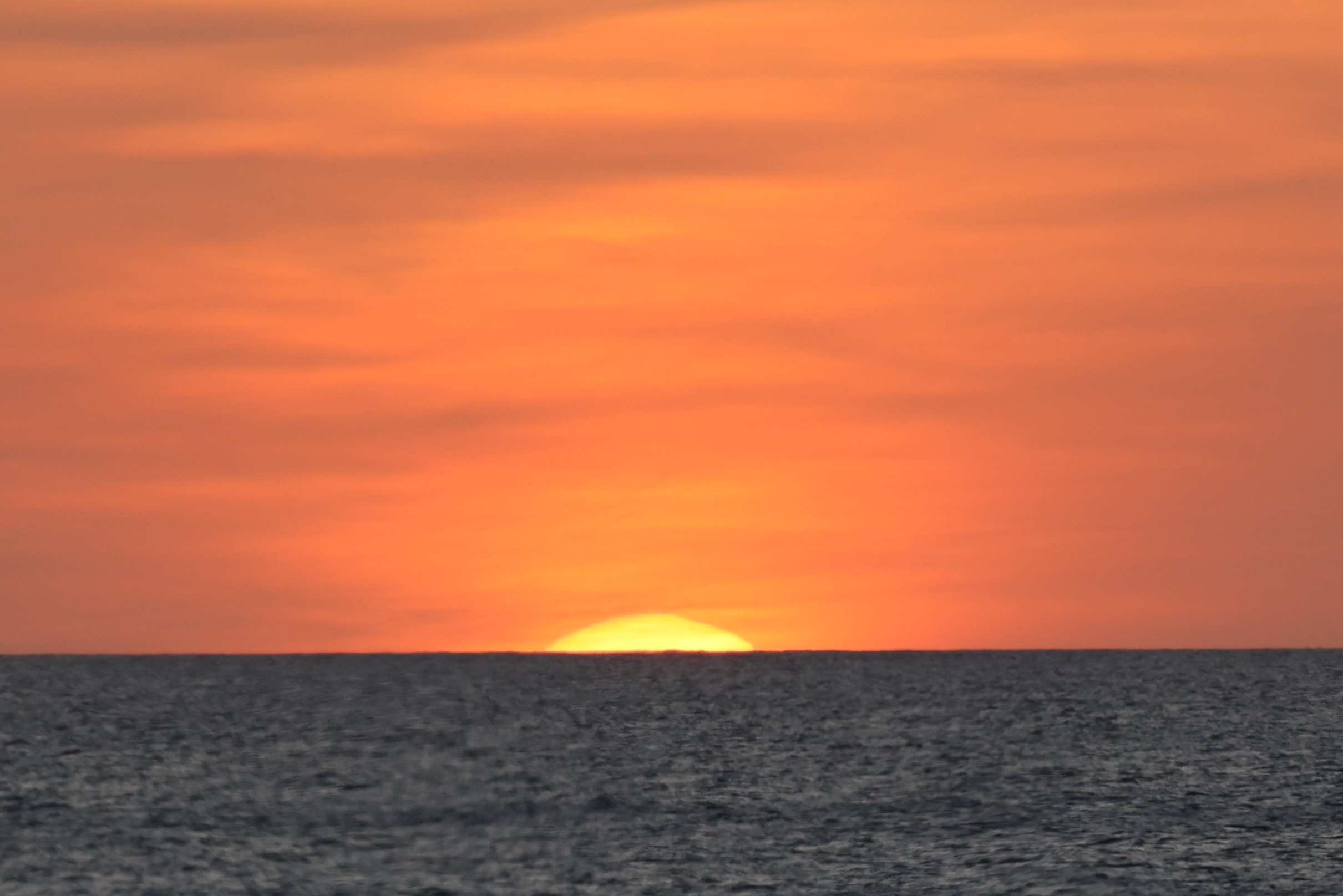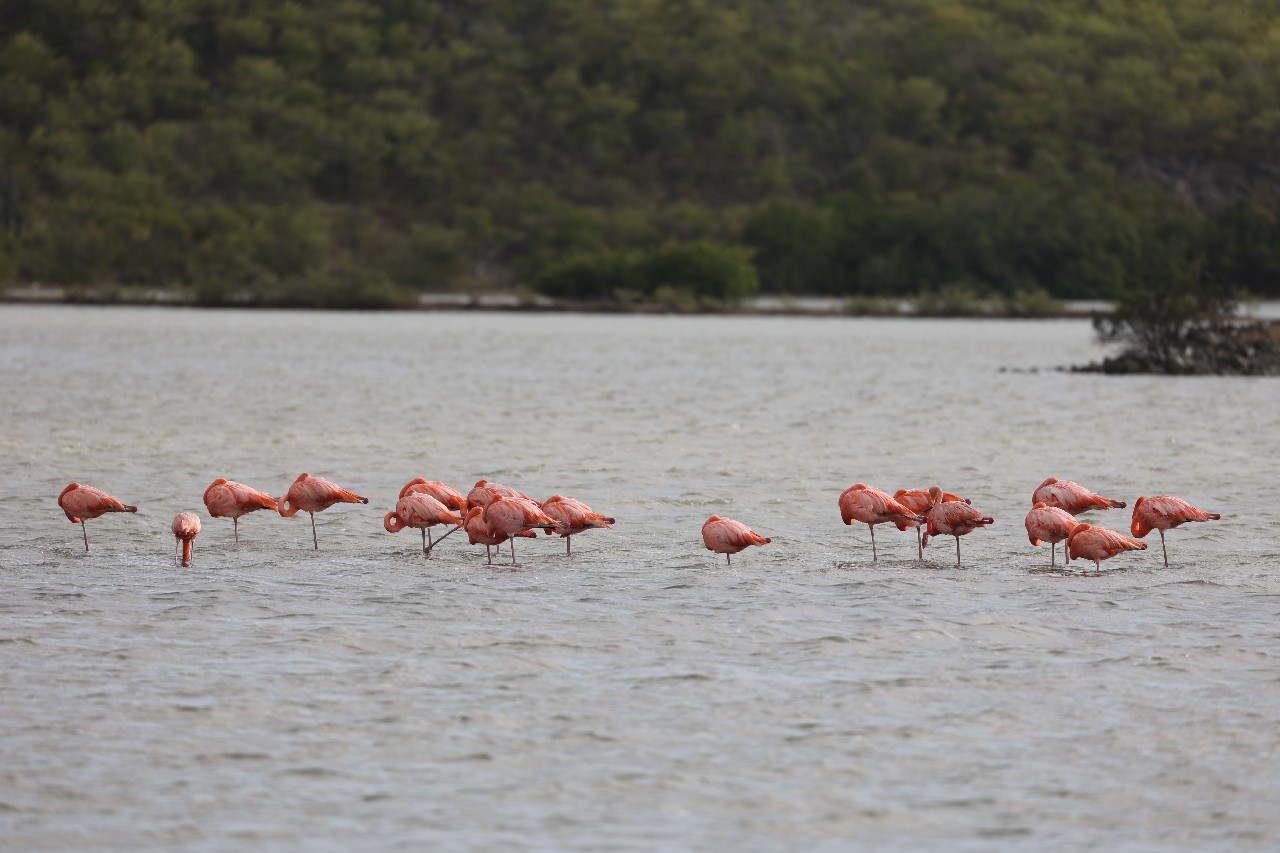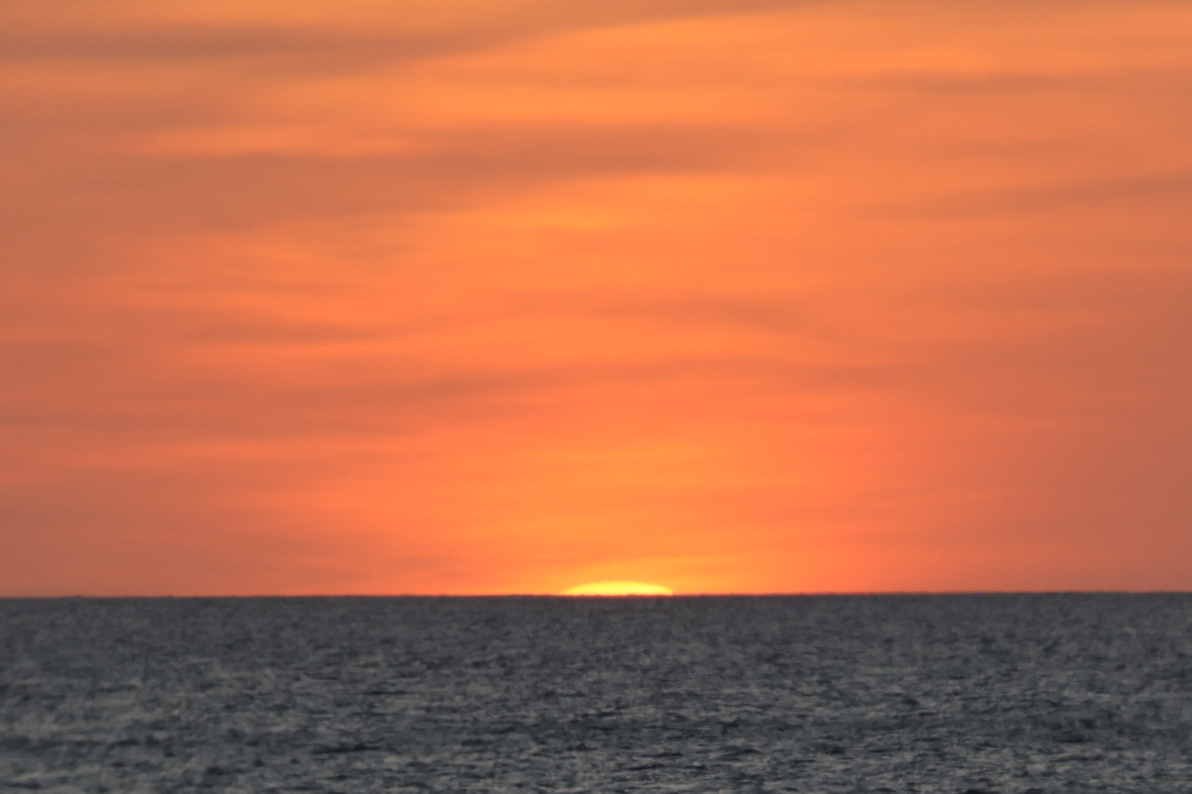 From there, we stopped back at the hotel for a quick moment and then headed back out. We drove up further up the western shoreline, and had to take a picture of the city sign for Sint Michiel - complete with a dog who felt it was an excellent place to wait. We also were able to stop and see a large water inlet where flamingos can be found. And we found them! Most were further off shore, but some were close enough for Mike to get excellent pictures with the zoom lens. We then drove to the shoreline to see the sunset, but that was a couple hours off yet. So we navigated to a place further up the shore (with Google maps that were downloaded offline, we weren't using phone coverage). At one point, we commmented how the road looked brand new or at least newly paved. Then after by-passing the turn off for a gated community, we realized we were driving "off the map". Apparently the road was so new, it was not yet on Google. We turned around and drove toward the gated community - that happened to be where the sea-front restaraunt was located. We had to stop at a guard shack but after explaining we were headed for the restaurant, they waved us through. There was parking and pictures of condos for sale, and houses you could build and buy. They were NOT cheap to say the least! We walked down to the shoreline and looked at the water for a bit. The restaurant there was rather expensive and we weren't quite ready for dinner yet. We walked back up the stairs to Koraal Rooftop Terrace, and had a couple of beers and bitterballen. From there we watched the sunset - perfect.