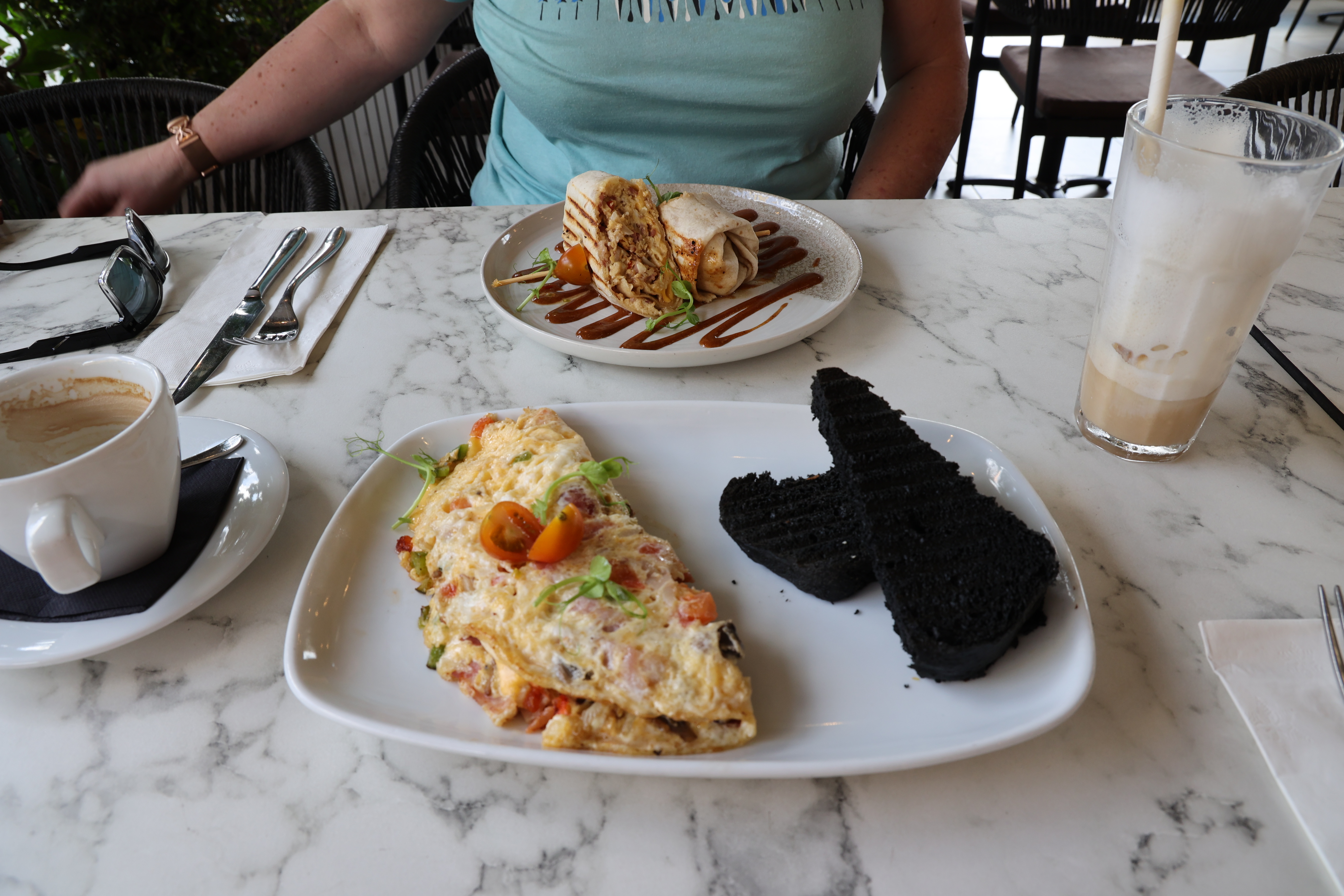 We started out the day by driving up to Java Cafe for breakfast, and it was great. It was in a shopping area just off of a busy road, but it was pleasantly quiet in the shaded outdoor terrace where we sat. We both ordered a coffee (espresso for Mike, iced latte for Greta) and it was great. For food, Mike had an everything omelette with bacon and Greta had a breakfast burrito. The food also was wonderful, and we had some busy little birds flitting around to entertain us as well. From there, we figured out where the distillery was for our tour later that day, and then drove back to the hotel.