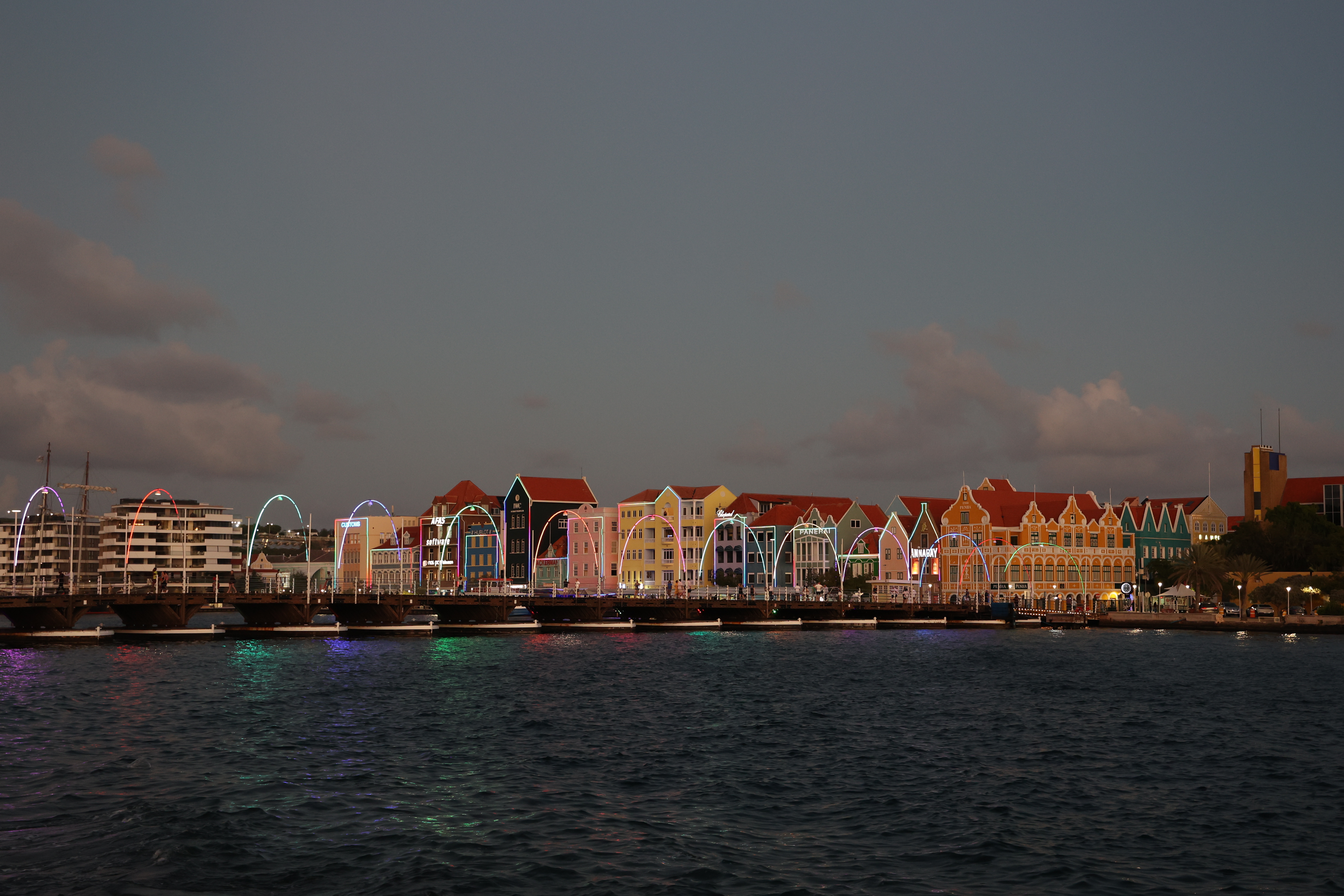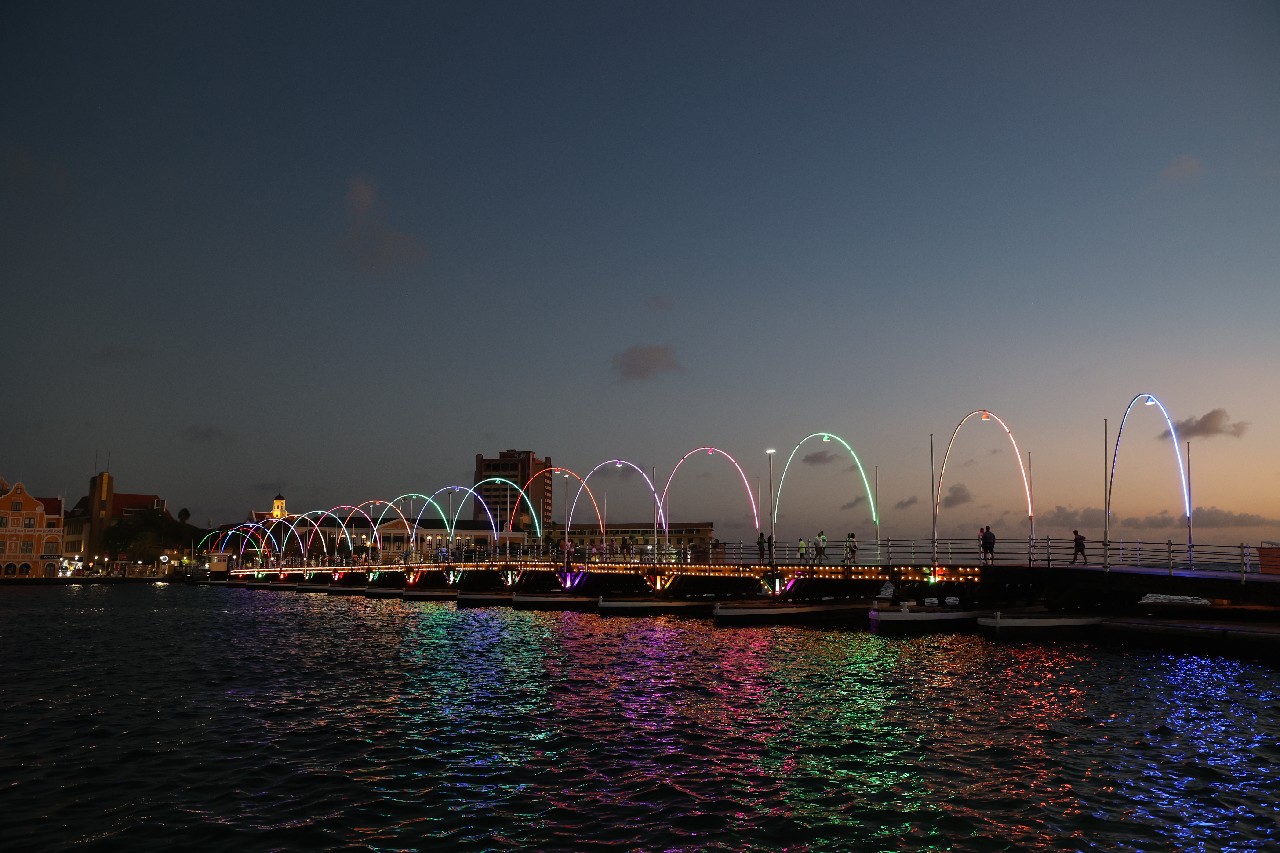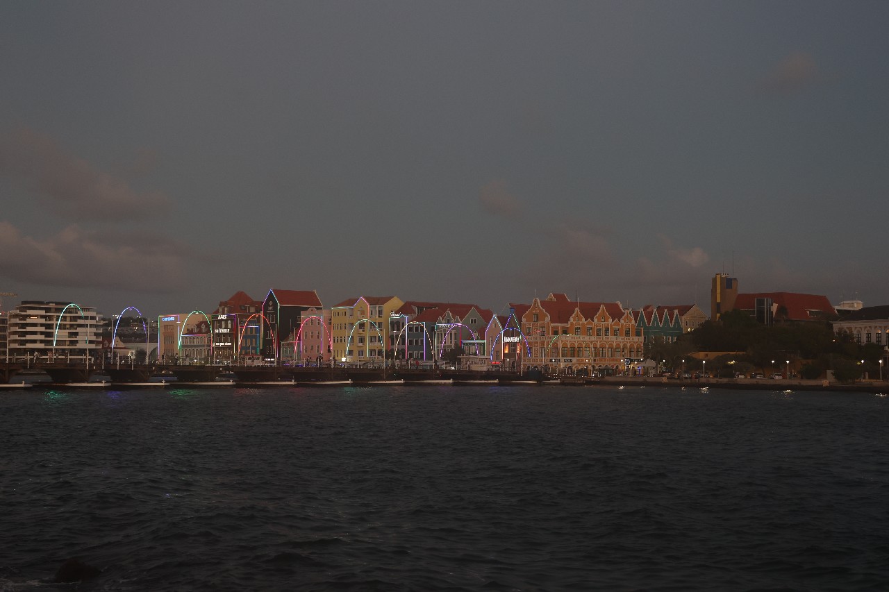 We walked down to the Queen Emma Bridge and Mike got some more pictures. We walked along the waterway until we started up a hill and found what we figured out later was the old cruise ship terminal. The new one is right outside of our hotel. From there, we got to Maira's Kitchen a bit early, but they were still able to seat us outside in a covered patio. Mike ordered the goat stoba, which is a native Curacao dish. It's a bit like stew, and was accompanied by some pickled veggies, rice, and a salsa-like sambal; it was excellent. Greta ordered the Red Snapper filet that came with veggies and fries; not as good as Mike's but still excellent. After that we walked down to our hotel, watched a little bit of the Olympics and called it a night.
