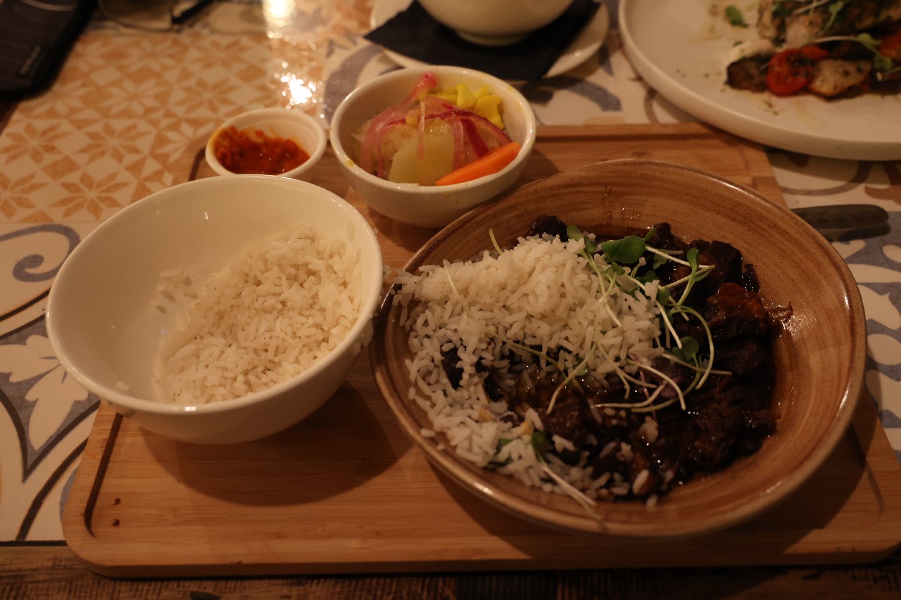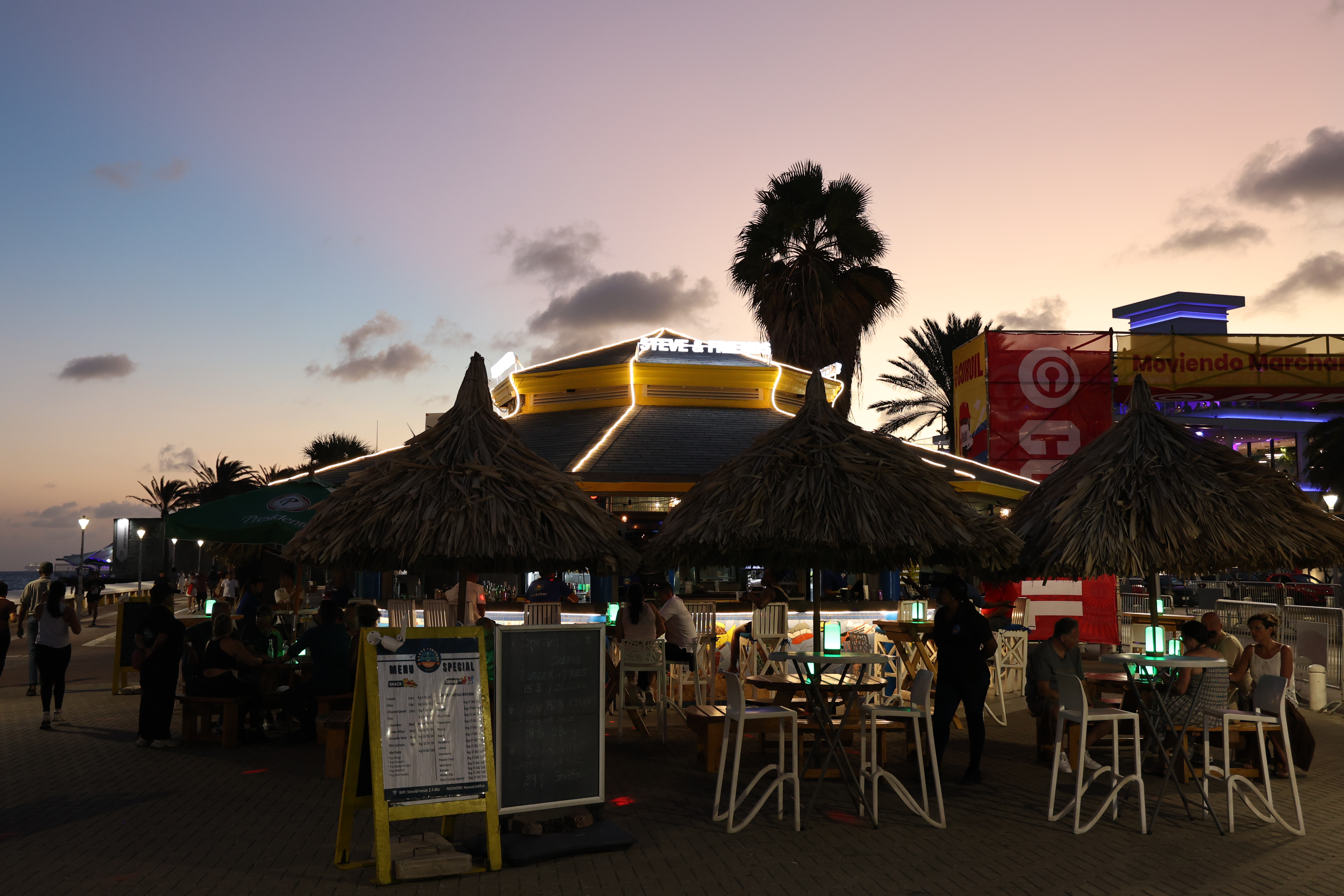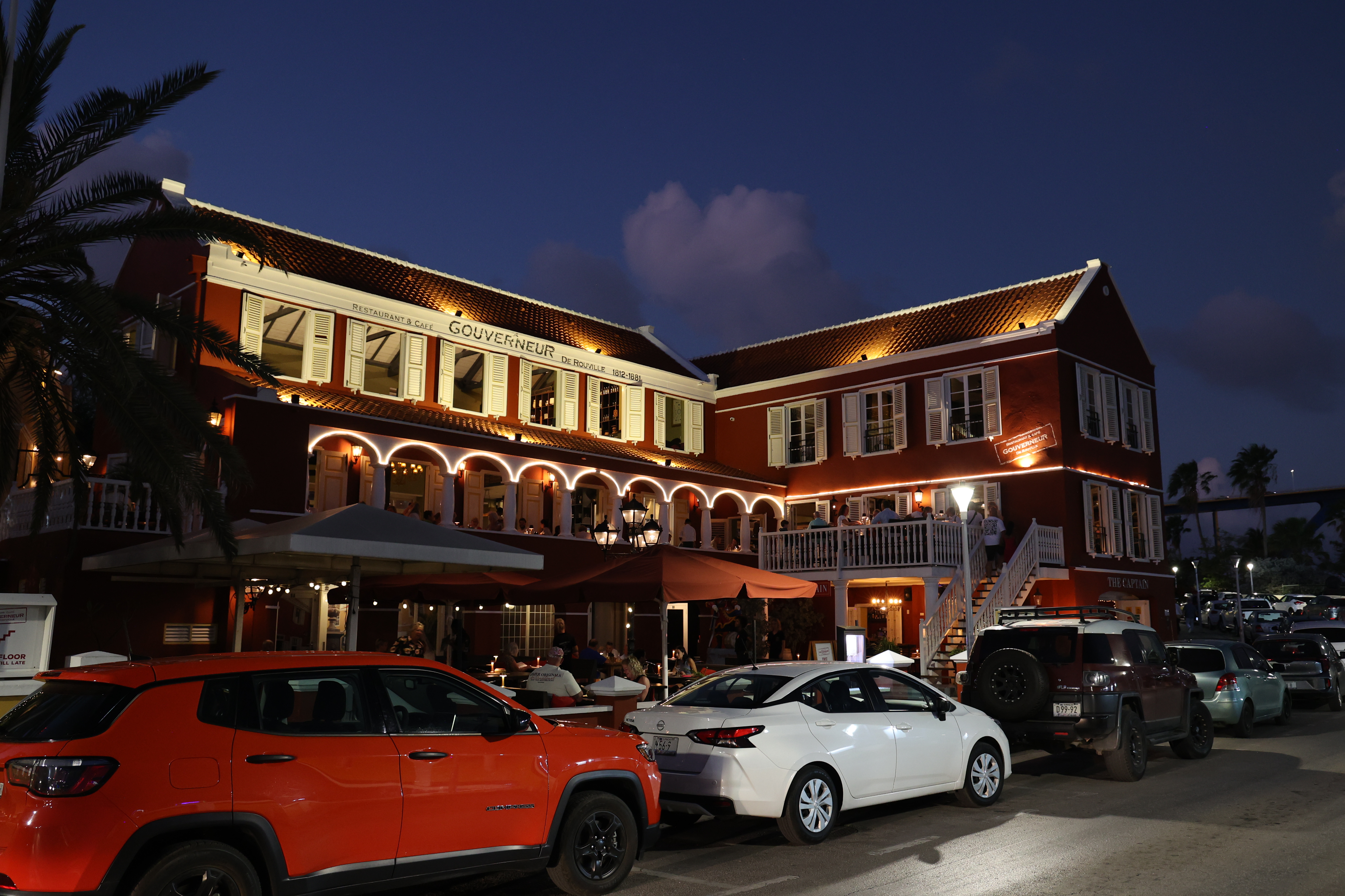We walked down to the Queen Emma Bridge and Mike got some more pictures. We walked along the waterway until we started up a hill and found what we figured out later was the old cruise ship terminal. The new one is right outside of our hotel. From there, we got to Maira's Kitchen a bit early, but they were still able to seat us outside in a covered patio. Mike ordered the goat stoba, which is a native Curacao dish. It's a bit like stew, and was accompanied by some pickled veggies, rice, and a salsa-like sambal; it was excellent. Greta ordered the Red Snapper filet that came with veggies and fries; not as good as Mike's but still excellent. After that we walked down to our hotel, watched a little bit of the Olympics and called it a night.