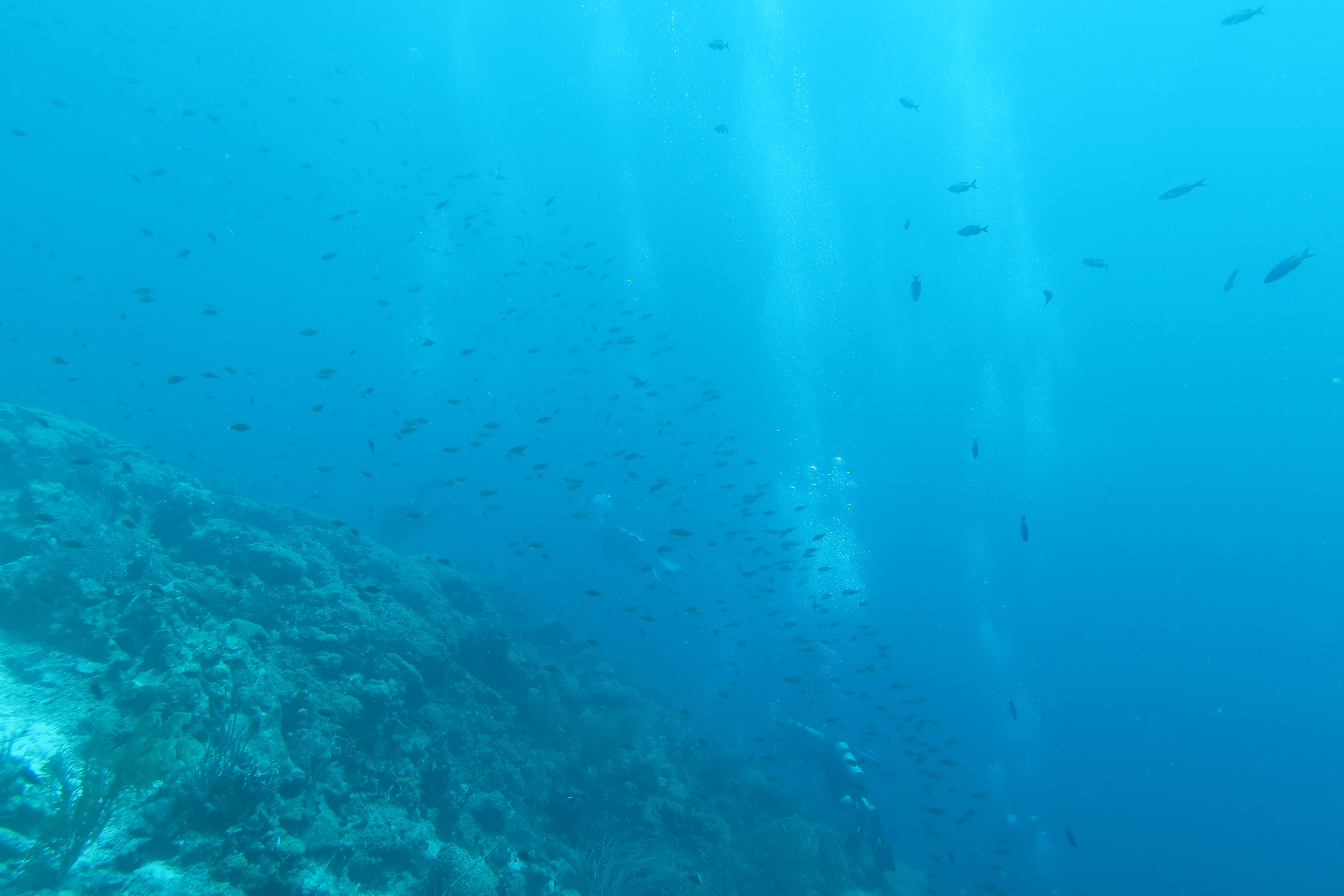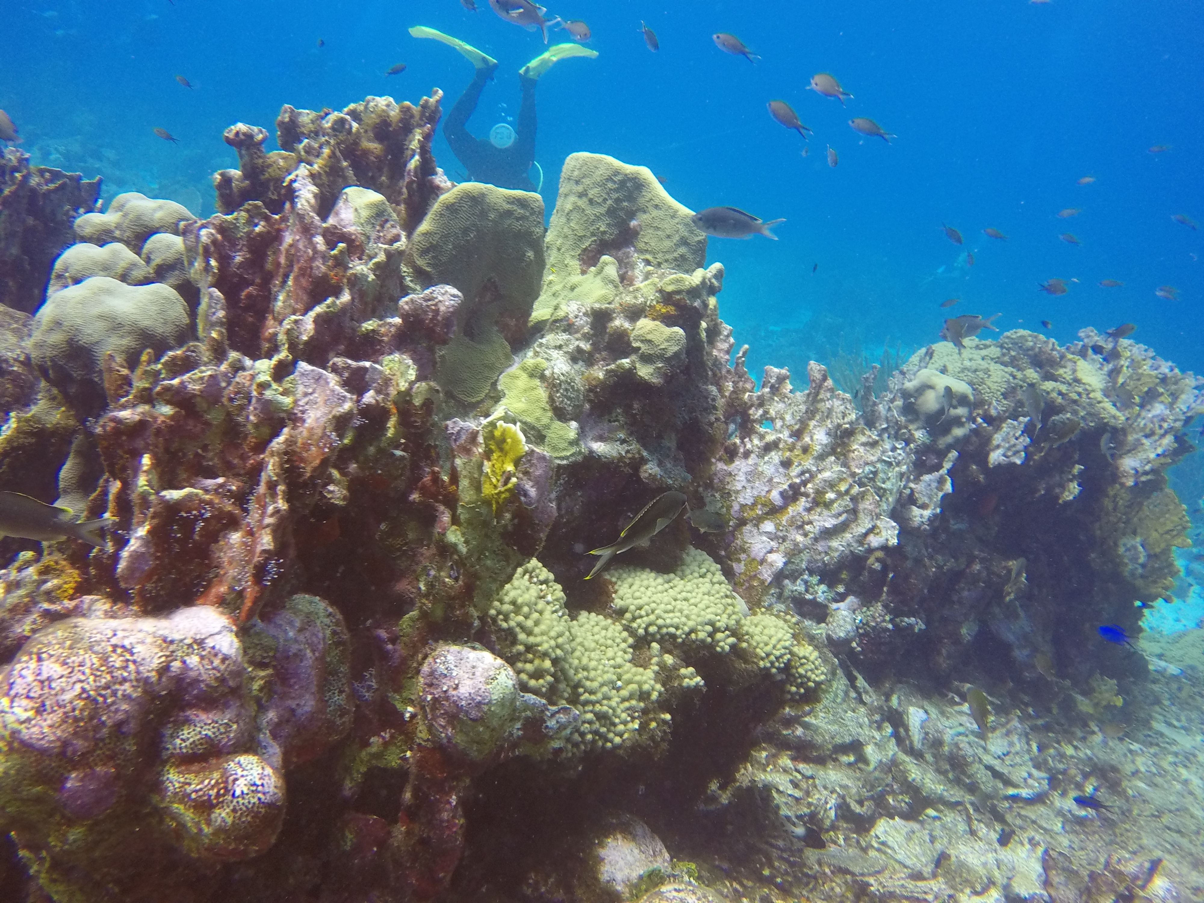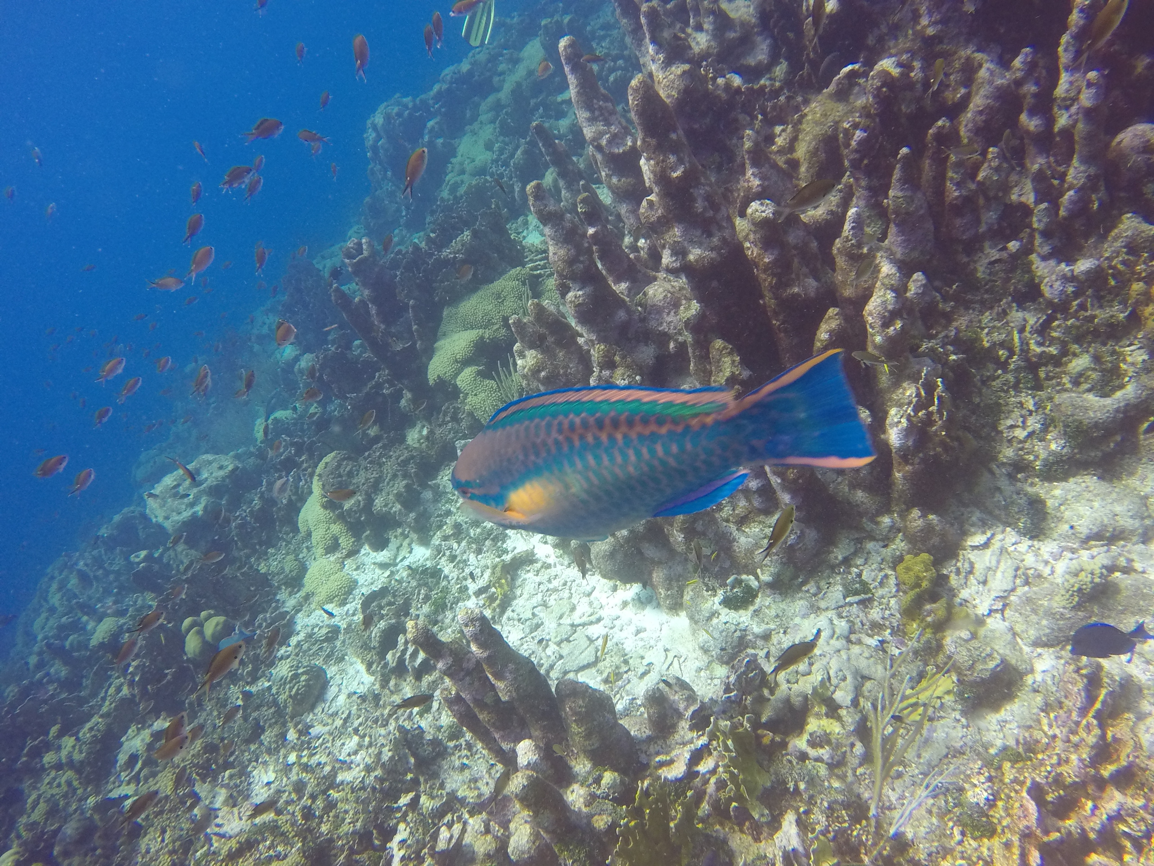 The first stop was Small Wall, which Alex said was his favorite. We swam up and then back down part of the wall. The coral looked very healthy here and we were pleasantly surprised at the number of different fish we saw. The boat took us back to Ocean Encounters for a short time and then we headed out for a second dive at Shipwreck Point. There you could see a few pieces of long lost ship parts, including a propeller and anchor. There used to be part of a ship as well, but has been moved to be part of the Underwater Aquarium.