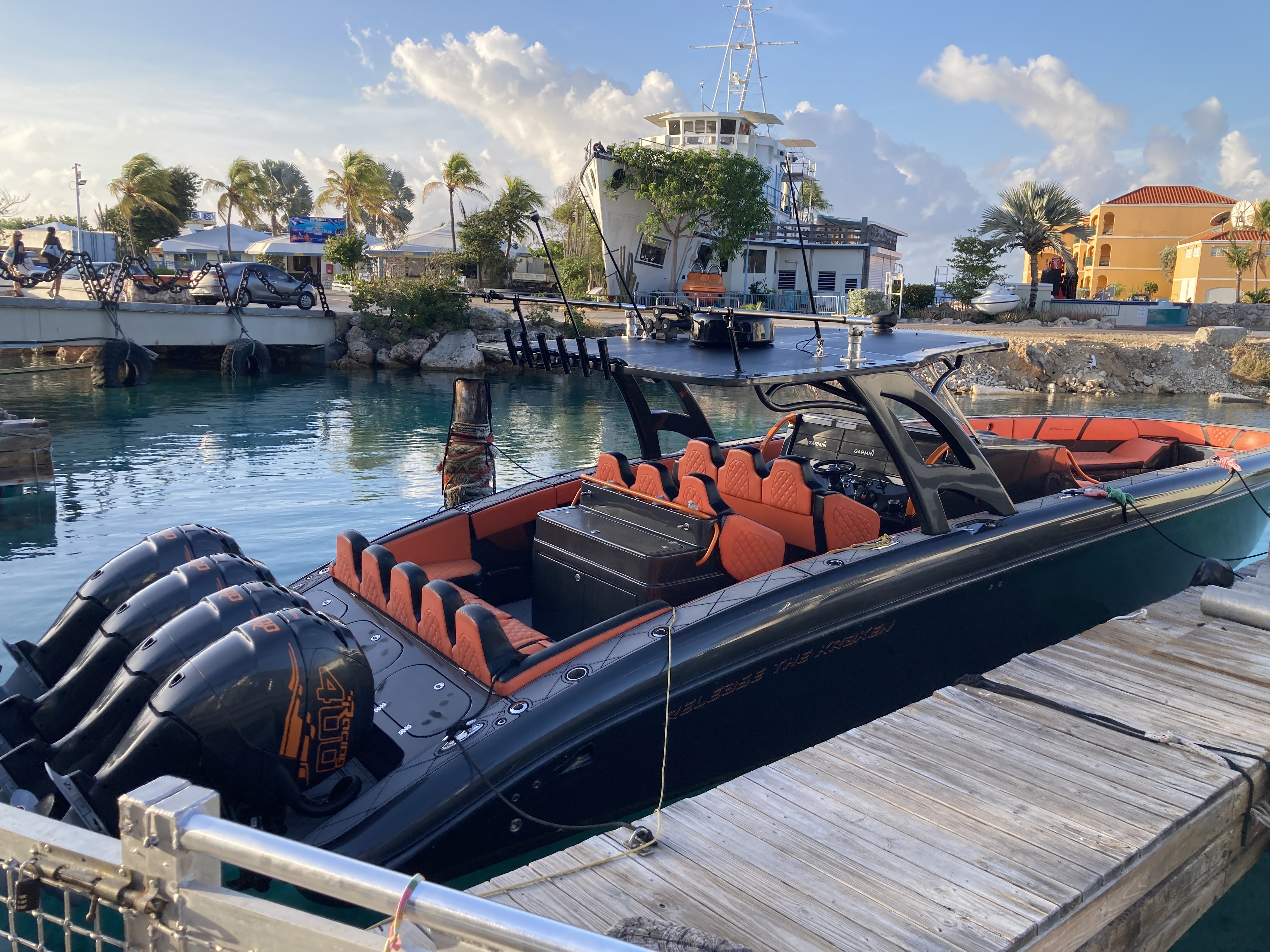Dive Day! We got up early - about 6:15, and had a breakfast of juice, yogurt & muesli that we'd bought earlier. We headed out around 7:15 and got there 25 minutes later. We are diving with Ocean Encounters, which is on the property of the resort called Lions Dive. They also offer an aquarium, snorkeling tours and other water activities. Arriving early gave us plenty of time to park, bring out gear down to the boats, check in and get our rental BCDs and regulators. The boat left promptly at 8:30 am and Alex and Anita were our dive masters, with Nas being our boat captain.