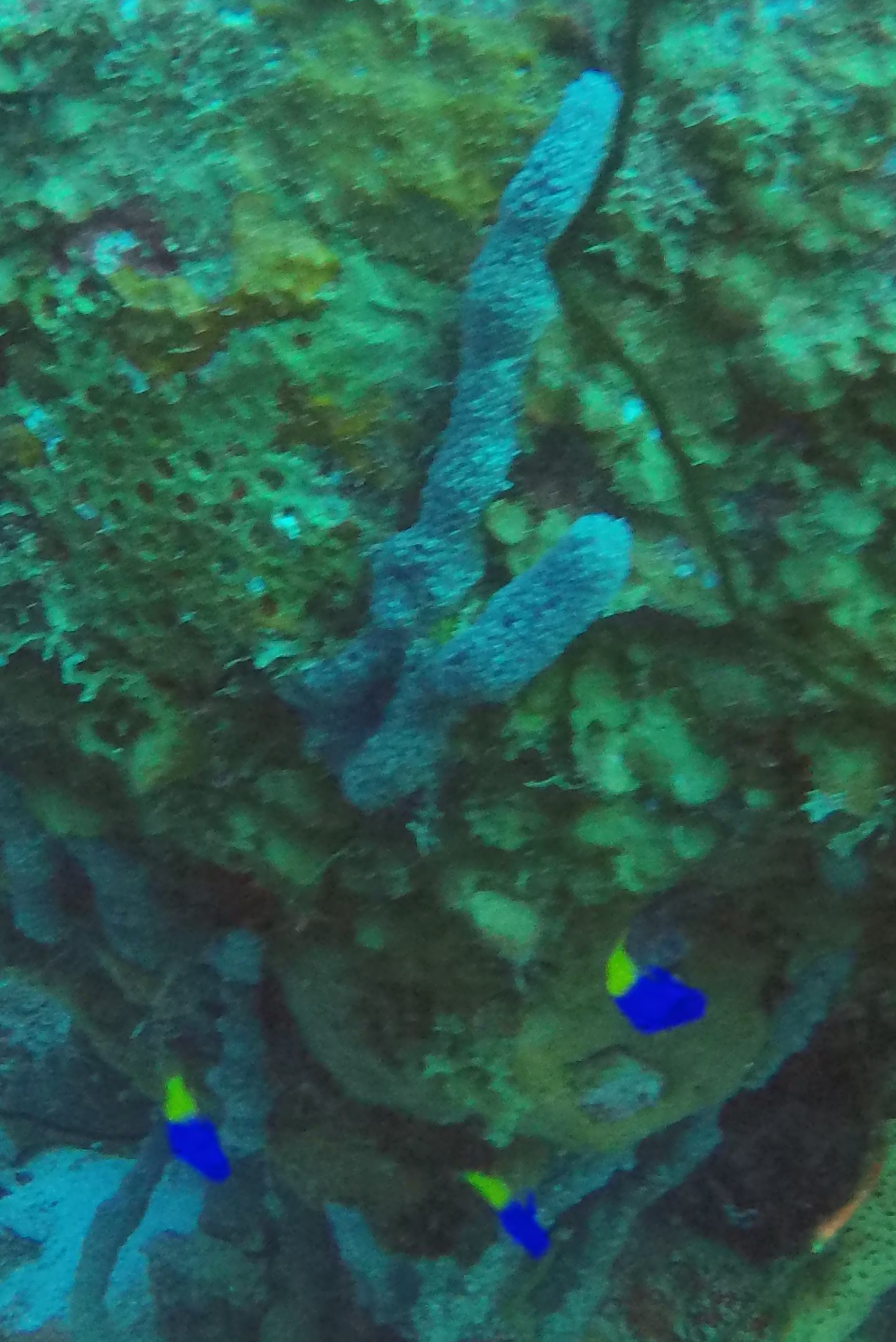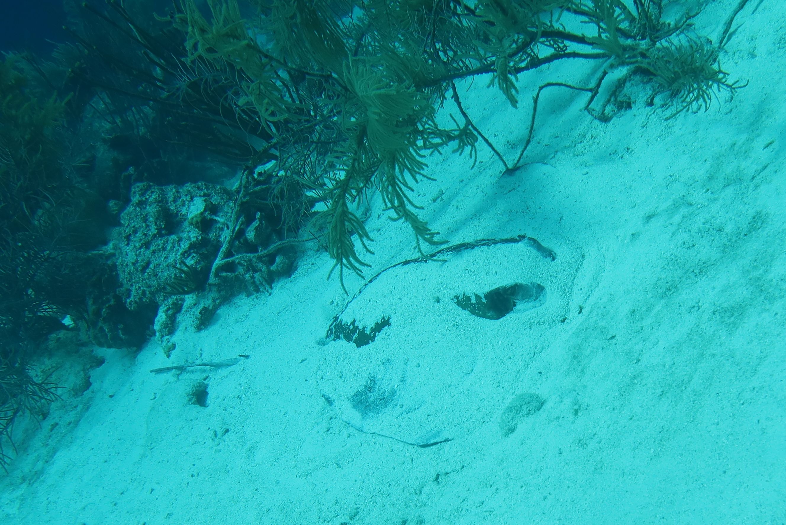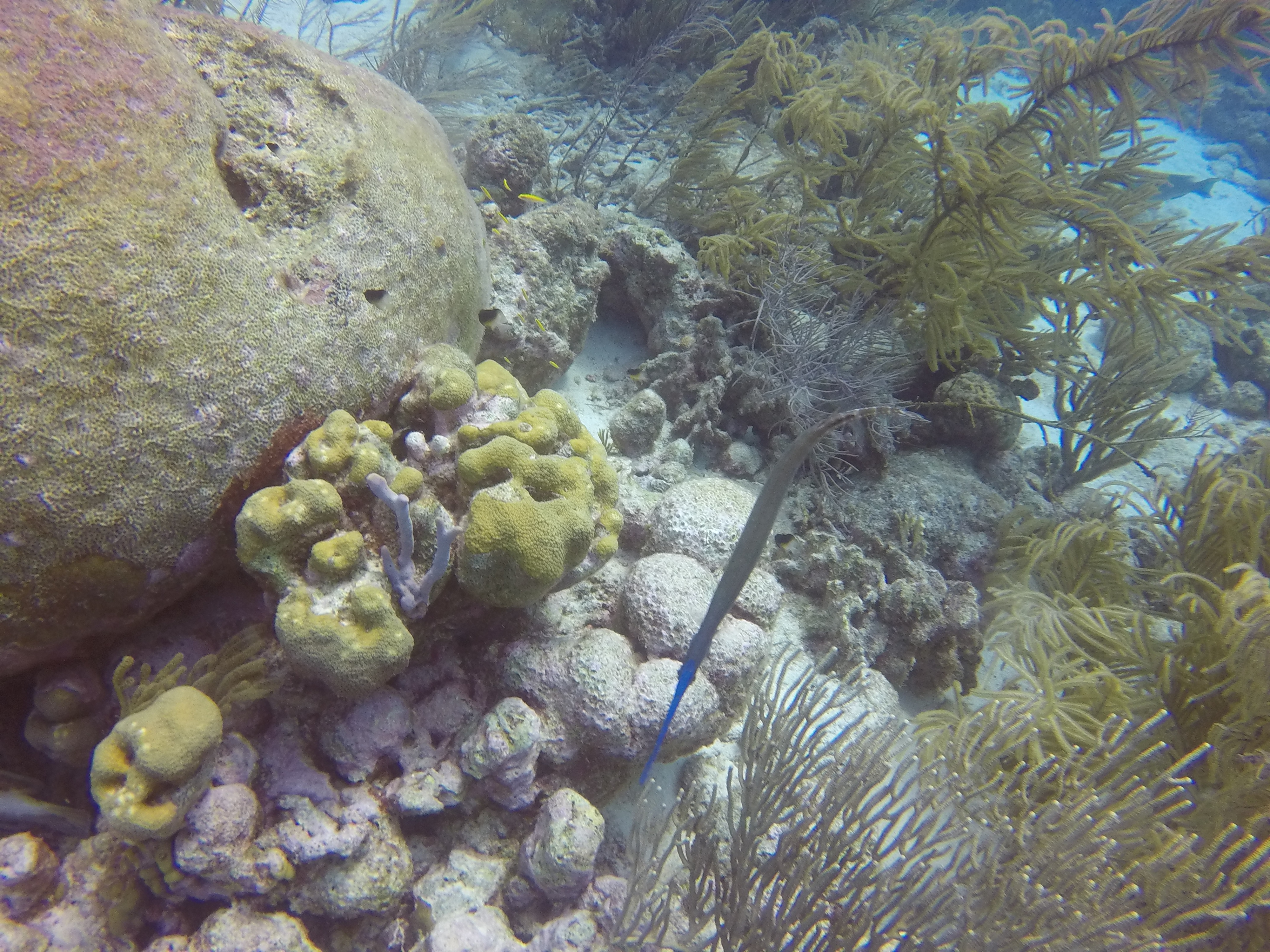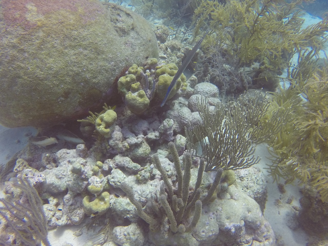 We had two dives - Smokey's and Newport. Both were near the south end of the island, beyond where anyone is settled, so the coral is healthy and underwater is pristine. The visibility this week has been OK - not the greatest, but you can still see quite a ways. There was rough water and extra wind last week that had everything stirred up. Today we saw a little bit of everything. Mike saw a red fish with white spots on both dives - he got a picture of it at one point but the DM couldn't ID it and it wasn't in the fish book. We also saw a very large southern sting ray that was resting on the bottom. It watched us all swim over it but didn't move. It was easily 6ish feet long but partially buried in the sand. That was quite the highlight. We also saw a Princess Triggerfish a ways off, a couple different adult drums, some Flamingo Tounges (snails), and the list goes on & on. Both dives had so much different life in them, they were really impressive. Back on shore, we had to go to the desk to get a partial refund from the night dive (as it was changed from a boat dive to shore dive) and we used the credit to buy lion-fish-fin earrings for Greta. That's now 87 dives for each of us.