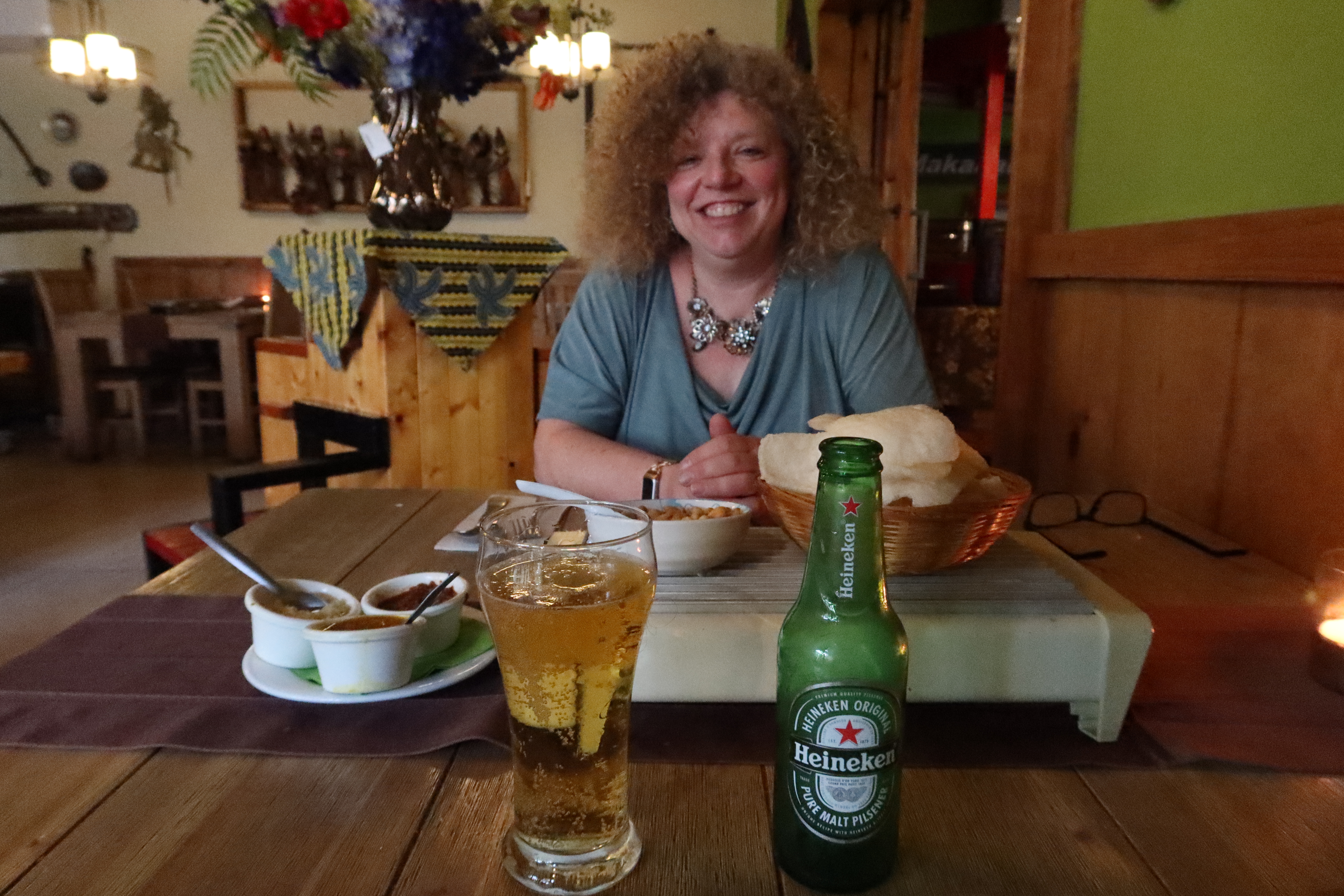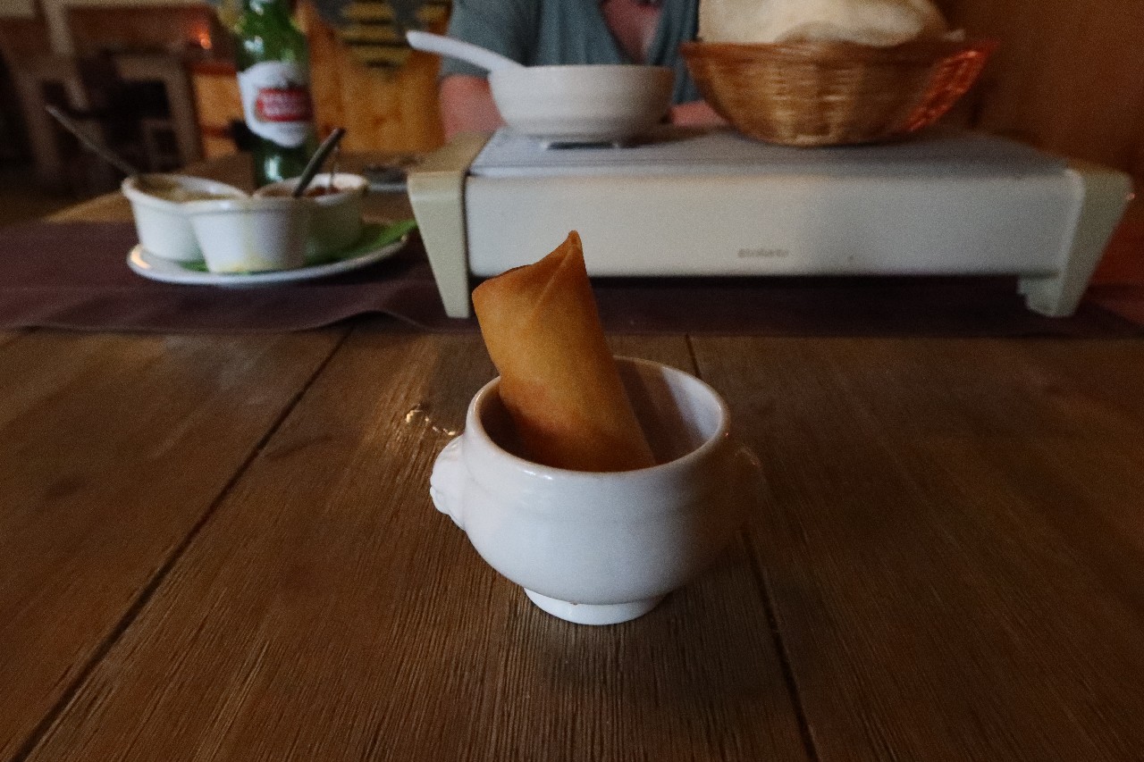 We then headed out for dinner at Batik Asli. We got there a bit early (6:15 for a 6:30 reservation) and it appeared empty. The host assured us it would be busy soon but we were surprised that no one else was there, especially since the restaurant is only open 5:30 - 8:30 pm. The host was very friendly, older Dutchman and he even made a joke about seating Greta but not Mike. There was a small appetizer - a fried roll in a small pot with sauce, and that was great start.