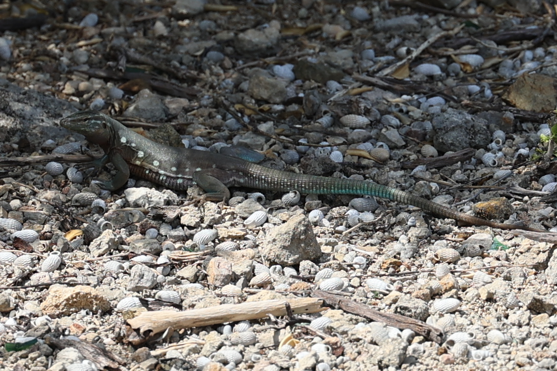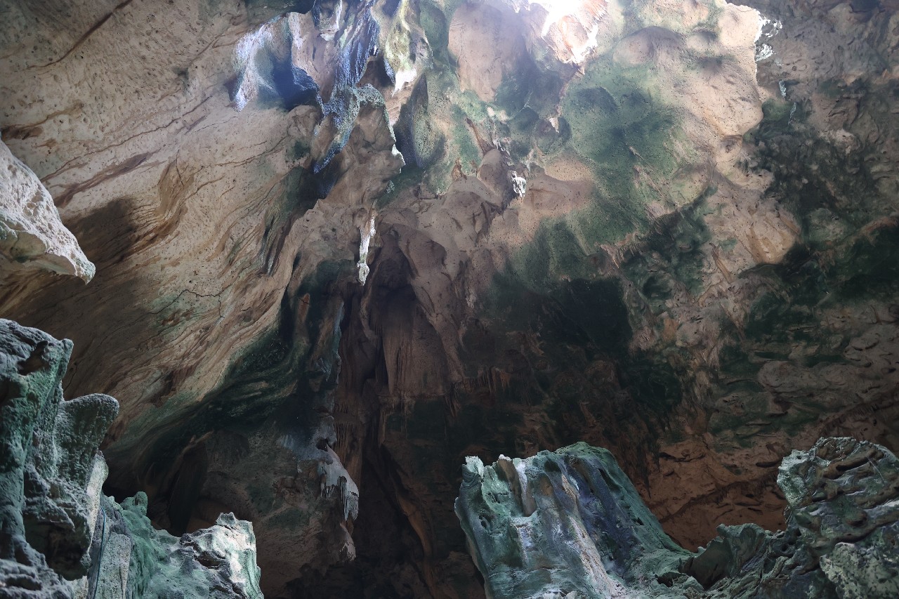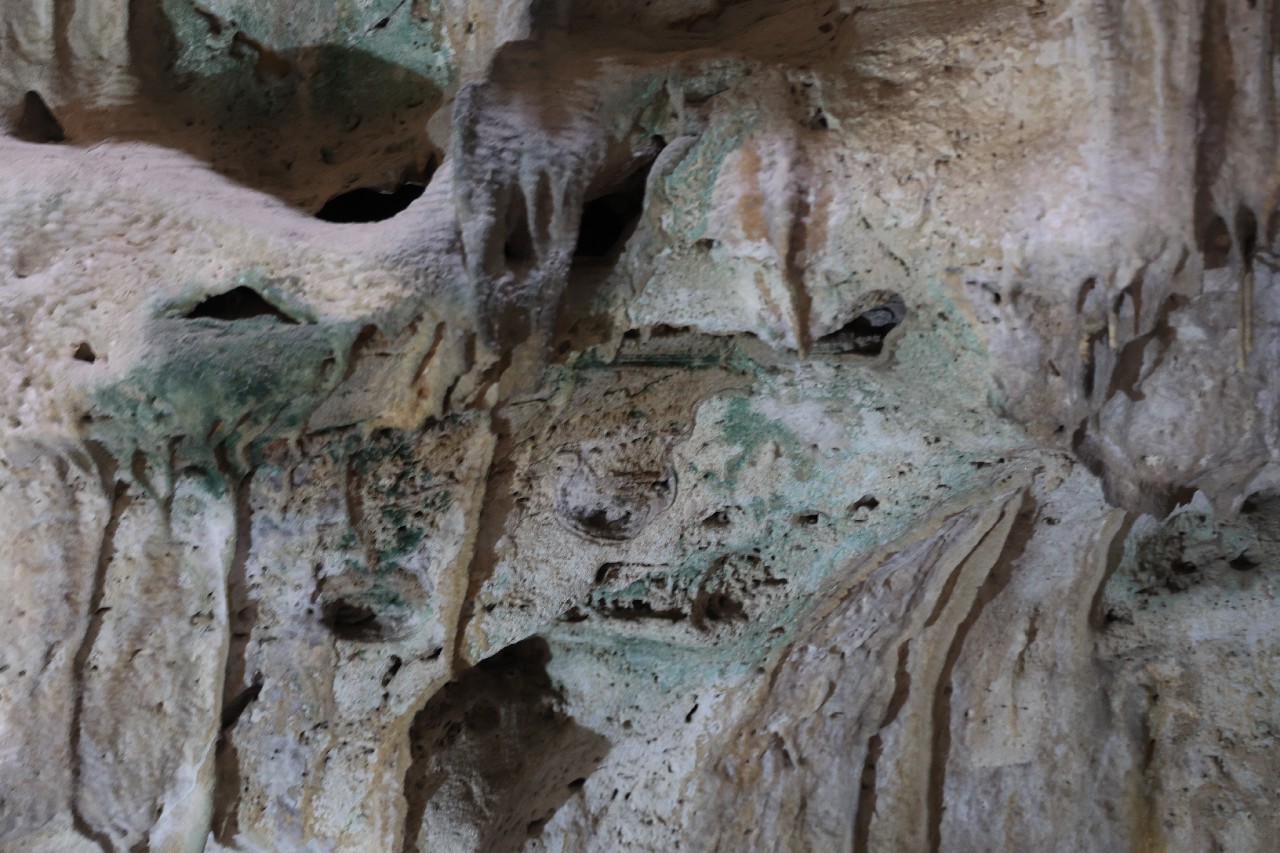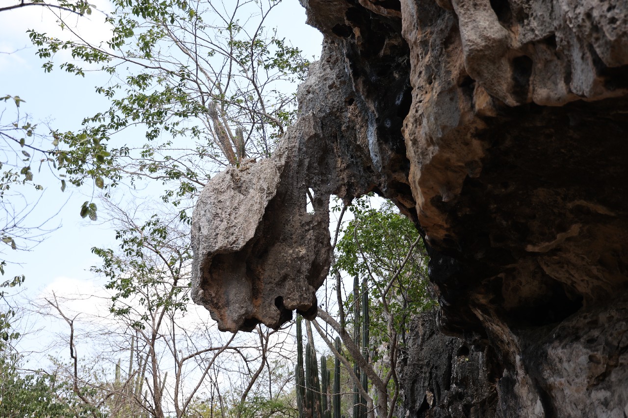 We bought tickets for the next tour and were fortunate that it was starting in 10 minutes. Right in front of the bathrooms we FINALLY got to see a big iguana. We've been surprised we haven't seen more of them, but this guy was beautiful. The tour started and we went up a number of steps to get in. Because it's all above ground, it's not as cool as underground caves we've toured before, and they had fans running throughout the tour to help with the ventilation. The cave itself is actually several miles long but the public tour is of course just a small part of that. Right after entering, we saw a colony of bats hanging from the ceiling, and sometimes we'd see one flit past. We walked through various "rooms" within the cave, including the "fantasy room" were the guide pointed out various rock formations that could be imagined to be something else, including a witch, a donkey and the Virgin Mary. It was very interesting and a very different view of the island than what we'd seen so far. Also including in the ticket price was a self-guided "Indian Walk". It was a nature trail with numbered markers next to various plants and rock formations, and you could download a guide that explain each item. After we got back to the car, we drove across the road, and were able to watch some planes taxiing after landing and took some pictures there as well.