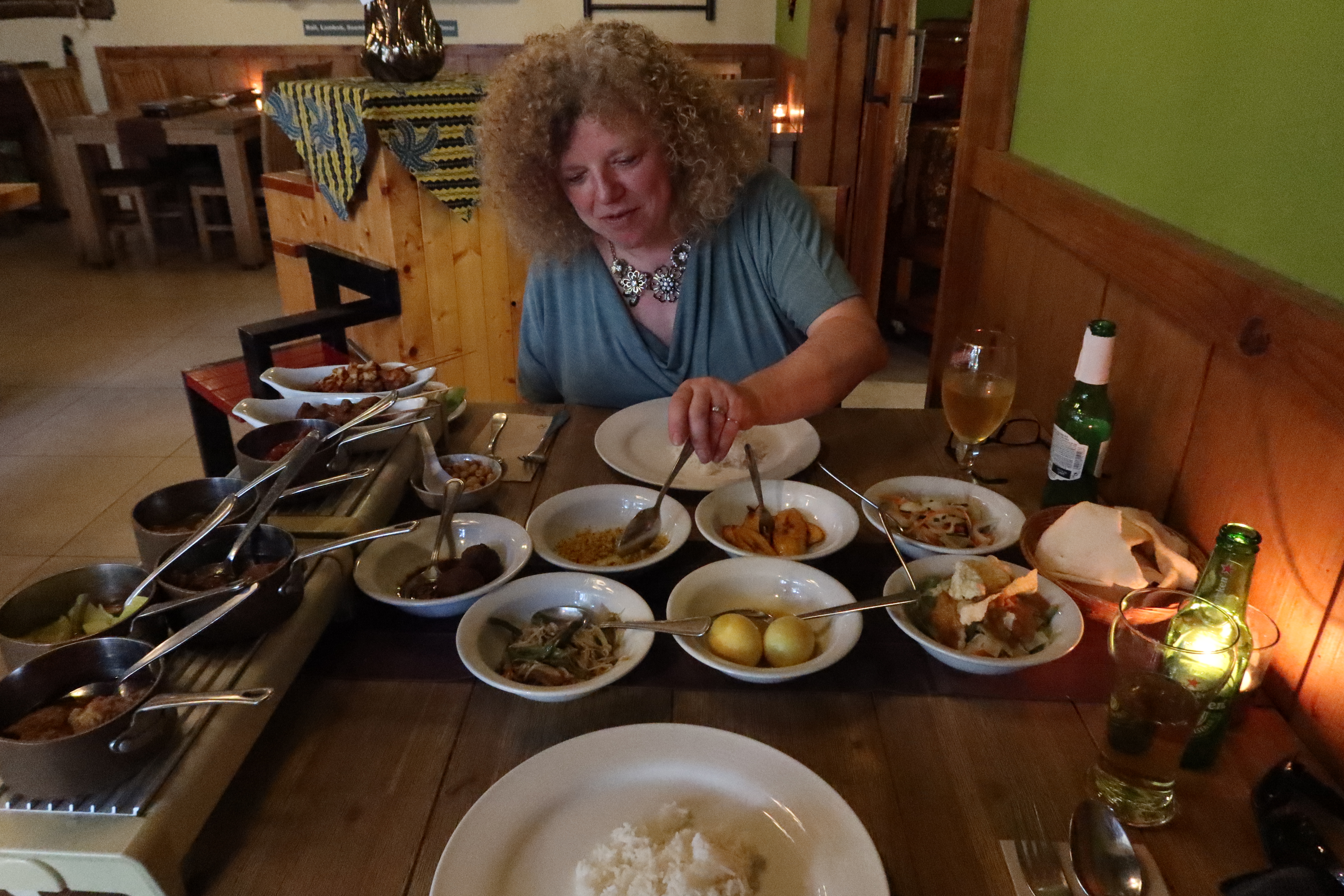 Then the rijsttafel came & it was amazing. There actually is a menu you could order specific dishes off of or just order rijsttafel for the number of people in your party. This translates to "rice table" and you basically are presented with your very own buffet. Many dishes were served all at once, some of them on heated tables. There was just so much to eat - it was incredible! The server served rice on each of our plates from a basket, and then we dug in. Two different skewers of meats. A couple of chicken dishes, a beef dish and a pork dish. Plus Gado Gado, sajur (vegetables) and more. There was a dried coconut and a dish of peanuts to sprinkle on top of your food. There were also three sauces: sambal, peanut sauce and a mango sauce. We couldn't finish it all but we tried our best. It was an amazing meal all around. With 4 beers, the entire meal came to $75 USD, which is incredible. The only disappointment was we had the waitress take a picture of us with all our food, but she must have not hit the right button on the camera; when we got back to the hotel, we realized the picture was not there. But all in all, that was the perfect way to spend for our last evening in Curacao.